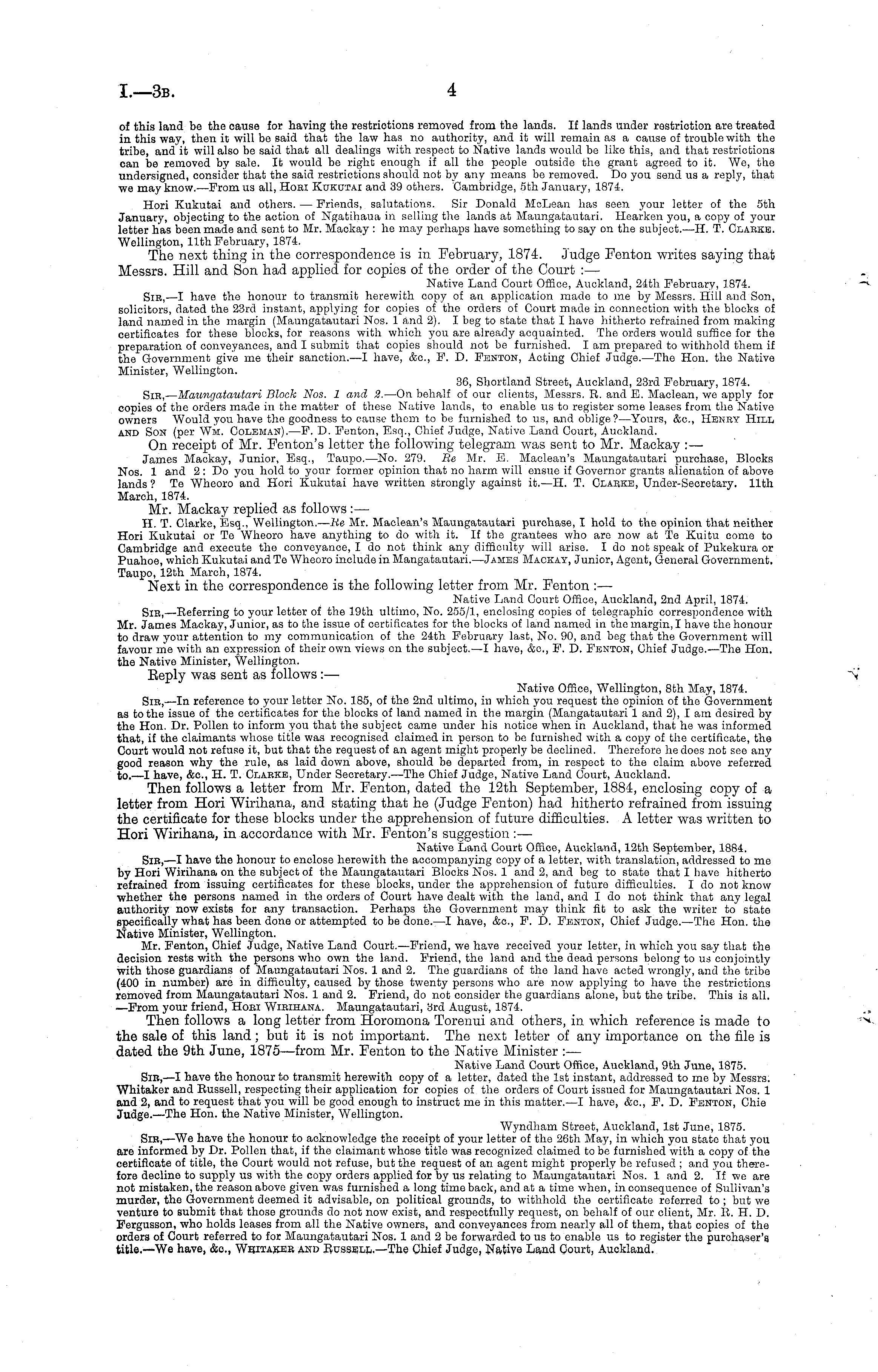 of this land be the cause for having the restrictions removed from the lands. If lands under restriction are treated in this way, then it will be said that the law has no authority, and it will remain as a cause of trouble with the tribe, and' it will also be said that all dealings with respect to Native lands would be like this, and that restrictions can be removed by sale. It would be right enough if all the people outside the grant agreed to it. We, the undersigned, consider that the said restrictions should not by any means be removed. Do you send us a reply, that we may know.—From us all, Horn Kukutai and 39 others. Cambridge, sth January, 1874. Hori Kukutai and others. — Friends, salutations. Sir Donald McLean has seen your letter of the sth January, objecting to the action of Ngatihaua in selling the lands at Maungatautari. Hearken you, a copy of your letter has been made and sent to Mr. Mackay : he may perhaps have something to say on the subject.—H. T. Clabke. Wellington, 11th February, 1874. The next thing in the correspondence is in February, 1874. Judge Fenton writes saying that Messrs. Hill and Son had applied for copies of the order of the Court :— Native Land Court Office, Auckland, 24th February, 1874. Sic, —I have the honour to transmit herewith copy of an application made to me by Messrs. Hill and Son, solicitors, dated the 23rd instant, applying for copies of the orders of Court made in connection with the blocks of land named in the margin (Maungatautari Nos. 1 and 2). I beg to state that I have hitherto refrained from making certificates for these blocks, for reasons with which you are already acquainted. The orders would suffice for the preparation of conveyances, and I submit that copies should not be furnished. lam prepared to withhold them if the Government give me their sanction. —I have, &c, F. D. Fenton, Acting Chief Judge.—The Hon. the Native Minister, Wellington. 36, Shortland Street, Auckland, 23rd February, 1874. Sic, — Maungatautari Block Nos. 1 and 2. —On behalf of our clients, Messrs. R. and E. Maclean, we apply for copies of the orders made in the matter of these Native lands, to enable us to register some leases from the Native owners Would you have the goodness to cause them to be furnished to us, and oblige?— Yours, &c, Henry Hill and Son (per Wm. Coleman). —F. D. Fenton, Esq., Chief Judge, Native Land Court, Auckland. On receipt of Mr. Fenton's letter the following telegram was sent to Mr. Mackay : — James Mackay, Junior, Esq., Taupo.—No. 279. lie Mr. E. Maclean's Maungatautari purchase, Blocks Nos. 1 and 2 : Do you hold to your former opinion that no harm will ensue if Governor grants alienation of above lands ? Te Wheoro and Hori Kukutai have written strongly against it.—H. T. Clabke, Under-Secretary. 11th March, 1874. Mr. Mackay replied as follows : — H. T. Clarke, Esq., Wellington.— He Mr. Maclean's Maungatautari purchase, I hold to the opinion that neither Hori Kukutai or Te Wheoro have anything to do with it. If the grantees who are now at Te Kuitu come to Cambridge and execute the conveyance, I do not think any difficulty will arise. I do not speak of Pukekura or Puahoe, which Kukutai and Te Wheoro include in Mangatautari.—James Mackay, Junior, Agent, General Government. Taupo, 12th March, 1874. Next in the correspondence is the following letter from Mr. Fenton : —■ Native Land Court Office, Auckland, 2nd April, 1874. Sic, —Referring to your letter of the 19th ultimo, No. 255/1, enclosing copies of telegraphic correspondence with Mr. James Mackay, Junior, as to the issue of certificates for the blocks of land named in the margin, I have the honour to draw your attention to my communication of the 24th February last, No. 90, and beg that the Government will favour me with an expression of their own views on the subject.—l have, &c, F. D. Fenton, Chief Judge.—The Hon. the Native Minister, Wellington. Eeply was sent as follows :— Native Office, Wellington, Bth May, 1874. Sic, —In reference to your letter No. 185, of the 2nd ultimo, in which you request the opinion of tho Government as to the issue of the certificates for the blocks of land named in the margin (Mangatautari 1 and 2), I am desired by the Hon. Dr. Pollen to inform you that the subject came under his notice when in Auckland, that he was informed that, if the claimants whose title was recognised claimed in person to be furnished with a copy of the certificate, the Court would not refuse it, but that the request of an agent might properly be declined. Therefore he does not see any good reason why the rule, as laid down above, should be departed from, in respect to the claim above referred to. —I have, &c, H. T. Claeke, Under Secretary.—The Chief Judge, Native Land Court, Auckland. Then follows a letter from Mr. Fenton, dated the 12th September, 1884, enclosing copy of a letter from Hori Wirihana, and stating that he (Judge Fenton) had hitherto refrained from issuing the certificate for these blocks under the apprehension of future difficulties. A letter was written to Hori Wirihana, in accordance with Mr. Fenton's suggestion : — Native Land Court Office, Auckland, 12th September, 1884. Sic, —I have the honour to enclose herewith the accompanying copy of a letter, with translation, addressed to me by Hori Wirihana on the subject of the Maungatautari Blocks Nos. 1 and 2, and beg to state that I have hitherto refrained from issuing certificates for these blocks, under the apprehension of futuro difficulties. I do not know whether the persons named in the orders of Court have dealt with the land, and I do not think that any legal authority now exists for any transaction. Perhaps the Government may think fit to ask the writer to state specifically what has been done or attempted to be done. —I have, &c, F. D. Fenton, Chief Judge.—The Hon. the Native Minister, Wellington. Mr. Fenton, Chief Judge, Native Land Court. —Friend, we h