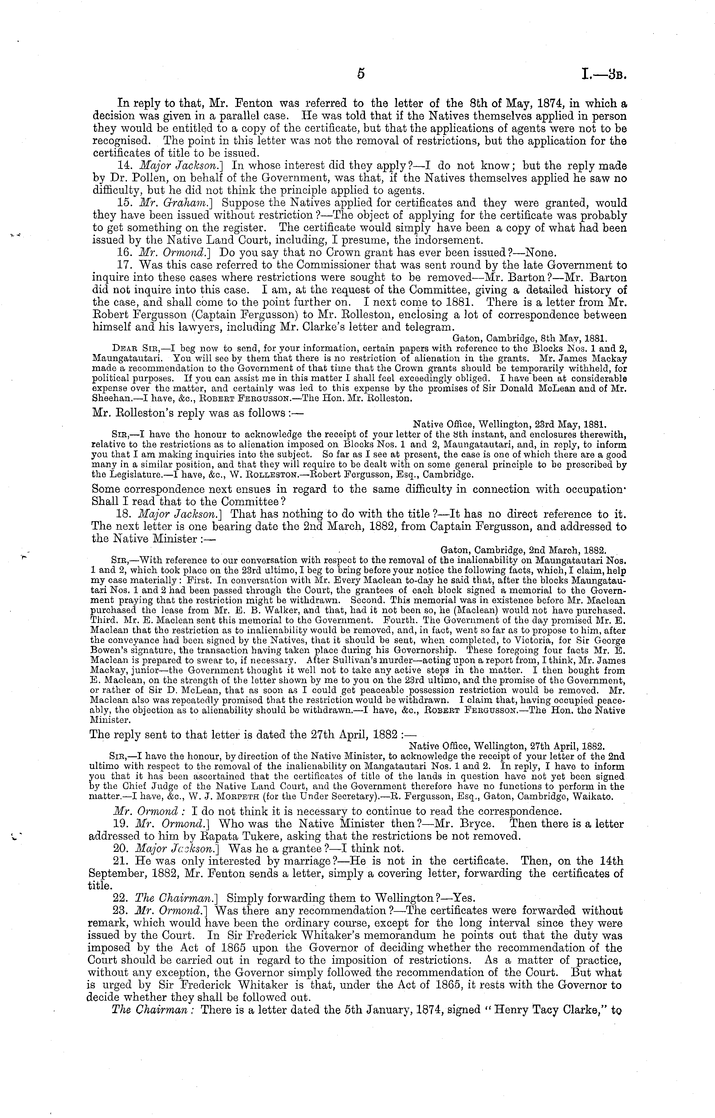 In reply to that, Mr. Fenton was referred to the letter of the Bth of May, 1874, in which a decision was given in a parallel case. He was told that if the Natives themselves applied in person they would be entitled to a copy of the certificate, but that the applications of agents were not to be recognised. The point in this letter was not the removal of restrictions, but the application for the certificates of title to be issued. 14. Major Jackson] In whose interest did they apply ?—I do not know; but the reply made by Dr. Pollen, on behalf of the Government, was that, if the Natives themselves applied he saw no difficulty, but he did not think the principle applied to agents. 15. Mr. Graham] Suppose the Natives applied for certificates and they were granted, would they have been issued without restriction ? —The object of applying for the certificate was probably to get something on the register. The certificate would simply have been a copy of what had been issued by the Native Land Court, including, I presume, the indorsement. 16. Mr. Ormond.] Do you say that no Crown grant has ever been issued?— None. 17. Was this case referred to the Commissioner that was sent round by the late Government to inquire into these cases where restrictions were sought to be removed —Mr. Barton ?—Mr. Barton did not inquire into this case. I am, at the request of the Committee, giving a detailed history of the case, and shall come to the point further on. I next come to 1881. There is a letter from Mr. Eobert Fergusson (Captain Fergusson) to Mr. Eolleston, enclosing a lot of correspondence between himself and his lawyers, including Mr. Clarke's letter and telegram. Gaton, Cambridge, Bth May, 1881. Deae Sib, —I beg now to send, for your information, certain papers with reference to the Blocks Nos. 1 and 2, Maungatautari. You will see by them that there is no restriction of alienation in the grants. Mr. James Mackay made a recommendation to the Government of that time that the Crown grants should be temporarily withheld, for political purposes. If you can assist me in this matter I shall feel exceedingly obliged. I have been at considerable expense over the matter, and certainly was led to this expense by the promises of Sir Donald McLean and of Mr. Sheehan.—l have, &c, Robert Febgusson.—The Hon. Mr. Rolleston. Mr. Eolleston's reply was as follows ; — Native Office, Wellington, 23rd May, 1881. Sib, —I have the honour to acknowledge the receipt of your letter of the Bth instant, and enclosures therewith, relative to the restrictions as to alienation imposed on Blocks Nos. 1 and 2, Maungatautari, and, in reply, to inform you that lam making inquiries into the subject. So far as I see at present, the case is one of which there are a good many in a similar position, and that they will require to be dealt with on some general principle to be prescribed by the Legislature.—l have, &c, W. Rolleston. —Robert Fergusson, Esq., Cambridge. Some correspondence next ensues in regard to the same difficulty in connection with occupationShall I read that to the Committee ? 18. Major Jackson.] That has nothing to do with the title ?—lt has no direct reference to it. The next letter is one bearing date the 2nd March, 1882, from Captain Fergusson, and addressed to the Native Minister :— Gaton, Cambridge, 2nd March, 1882. Sic, —With reference to our conversation with respect to the removal of the inalienability on Maungatautari Nos. 1 and 2, which took place on the 23rd ultimo, I beg to bring before your notice the following facts, which, I claim, help my case materially : First. In conversation with Mr. Every Maclean to-day he said that, after the blocks Maungatautari Nos. 1 and 2 had been passed through the Court, the grantees of each block signed a memorial to the Government praying that the restriction might be withdrawn. Second. This memorial was in existence before Mr. Maclean purchased the lease from Mr. E. B. Walker, and that, had it not been so, he (Maclean) would not have purchased. Third. Mr. E. Maclean sent this memorial to the Government. Fourth. The Government of the day promised Mr. E. Maclean that the restriction as to inalienability would be removed, and, in fact, went so far as to propose to him, after the conveyance had been signed by the Natives, that it should be sent, when completed, to Victoria, for Sir George Bowen's signature, the transaction having taken place during his Governorship. These foregoing four facts Mr. E. Maclean is prepared to swear to, if necessary. After Sullivan's murder—acting upon a report from, I think, Mr. James Mackay, junior—the Government thought it well not to take any active steps in the matter. I then bought from E. Maclean, on the strength of the letter shown by me to you on the 23rd ultimo, and tho promise of the Government, or rather of Sir D. McLean, that as soon as I could get peaceable possession restriction would be removed. Mr. Maclean also was repeatedly promised that the restriction would be withdrawn. I claim that, having occupied peaceably, the objection as to alienability should be withdrawn. —I have, &c, Robeet Febgusson.—The Hon. the Native Minister. / The reply sent to that letter is dated the 27th April, 1882 : — Native Office, Wellington, 27th April, 1882. Sic, —I have the honour, by direction of the Native Minister, to acknowledge the receipt of your letter of the 2nd ultimo with respect to the removal of the inalienability on Mangatautari Nos. 1 and 2. In reply, I have to inform you that it has been ascertained that the certificates of title of the lands in question have not yet been signed by the Chief Judge of the Native Land Court, and the Government therefore have no functions to perform in the matter.—l have, &c, W. J. Mobpeth (for the Under Secretary).—R. Fergusson, Esq., Gaton, Cambridge, Waikato. Mr. Ormond : I do not think it is necessary to continue to read the correspondence. 19. Mr. Ormond.] Who was 