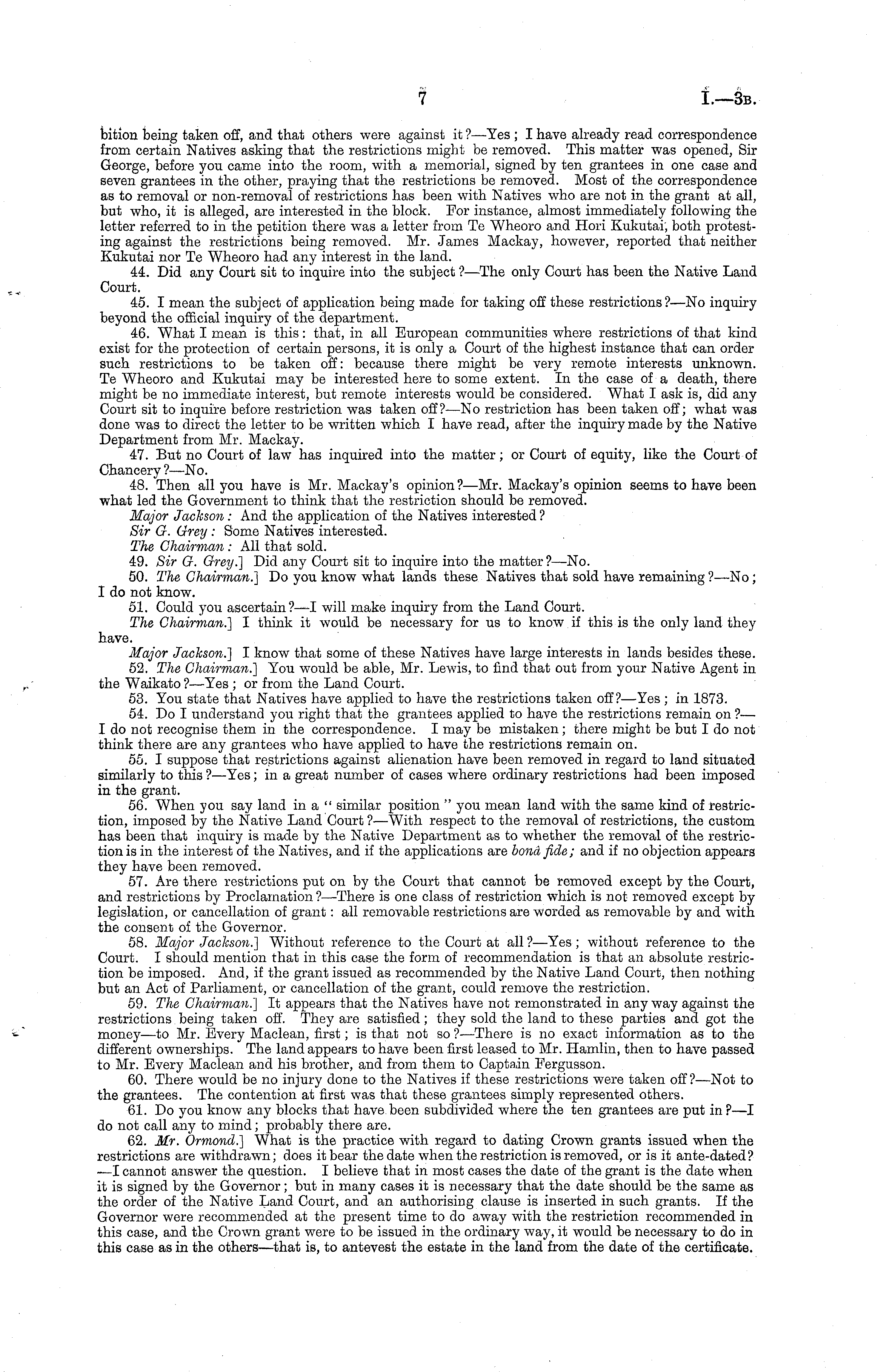 bition being taken off, and that others were against it ? —Yes ; I have already read correspondence from certain Natives asking that the restrictions might be removed. This matter was opened, Sir George, before you came into the room, with a memorial, signed by ten grantees in one case and seven grantees in the other, praying that the restrictions be removed. Most of the correspondence as to removal or non-removal of restrictions has been with Natives who are not in the grant at all, but who, it is alleged, are interested in the block. For instance, almost immediately following the letter referred to in the petition there was a letter from Te Wheoro and Hori Kukutai, both protesting against the restrictions being removed. Mr. James Mackay, however, reported that neither Kukutai nor Te Wheoro had any interest in the land. 44. Did any Court sit to inquire into the subject ?—The only Court has been the Native Land Court. 45. I mean the subject of application being made for taking off these restrictions?—No inquiry beyond the official inquiry of the department. 46. What I mean is this: that, in all European communities where restrictions of that kind exist for the protection of certain persons, it is only a Court of the highest instance that can order such restrictions to be taken off: because there might be very remote interests unknown. Te Wheoro and Kukutai may be interested here to some extent. In the case of a death, there might be no immediate interest, but remote interests would be considered. What I ask is, did any Court sit to inquire before restriction was taken off?—No restriction has been taken off; what was done was to direct the letter to be written which I have read, after the inquiry made by the Native Department from Mr. Mackay. 47. But no Court of law has inquired into the matter; or Court of equity, like the Court of Chancery ?—No. 48. Then all you have is Mr. Mackay's opinion?— Mr. Mackay's opinion seems to have been what led the Government to think that the restriction should be removed. Major Jackson : And the application of the Natives interested ? Sir G. Grey : Some Natives interested. The Chairman : All that sold. 49. Sir G. Grey.] Did any Court sit to inquire into the matter?— No. 50. The Chairman.] Do you know what lands these Natives that sold have remaining ?—No; I do not know. 51. Could you ascertain ?—_ will make inquiry from the Land Court. The Chairman.] I think it would be necessary for us to know if this is the only land they have. Major Jackson.] I know that some of these Natives have large interests in lands besides these. 52. The Chairman.] You would be able, Mr. Lewis, to find that out from your Native Agent in the Waikato ?■ —Yes ; or from the Land Court. 53. You state that Natives have applied to have the restrictions taken off?— Yes ; in 1873. 54. Do I understand you right that the grantees applied to have the restrictions remain on ?— Ido not recognise them in the correspondence. I may be mistaken; there might be but Ido not think there are any grantees who have applied to have the restrictions remain on. 55. I suppose that restrictions against alienation have been removed in regard to land situated similarly to this ?—Yes; in a great number of cases where ordinary restrictions had been imposed in the grant. 56. When you say land in a " similar position " you mean land with the same kind of restriction, imposed by the Native Land Court ?—With respect to the removal of restrictions, the custom has been that inquiry is made by the Native Department as to whether the removal of the restriction is in the interest of the Natives, and if the applications are bond fide; and if no objection appears they have been removed. 57. Are there restrictions put on by the Court that cannot be removed except by the Court, and restrictions by Proclamation?— There is one class of restriction which is not removed except by legislation, or cancellation of grant : all removable restrictions are worded as removable by and with the consent of the Governor. 58. Major Jackson.] Without reference to the Court at all ?—Yes; without reference to the Court. I should mention that in this case the form of recommendation is that an absolute restriction be imposed. And, if the grant issued as recommended by the Native Land Court, then nothing but an Act of Parliament, or cancellation of the grant, could remove the restriction. 59. The Chairman.] It appears that the Natives have not remonstrated in any way against the restrictions being taken off. They are satisfied; they sold the land to these parties and got the money—to Mr. Every Maclean, first; is that not so ?—There is no exact information as to the different ownerships. The land appears to have been first leased to Mr. Hamlin, then to have passed to Mr. Every Maclean and his brother, and from them to Captain Fergusson. 60. There would be no injury done to the Natives if these restrictions were taken off ?—Not to the grantees. The contention at first was that these grantees simply represented others. 61. Do you know any blocks that have been subdivided where the ten grantees are put in?—l do not call any to mind; probably there are. 62. Mr. Ormond.] What is the practice with regard to dating Crown grants issued when the restrictions are withdrawn; does it bear the date when the restriction is removed, or is it ante-dated? —I cannot answer the question. I believe that in most cases the date of the grant is the date when it is signed by the Governor; but in many cases it is necessary that the date should be the same as the order of the Native Land Court, and an authorising clause is inserted in such grants. If the Governor were recommended at the present time to do away with the restriction recommended in this case, and the Crown grant were to be issued in the ordinary way, it would be necessary to do in this case as in the others—that is, to antevest the estate in the land from the date