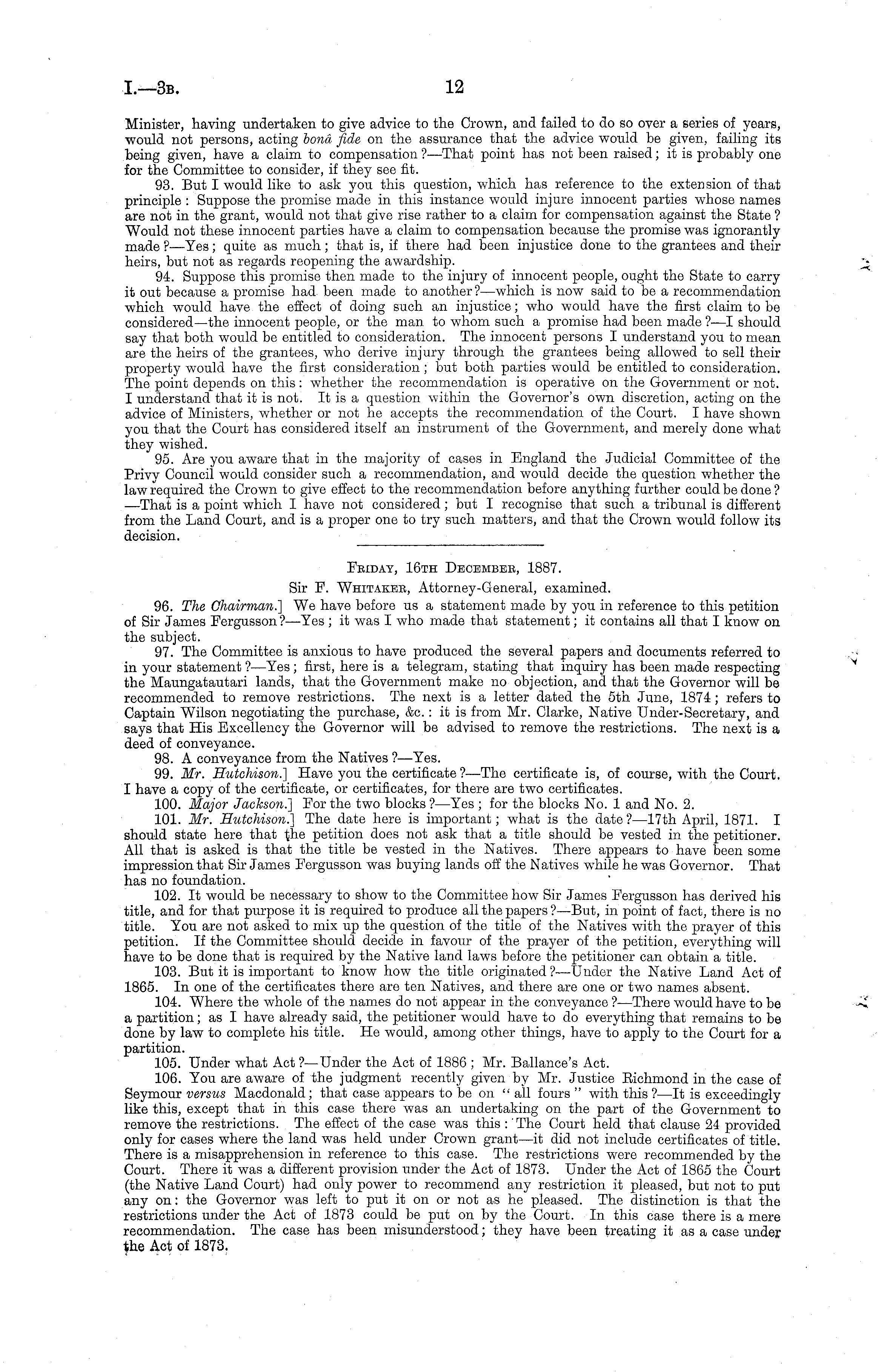 Friday, 16th December, 1887. Sir F. Whitaker, Attorney-General, examined. 96. The Chairman] We have before us a statement made by you in reference to this petition of Sir James Fergusson ? —Yes ;it was I who made that statement; it contains all that I know on the subject. 97. The Committee is anxious to have produced the several papers and documents referred to in your statement ?—Yes ; first, here is a telegram, stating that inquiry has been made respecting the Maungatautari lands, that the Government make no objection, and that the Governor will be recommended to remove restrictions. The next is a letter dated the sth June, 1874; refers to Captain Wilson negotiating the purchase, &c.: it is from Mr. Clarke, Native Under-Secretary, and says that His Excellency the Governor will be advised to remove the restrictions. The next is a deed of conveyance. 98. A conveyance from the Natives ?—Yes. 99. Mr. Hutchison] Have you the certificate?— The certificate is, of course, with the Court. I have a copy of the certificate, or certificates, for there are two certificates. 100. Major Jackson.] For the two blocks ?—Yes ; for the blocks No. 1 and No. 2. 101. Mr. Hutchison.] The date here is important; what is the date?—l7th April, 1871. I should state here that the petition does not ask that a title should be vested in the petitioner. All that is asked is that the title be vested in the Natives. There appears to have been some impression that Sir James Fergusson was buying lands off the Natives while he was Governor. That has no foundation. 102. It would be necessary to show to the Committee how Sir James Fergusson has derived his title, and for that purpose it is required to produce all the papers ?—But, in point of fact, there is no title. You are not asked to mix up the question of the title of the Natives with the prayer of this petition. If the Committee should decide in favour of the prayer of the petition, everything will have to be done that is required by the Native land laws before the petitioner can obtain a title. 103. But it is important to know how the title originated ?—Under the Native Land Act of 1865. In one of the certificates there are ten Natives, and there are one or two names absent. 104. Where the whole of the names do not appear in the conveyance ? —There would have to be a partition; as I have already said, the petitioner would have to do everything that remains to be done by law to complete his title. He would, among other things, have to apply to the Court for a partition. 105. Under what Act ?—Under the Act of 1886 ; Mr. Ballance's Act. 106. You are aware of the judgment recently given by Mr. Justice Eichmond in the case of Seymour versus Macdonald; that case appears to be on " all fours " with this ?—lt is exceedingly like this, except that in this case there was an undertaking on the part of the Government to remove the restrictions. The effect of the case was this : The Court held that clause 24 provided only for cases where the land was held under Crown grant—it did not include certificates of title. There is a misapprehension in reference to this case. The restrictions were recommended by the Court. There it was a different provision under the Act of 1873. Under the Act of 1865 the Court (the Native Land Court) had only power to recommend any restriction it pleased, but not to put any on: the Governor was left to put it on or not as he pleased. The distinction is that the restrictions under the Act of 1873 could be put on by the Court. In this case there is a mere recommendation. The case has been misunderstood; they have been treating it as a case under the Act of 1873.
