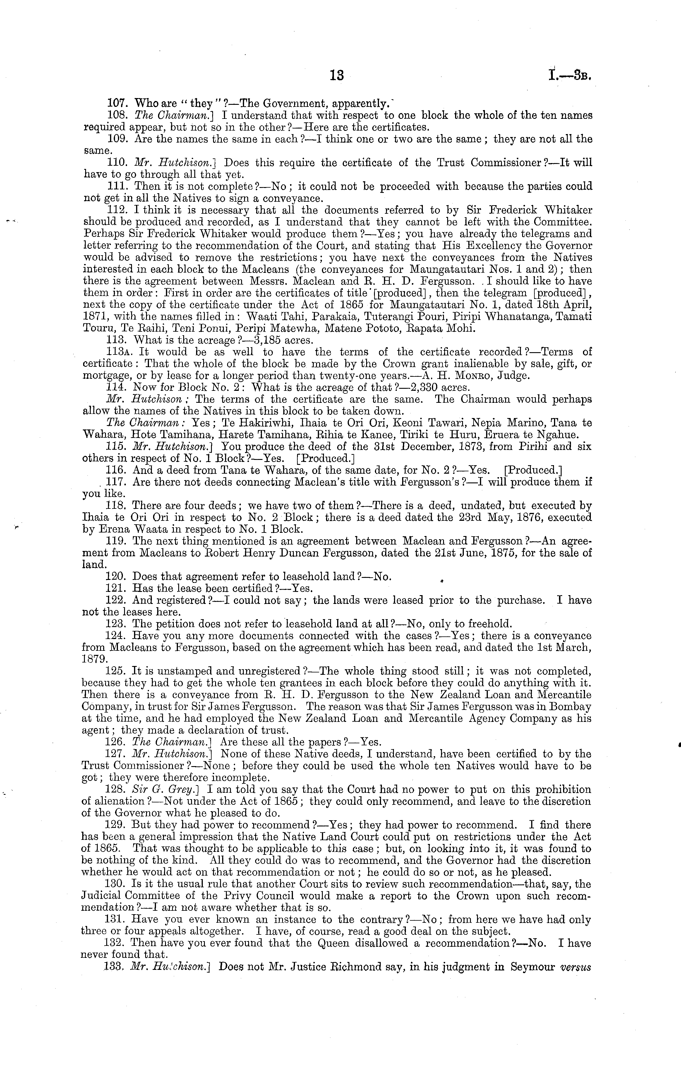107. Who are " they " ?—The Government, apparently." 108. The Chairman.] I understand that with respect to one block the whole of the ten names required appear, but hot so in the other?— Here are the certificates. 109. Are the names the same in each ?—I think one or two are the same ; they are not all the same. 110. Mr. Hutchison.] Does this require the certificate of the Trust Commissioner ?—lt will have to go through all that yet. 111. Then it is not complete?—No ;it could not be proceeded with because the parties could not get in all the Natives to sign a conveyance. 112. I think it is necessary that all the documents referred to by Sir Frederick Whitaker should be produced and recorded, as I understand that they cannot be left with the Committee. Perhaps Sir Frederick Whitaker would produce them ? —Yes; you have already the telegrams and letter referring to the recommendation of the Court, and stating that His Excellency the Governor would be advised to remove the restrictions; you have next the conveyances from the Natives interested in each block to the Macleans (the conveyances for Maungatautari Nos. 1 and 2); then there is the agreement between Messrs. Maclean and E. H. D. Fergusson. I should like to have them in order : First in order are the certificates of title' [produced], then the telegram [produced], next the copy of the certificate under the Act of 1865 for Maungatautari No. 1, dated 18th April, 1871, with the names filled in : Waati Tahi, Parakaia, Tuterangi Pouri, Piripi Whanatanga, Tamati Touru, Te Eaihi, Teni Ponui, Peripi Matewha, Matene Pototo, Eapata Mohi. 113. What is the acreage?—3,lßs acres. 113 a. It would be as well to have the terms of the certificate recorded ? —Terms of certificate : That the whole of the block be made by the Crown grant inalienable by sale, gift, or mortgage, or by lease for a longer period than twenty-one years.—A. H. Monro, Judge. 114. Now for Block No. 2 : What is the acreage of that ?—2,330 acres. Mr. Hutchison ; The terms of the certificate are the same. The Chairman would perhaps allow the names of the Natives in this block to be taken down. The Chairman: Yes; Te Hakiriwhi, Ihaia te Ori Ori, Keoni Tawari, Nepia Marino, Tana te Wahara, Hote Tamihana, Harete Tamihana, Eihia te Kanee, Tiriki te Huru, Eruera te Ngahue. 115. Mr. Hutchison.] You produce the deed of the 31st December, 1873, from Pirihi and six others in respect of No. 1 Block?— Yes. [Produced.] 116. And a deed from Tana te Wahara, of the same date, for No. 2 ?—Yes. [Produced.] . 117. Are there not deeds connecting Maclean's title with Fergusson's ?—I will produce them if you like. 118. There are four deeds; we have two of them ? —There is a deed, undated, but executed by Ihaia te Ori Ori in respect to No. 2 Block; there is a deed dated the 23rd May, 1876, executed by Erena Waata in respect to No. 1 Block. 119. The next thing mentioned is an agreement between Maclean and Fergusson ?—An agreement from Macleans to Eobert Henry Duncan Fergusson, dated the 21st June, 1875, for the sale of land. 120. Does that agreement refer to leasehold land ?—No. , 121. Has the lease been certified?— Yes. 122. And registered?—l could not say; the lands were leased prior to the purchase. I have not the leases here. 123. The petition does not refer to leasehold land at all? —No, only to freehold. 124. Have you any more documents connected with the cases ?—Yes; there is a conveyance from Macleans to Fergusson, based on the agreement which has been read, and dated the Ist March, 1879. 125. It is unstamped and unregistered ?—The whole thing stood still; it was not completed, because they had to get the whole ten grantees in each block before they could do anything with it. Then there is a conveyance from E. H. D. Fergusson to the New Zealand Loan and Mercantile Company, in trust for Sir James Fergusson. The reason was that Sir James Fergusson was in Bombay at the time, and he had employed the New Zealand Loan and Mercantile Agency Company as his agent; they made a declaration of trust. 126. The Chairman] Are these all the papers? —Yes. 127. Mr. Hutchison] None of these Native deeds, I understand, have been certified to by the Trust Commissioner ?—None ; before they could be used the whole ten Natives would have to be got; they were therefore incomplete. 128. Sir G. Grey.] lam told you say that the Court had no power to put on this prohibition of alienation ?—Not under the Act of 1865 ; they could only recommend, and leave to the discretion of the Governor what he pleased to do. 129. But they had power to recommend ?—Yes; they had power to recommend. I find there has been a general impression that the Native Land Court could put on restrictions under the Act of 1865. That was thought to be applicable to this case ; but, on looking into it, it was found to be nothing of the kind. All they could do was to recommend, and the Governor had the discretion whether he would act on that recommendation or not; he could do so or not, as he pleased. 130. Is it the usual rule that another Court sits to review such recommendation—that, say, the Judicial Committee of the Privy Council would make a report to the Crown upon such recommendation?—l am not aware whether that is so. 131. Have you ever known an instance to the contrary?—No; from here we have had only three or four appeals altogether. I have, of course, read a good deal on the subject. 132. Then have you ever found that the Queen disallowed a recommendation?— No. I have never found that. 133. Mr. Hutchison.] Does not Mr. Justice Eichmond say, in his judgment in Seymour versiis