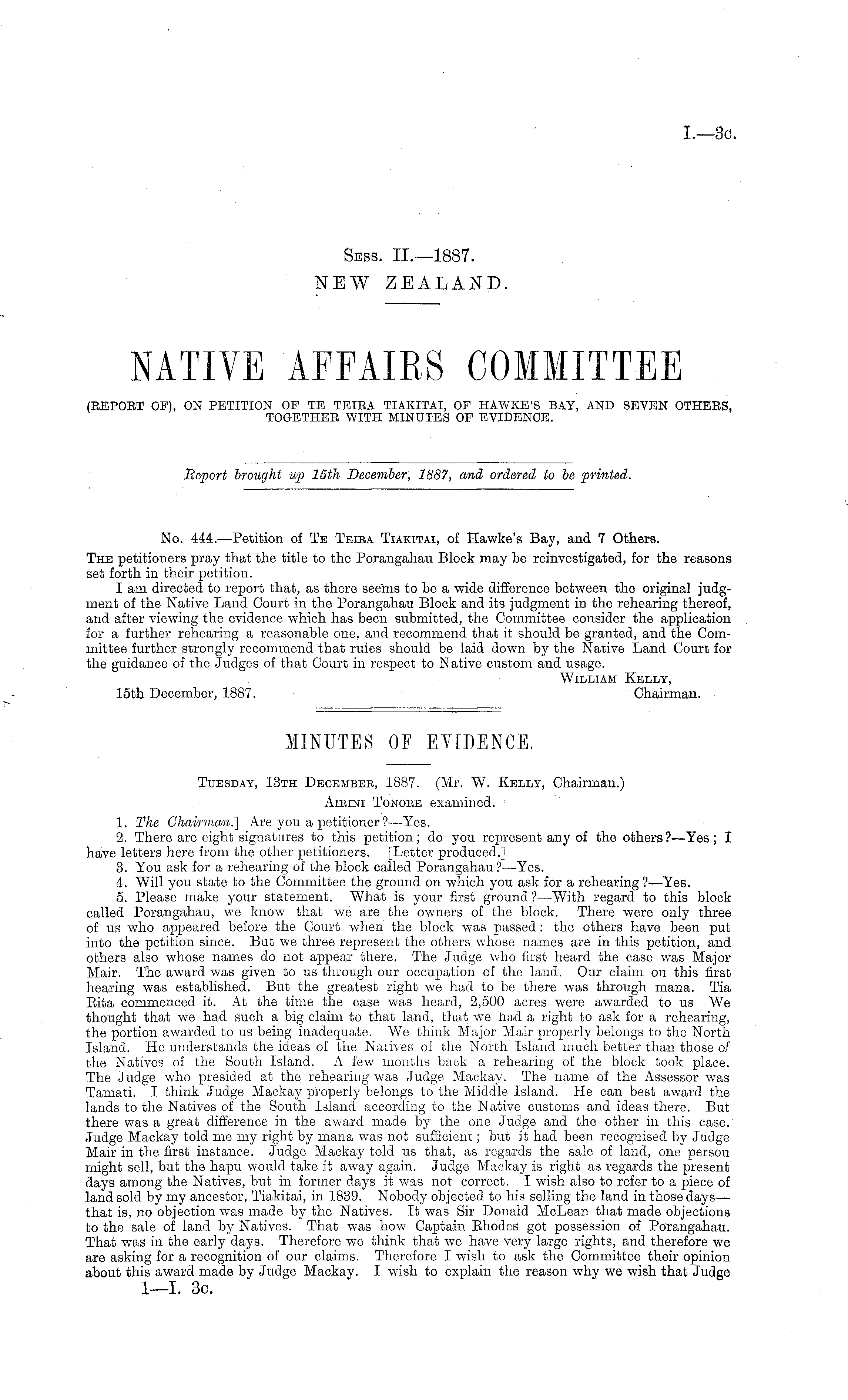 Tuesday, 13th Decembee, 1887. (Mr. W. Kelly, Chairman.) Aieini Tonoee examined. 1. The Chairman.] Are you a petitioner ? —Yes. 2. There are eight signatures to this petition; do you represent any of the others?— Yes; I have letters here from the other petitioners. [Letter produced.] 3. You ask for a rehearing of the block called Porangahau?—Yes. 4. Will you state to the Committee the ground on which you ask for a rehearing?— Yes. 5. Please make your statement. What is your first ground? —With regard to this block called Porangahau, we know that we are the owners of the block. There were only three of us who appeared before the Court when the block was passed : the others have been put into the petition since. But we three represent the others whose names are in this petition, and others also whose names do not appear there. The Judge who first heard the case was Major Mair. The award was given to us through our occupation of the land. Our claim on this first hearing was established. But the greatest right we had to be there was through mana. Tia Rita commenced it. At the time the case was heard, 2,500 acres were awarded to us We thought that we had such a big claim to that land, that wo had a right to ask for a rehearing, the portion awarded to us being inadequate. We think Major Mair properly belongs to the North Island. He understands the ideas of the Natives of the North Island much better than those of the Natives of the South Island. A few months back a rehearing of the block took place. The Judge who presided at the rehearing was Judge Mackay. The name of the Assessor was Tamati. I think Judge Mackay properly belongs to the Middle Island. He can best award the lands to the Natives of the South Island according to the Native customs and ideas there. But there was a great difference in the award made by the one Judge and the other in this case. Judge Mackay told me my right by mana was not sufficient; but it had been recognised by Judge Mair in the first instance. Judge Mackay told us that, as regards the sale of land, one person might sell, but the hapu would take it away again. Judge Mackay is right as regards the present days among the Natives, but in former days it was not correct. I wish also to refer to a piece of land sold by my ancestor, Tiakitai, in 1839. Nobody objected to his selling the land in those days— that is, no objection was made by the Natives. It was Sir Donald McLean that made objections to the sale of land by Natives. That was how Captain Rhodes got possession of Porangahau. That was in the early days. Therefore we think that we have very large rights, and therefore we are asking for a recognition of our claims. Therefore I wish to ask the Committee their opinion about this award made by Judge Mackay. I wish to explain the reason why we wish that Judge