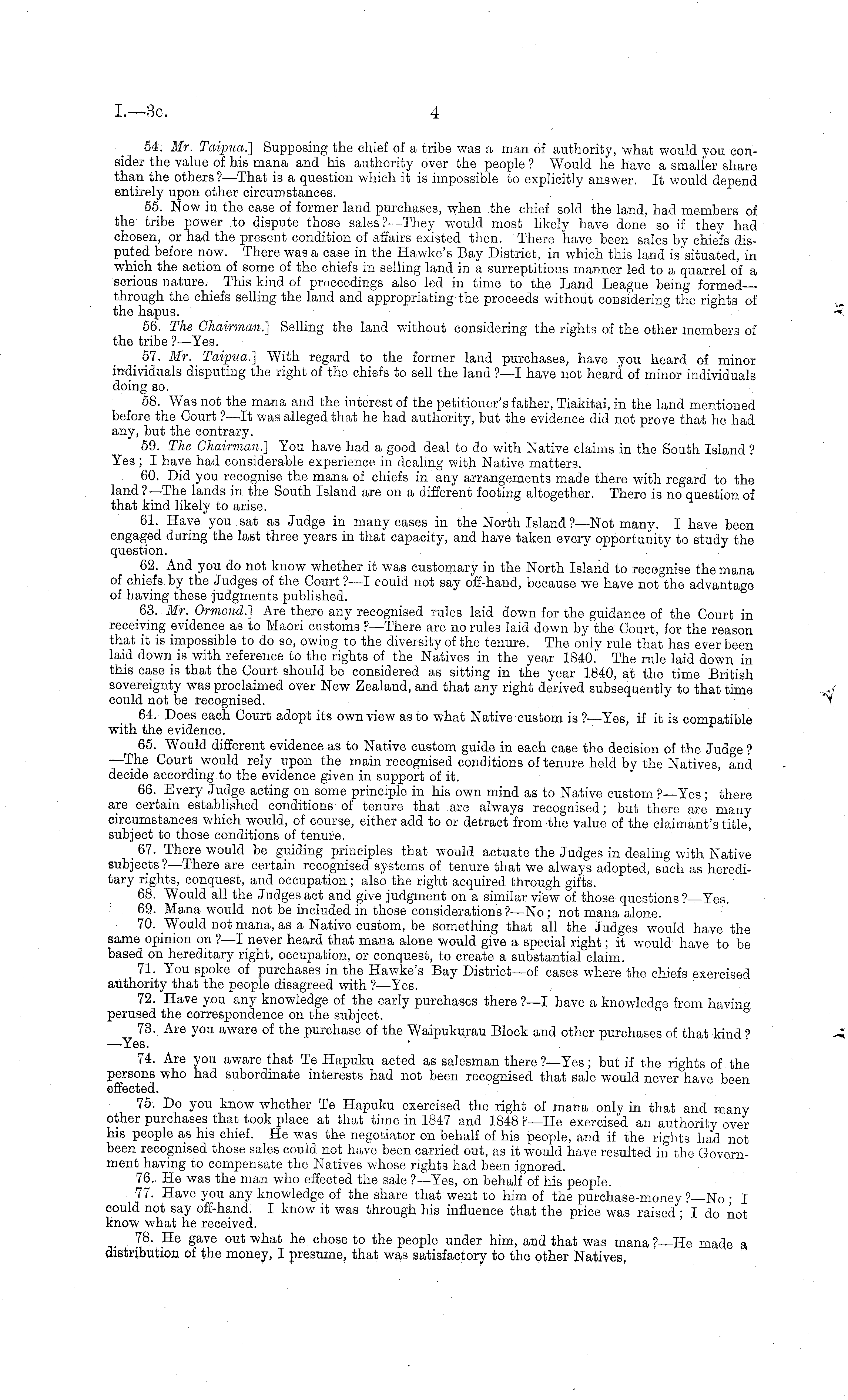 54. Mr. Taipua.] Supposing the chief of a tribe was a man of authority, what would you consider the value of his mana and his authority over the people ? Would he have a smaller share than the others?— That is a question which it is impossible to explicitly answer. It would depend entirely upon other circumstances. 55. Now in the case of former land purchases, when the chief sold the land, had members of the tribe power to dispute those sales?— They would most likely have done so if they had chosen, or had the present condition of affairs existed then. There have been sales by chiefs disputed before now. There was a case in the Hawke's Bay District, in which this land is situated, in which the action of some of the chiefs in selling land in a surreptitious manner led to a quarrel of a serious nature. This kind of proceedings also led in time to the Land League bein"- formed through the chiefs selling the land and appropriating the proceeds without consfdering the rights of the hapus. 56. The Chairman?] Selling the land without considering the rights of the other members of the tribe ?—Yes. 57. Mr. Taipua?] With regard to the former land purchases, have you heard of minor individuals disputing the right of the chiefs to sell the land ?—I have not heard of minor individuals doing so. 58. Was not the mana and the interest of the petitioner's father, Tiakitai, in the land mentioned before the Court ?—lt was alleged that he had authority, but the evidence did not prove that he had any, but the contrary. 59. The Chairman.] You have had a good deal to do with Native claims in the South Island ? Yes ; I have had considerable experience in dealing with Native matters. 60. Did you recognise the mana of chiefs in any arrangements made there with regard to the land?— The lands in the South Island are on a different footing altogether. There is no question of that kind likely to arise. 61. Have you sat as Judge in many cases in the North Island ?—Not many. I have been engaged during the last three years in that capacity, and have taken every opportunity to study the question. 62. And you do not know whether it was customary in the North Island to recognise the mana of chiefs by the Judges of the Court ?—I could not say off-hand, because we have not the advantage of having these judgments published. 63. Mr. Ormond.] Are there any recognised rules laid down for the guidance of the Court in receiving evidence as to Maori customs ?—There are no rules laid down by the Court, for the reason that it is impossible to do so, owing to the diversity of the tenure. The only rule that has ever been laid down is with reference to the rights of the Natives in the year 1840. The rule laid down in this case is that the Court should be considered as sitting in the year 1840, at the time British sovereignty was proclaimed over New Zealand, and that any right derived subsequently to that time could not be recognised. 64. Does each Court adopt its own view as to what Native custom is ?—Yes, if it is compatible with the evidence. 65. Would different evidence as to Native custom guide in each case the decision of the Judge ? —The Court would rely upon the mam recognised conditions of tenure held by the Natives, and decide according to the evidence given in support of it. 66. Every Judge acting on some principle in his own mind as to Native custom ?— Yes; there are certain established conditions of tenure that are always recognised; but there are many circumstances which would, of course, either add to or detract from the value of the claimant's title, subject to those conditions of tenure. _ 67. There would be guiding principles that would actuate the Judges in dealing with Native subjects ? —There are certain recognised systems of tenure that we always adopted, such as hereditary rights, conquest, and occupation; also the right acquired through gifts. 68. Would all the Judges act and give judgment on a similar view of those questions ? Yes. 69. Mana would not be included in those considerations ?—No ; not mana alone. 70. Would not mana, as a Native custom, be something that all the Judges would have the same opinion on ?—I never heard that mana alone would give a special right; it would have to be based on hereditary right, occupation, or conquest, to create a substantial claim. 71. You spoke of purchases in the Hawke's Bay District—of cases where the chiefs exercised authority that the people disagreed with ? —Yes. 72. Have you any knowledge of the early purchases there ?—I have a knowledge from having perused the correspondence on the subject. 73. Are you aware of the purchase of the Waipukurau Block and other purchases of that kind ? —Yes. 74. Are you aware that Te Hapuku acted as salesman there ?—Yes; but if the rights of the persons who had subordinate interests had not been recognised that sale would neverhave been effected. 75. Do you know whether Te Hapuku exercised the right of mana only in that and many other purchases that took place at that time in 1847 and 1848 ?—He exercised an authority over his people as his chief. He was the negotiator on behalf of his people, and if the rights had not been recognised those sales could not have been carried out, as it would have resulted in the Government having to compensate the Natives whose rights had been ignored. 76.. He was the man who effected the sale ?—Yes, on behalf of his people. 77. Have you any knowledge of the share that went to him of the purchase-money ?—No ; I could not say off-hand. I know it was through his influence that the price was raised ; I do not know what he received. 78. He gave out what he chose to the people under him, and that was mana ?—He made a distribution of the money, I presume, that was satisfactory to the other Natives,