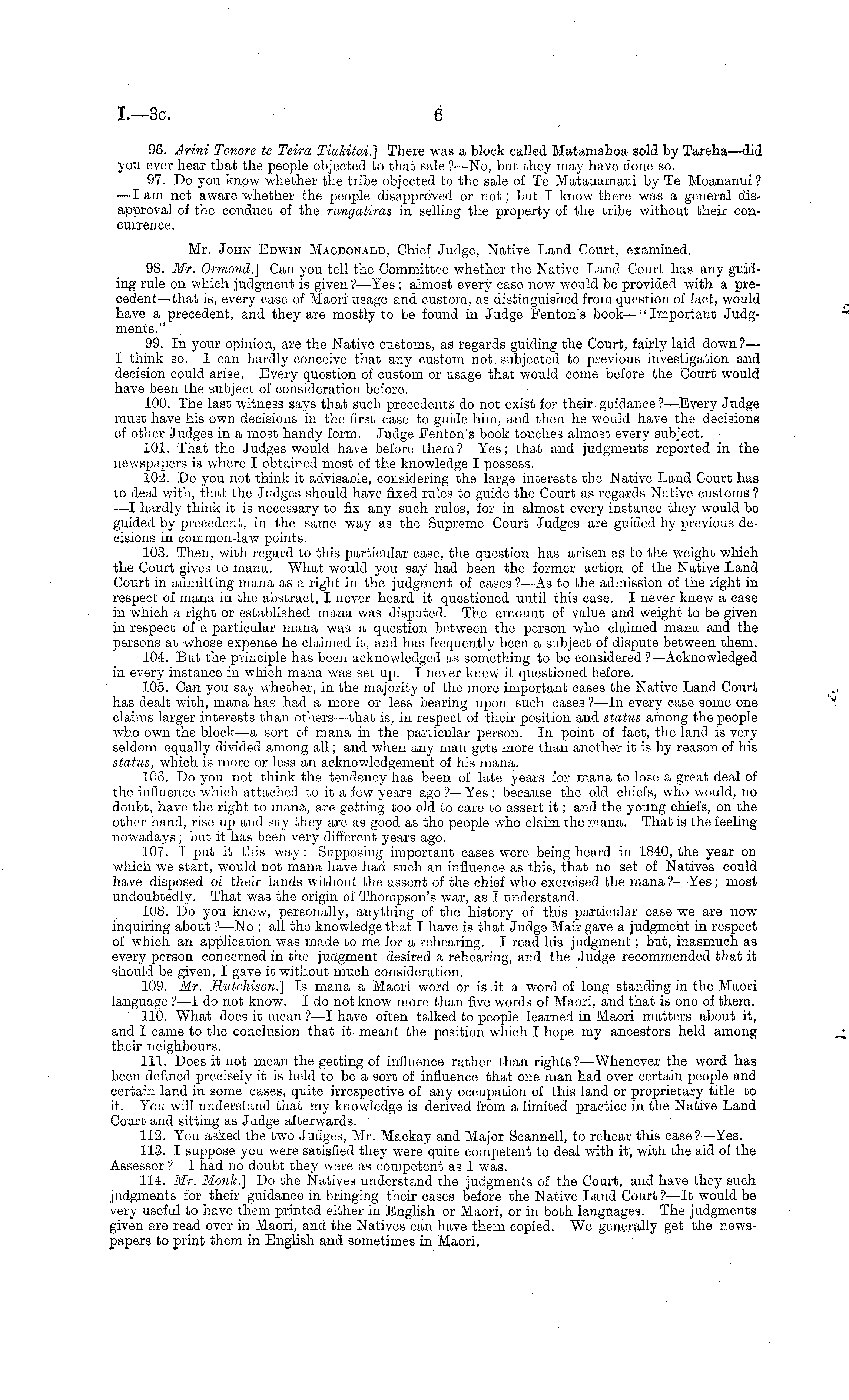 96. Arini Tonore te Teira Tiakitai.] There was a block called Matamahoa sold by Tareha—did you ever hear that the people objected to that sale ? —No, but they may have done so. 97. Do you know whether the tribe objected to the sale of Te Matauamaui by Te Moananui ? —I am not aware whether the people disapproved or not; but I know there was a general disapproval of the conduct of the rangatiras in selling the property of the tribe without their concurrence. Mr. John Edwin Macdonald, Chief Judge, Native Land Court, examined. 98. Mr. Ormond.] Can you tell the Committee whether the Native Land Court has any guiding rule on which judgment is given ? —Yes; almost every case now would be provided with a precedent—that is, every case of Maori usage and custom, as distinguished from question of fact, would have a precedent, and they are mostly to be found in Judge Fenton's book—"lmportant Judgments." 99. In your opinion, are the Native customs, as regards guiding the Court, fairly laid down?— I think so. I can hardly conceive that any custom not subjected to previous investigation and decision could arise. Every question of custom or usage that would come before the Court would have been the subject of consideration before. 100. The last witness says that such precedents do not exist for their guidance?— Every Judge must have his own decisions in the first case to guide him, and then he would have the decisions of other Judges in a most handy form. Judge Fenton's book touches almost every subject. 101. That the Judges would have before them?— Yes; that and judgments reported in the newspapers is where I obtained most of the knowledge I possess. 102. Do you not think it advisable, considering the large interests the Native Land Court has to deal with, that the Judges should have fixed rules to guide the Court as regards Native customs ? —I hardly think it is necessary to fix any such rules, for in almost every instance they would be guided by precedent, in the same way as the Supreme Court Judges are guided by previous decisions in common-law points. 103. Then, with regard to this particular case, the question has arisen as to the weight which the Court gives to mana. What would you say had been the former action of the Native Land Court in admitting mana as a right in the judgment of cases ?—As to the admission of the right in respect of mana in the abstract, I never heard it questioned until this case. I never knew a ease in which a right or established mana was disputed. The amount of value and weight to be given in respect of a particular mana was a question between the person who claimed mana and the persons at wdiose expense he claimed it, and has frequently been a subject of dispute between them. 104. But the principle has been acknowledged as something to be considered ? —Acknowledged in every instance in which mana was set up. I never knew it questioned before. 105. Can you say whether, in the majority of the more important cases the Native Land Court has dealt with, mana has had a more or less bearing upon such cases ?—ln every case some one claims larger interests than others—that is, in respect of their position and status among the people who own the block—a sort of mana in the particular person. In point of fact, the land is very seldom equally divided among all; and when any man gets more than another it is by reason of his status, which is more or less an acknowledgement of his mana. 106. Do you not think the tendency has been of late years for mana to lose a great deal of the influence which attached to it a few years ago?— Yes; because the old chiefs, who would, no doubt, have the right to mana, are getting too old to care to assert it; and the young chiefs, on the other hand, rise up and say they are as good as the people who claim the mana. That is the feeling nowadays; but it has been very different years ago. 107. I put it this way: Supposing important cases were being heard in 1840, the year on which we start, would not mana have had such an influence as this, that no set of Natives could have disposed of their lands without the assent of the chief who exercised the mana?—Yes; most undoubtedly. That was the origin of Thompson's war, as I understand. 108. Do you know, personally, anything of the history of this particular case we are now inquiring about ? —No ; all the knowledge that I have is that Judge Mair gave a judgment in respect of which an application was made to me for a rehearing. I read his judgment; but, inasmuch as every person concerned in the judgment desired a rehearing, and the Judge recommended that it should be given, I gave it without much consideration. 109. Mr. Hutchison.] Is mana a Maori word or is it a word of long standing in the Maori language ? —I do not know. Ido not know more than five words of Maori, and that is one of them. 110. What does it mean ?—I have often talked to people learned in Maori matters about it, and I came to the conclusion that it- meant the position which I hope my ancestors held among their neighbours. 111. Does it not mean the getting of influence rather than rights?— Whenever the word has been defined precisely it is held to be a sort of influence that one man had over certain people and certain land in some cases, quite irrespective of any occupation of this land or proprietary title to it. You will understand that my knowledge is derived from a limited practice in the Native Land Court and sitting as Judge afterwards. 112. You asked the two Judges, Mr. Mackay and Major Scannell, to rehear this case? —Yes. 113. I suppose you were satisfied they were quite competent to deal with it, with the aid of the Assessor ?—I had no doubt they were as competent as I was. 114. Mr. Monk.] Do the Natives understand the judgments of the Court, and have they such judgments for their guidance in bringing their cases before the Native Land Court ?—lt would be very useful to have them printed ei