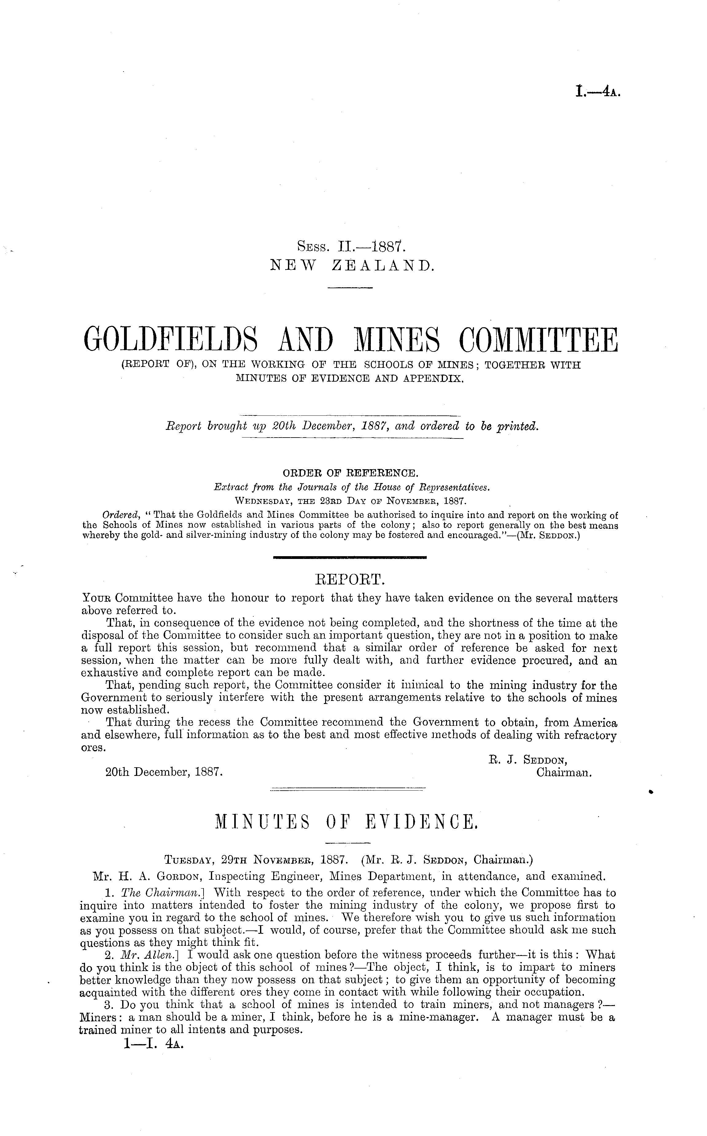 OBDEB OF EEFEBENCE. Extract from the Journals of the House of Representatives. Wednesday, the 23bd Day of November, 1887. Ordered, " That the Goldfields and Mines Committee be authorised to inquire into and report on the working of the Schools of Mines now established in various parts of the colony; also to report generally on the best means whereby the gold- and silver-mining industry of the colony may be fostered and encouraged."—(Mr. Seddon.)