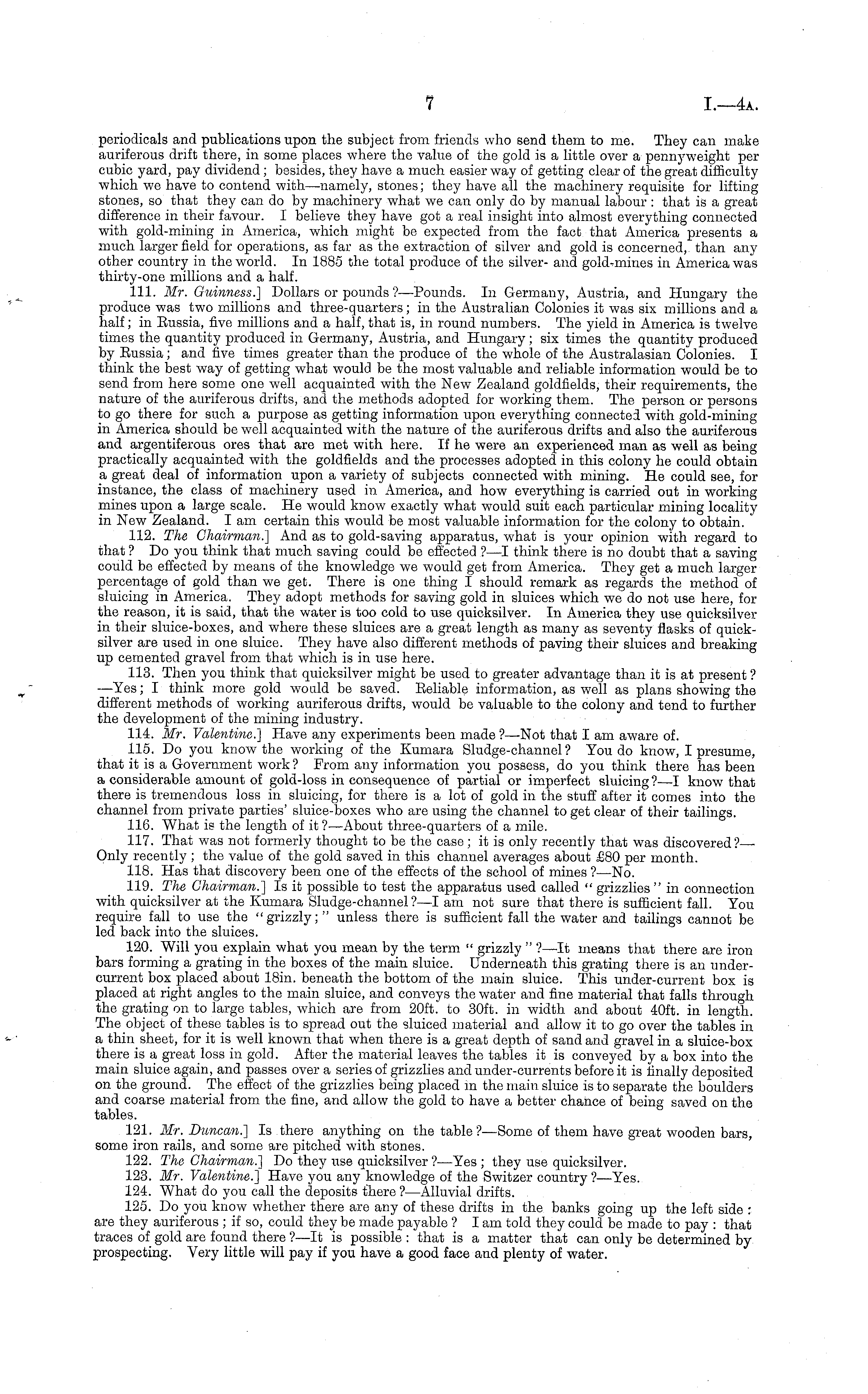 periodicals and publications upon the subject from friends who send them to me. They can make auriferous drift there, in some places where the value of the gold is a little over a pennyweight per cubic yard, pay dividend; besides, they have a much easier way of getting clear of the great difficulty which we have to contend with —namely, stones; they have all the machinery requisite for lifting stones, so that they can do by machinery what we can only do by manual labour : that is a great difference in their favour. I believe they have got a real insight into almost everything connected with gold-mining in America, which might be expected from the fact that America presents a much larger field for operations, as far as the extraction of silver and gold is concerned, than any other country in the world. In 1885 the total produce of the silver- and gold-mines in America was thirty-one millions and a half. 111. Mr. Guinness.] Dollars or pounds'?— Pounds. In Germany, Austria, and Hungary the produce was two millions and three-quarters; in the Australian Colonies it was six millions and a half; in Eussia, five millions and a half, that is, in round numbers. The yield in America is twelve times the quantity produced in Germany, Austria, and Hungary; six times the quantity produced by Eussia; and five times greater than the produce of the whole of the Australasian Colonies. I think the best way of getting what would be the most valuable and reliable information would be to send from here some one well acquainted with the New Zealand goldfields, their requirements, the nature of the auriferous drifts, and the methods adopted for working them. The person or persons to go there for such a purpose as getting information upon everything connected with gold-mining in America should be well acquainted with the nature of the auriferous drifts and also the auriferous and argentiferous ores that are met with here. If he were an experienced man as well as being practically acquainted with the goldfields and the processes adopted in this colony he could obtain a great deal of information upon a variety of subjects connected with mining. He could see, for instance, the class of machinery used in America, and how everything is carried out in working mines upon a large scale. He would know exactly what would suit each particular mining locality in New Zealand. lam certain this would be most valuable information for the colony to obtain. 112. The Chairman.] And as to gold-saving apparatus, what is your opinion with regard to that ? Do you think that much saving could be effected ? —I think there is no doubt that a saving could be effected by means of the knowledge we would get from America. They get a much larger percentage of gold than we get. There is one thing I should remark as regards the method of sluicing in America. They adopt methods for saving gold in sluices which we do not use here, for the reason, it is said, that the water is too cold to use quicksilver. In America they use quicksilver in their sluice-boxes, and where these sluices are a great length as many as seventy flasks of quicksilver are used in one sluice. They have also different methods of paving their sluices and breaking up cemented gravel from that which is in use here. 113. Then you think that quicksilver might be used to greater advantage than it is at present ? —Yes; I think more gold would be saved. Eeliable information, as well as plans showing the different methods of working auriferous drifts, would be valuable to the colony and tend to further the development of the mining industry. 114. Mr. Valentine.] Have any experiments been made ?—Not that I am aware of. 115. Do you know the working of the Kumara Sludge-channel? You do know, I presume, that it is a Government work ? From any information you possess, do you think there has been a considerable amount of gold-loss in consequence of partial or imperfect sluicing ?—I know that there is tremendous loss in sluicing, for there is a lot of gold in the stuff after it comes into the channel from private parties' sluice-boxes who are using the channel to get clear of their tailings. 116. What is the length of it ? —About three-quarters of a mile. 117. That was not formerly thought to be the case; it is only recently that was discovered? ■ Only recently ; the value of the gold saved in this channel averages about £80 per month. 118. Has that discovery been one of the effects of the school of mines ?—No. 119. The Chairman.] Is it possible to test the apparatus used called " grizzlies " in connection with quicksilver at the Kumara Sludge-channel ?—I am not sure that there is sufficient fall. You require fall to use the "grizzly;" unless there is sufficient fall the water and tailings cannot be led back into the sluices. 120. Will you explain what you mean by the term " grizzly " ?—lt means that there are iron bars forming a grating in the boxes of the main sluice. Underneath this grating there is an undercurrent box placed about 18in. beneath the bottom of the main sluice. This under-current box is placed at right angles to the main sluice, and conveys the water and fine material that falls through the grating on to large tables, which are from 20ft. to 30ft. in width and about 40ft. in length. The object of these tables is to spread out the sluiced material and allow it to go over the tables in a thin sheet, for it is well known that when there is a great depth of sand and gravel in a sluice-box there is a great loss in gold. After the material leaves the tables it is conveyed by a box into the main sluice again, and passes over a series of grizzlies and under-currents before it is finally deposited on the ground. The effect of the grizzlies being placed in the main sluice is to separate the boulders and coarse material from the fine, and allow the gold to have a better chance of being saved on the tables. 121. Mr. Duncan.] Is there anything on the table?— Some