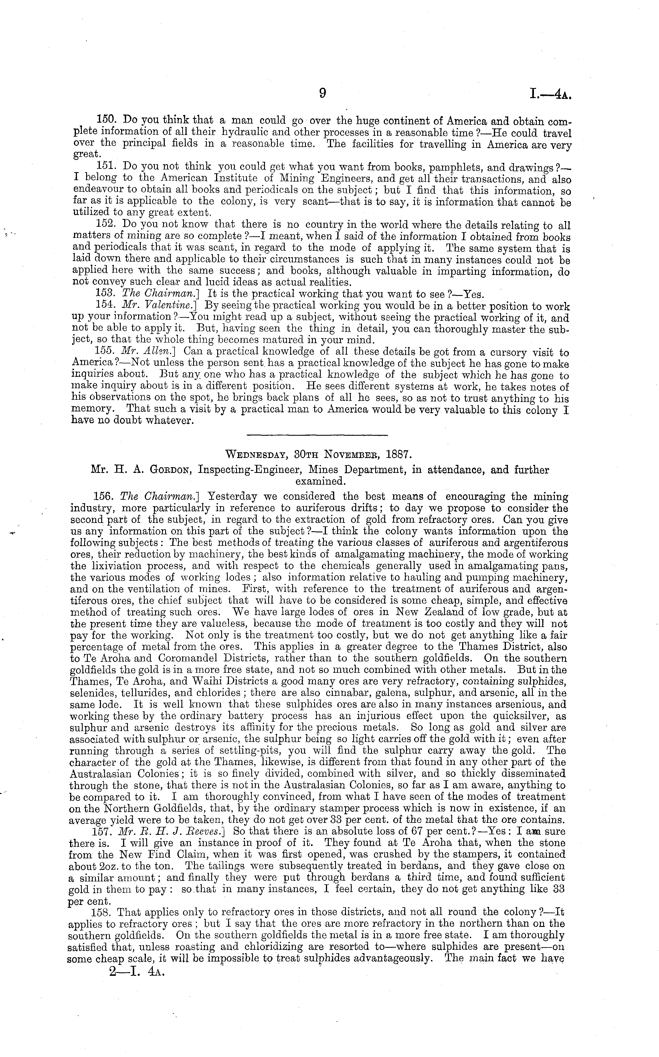 150. Do you think that a man could go over the huge continent of America and obtain complete information of all their hydraulic and other processes in a reasonable time ?—He could travel over the principal fields in a reasonable time. The facilities for travelling in America are very great. 151. Do you not think you could get what you want from books, pamphlets, and drawings ?— I belong to the American Institute of Mining Engineers, and get all their transactions, and also endeavour to obtain all books and periodicals on the subject; but I find that this information, so far as it is applicable to the colony, is very scant—that is to say, it is information that cannot be utilized to any great extent. 152. Do you not know that there is no country in the world where the details relating to all matters of mining are so complete ?—I meant, when I said of the information I obtained from books and periodicals that it was scant, in regard to the mode of applying it. The same system that is laid down there and applicable to their circumstances is such that in many instances could not be applied here with the same success; and books, although valuable in imparting information, do not convey such clear and lucid ideas as actual realities. 153. The Chairman.'] It is the practical working that you want to see ?—Yes. 154. Mr. Valentine.'] By seeing the practical working you would be in a better position to work up your information?— You might read up a subject, without seeing the practical working of it, and not be able to apply it. But, having seen the thing in detail, you can thoroughly master the subject, so that the whole thing becomes matured in your mind. 155. Mr. Alhn.] Can a practical knowledge of all these details be got from a cursory visit to America ?—Not unless the person sent, has a practical knowledge of the subject he has gone to make inquiries about. But any one who has a practical knowledge of the subject which he has gone to make inquiry about is in a different position. He sees different systems at work, he takes notes of his observations on the spot, he brings back plans of all he sees, so as not to trust anything to his memory. That such a visit by a practical man to America would be very valuable to this colony I have no doubt whatever.