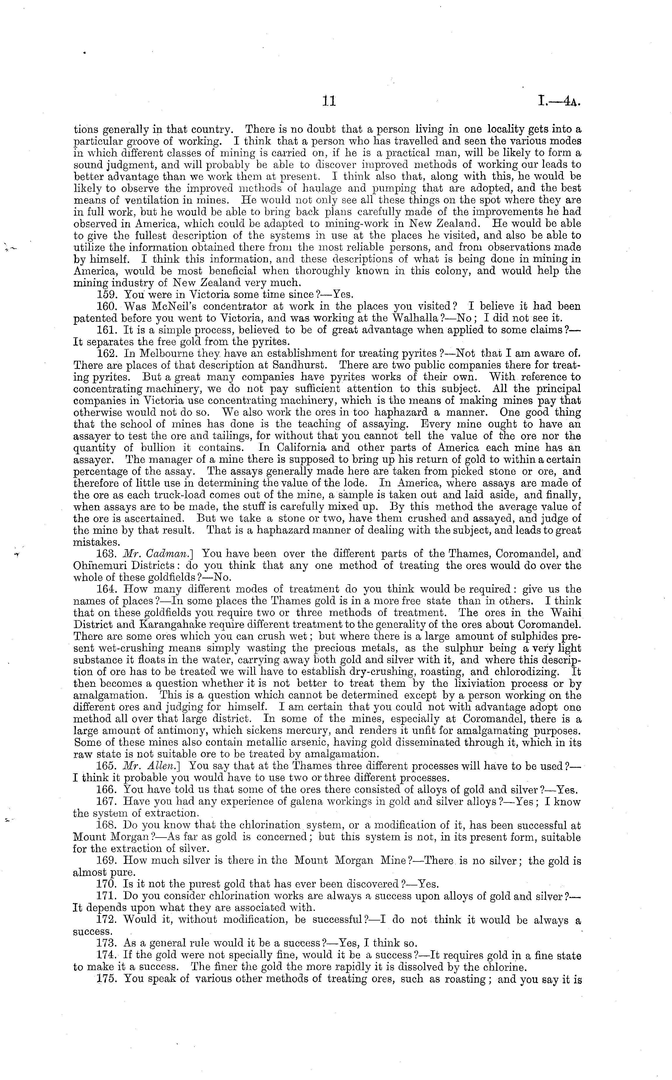 tions generally in that country. There is no doubt that a person living in one locality gets into a particular groove of working. I think that a person who has travelled and seen the various modes in which different classes of mining is carried on, if he is a practical man, will be likely to form a sound judgment, and will probably be able to discover improved methods of working our leads to better advantage than we work them at present. I think also that, along with this, he would be likely to observe the improved methods of haulage and pumping that are adopted, and the best means of ventilation in mines. He would not only see all these things on the spot where they are in full work, but he would be able to bring back plans carefully made of the improvements he had observed in America, which could be adapted to mining-work in New Zealand. He would be able to give the fullest description of the systems in use at the places he visited, and also be able to utilize the information obtained there from the most reliable persons, and from observations made by himself. I think this information, and these descriptions of what is being done in mining in America, would be most beneficial when thoroughly known in this colony, and would help the mining industry of New Zealand very much. 159. You were in Victoria some time since ?—Yes. 160. Was McNeil's concentrator at work in the places you visited? I believe it had been patented before you went to Victoria, and was working at the Walhalla ? —No; I did not see it. 161. It is a simple process, believed to be of great advantage when applied to some claims?— It separates the free gold from the pyrites. 162. In Melbourne they have an establishment for treating pyrites ?—Not thai; I am aware of. There are places of that description at Sandhurst. There are two public companies there for treating pyrites. But a great many companies have pyrites works of their own. With reference to concentrating machinery, we do not pay sufficient attention to this subject. All the principal companies in Victoria use concentrating machinery, which is the means of making mines pay that otherwise would not do so. We also work the ores in too haphazard a manner. One good thing that the school of mines has done is the teaching of assaying. Every mine ought to have an assayer to test the ore and tailings, for without that you cannot tell the value of the ore nor the quantity of bullion it contains. In California and other parts of America each mine has an assayer. The manager of a mine there is supposed to bring up his return of gold to within a certain percentage of the assay. The assays generally made here are taken from picked stone or ore, and therefore of little use in determining the value of the lode. In America, where assays are made of the ore as each truck-load comes out of the mine, a sample is taken out and laid aside, and finally, when assays are to be made, the stuff is carefully mixed up. By this method the average value of the ore is ascertained. But we take a stone or two, have them crushed and assayed, and judge of the mine by that result. That is a haphazard manner of dealing with the subject, and leads to great mistakes. 163. Mr. Cadman.] You have been over the different parts of the Thames, Coromandel, and Ohihemuri Districts : do you think that any one method of treating the ores would do over the whole of these goldfields?—No. 164. How many different modes of treatment do you think would be required : give us the names of places ?—ln some places the Thames gold is in a more free state than in others. I think that on these goidfields you require two or three methods of treatment. The ores in the Wai hi District and Karangahake require different treatment to the generality of the ores about Coromandel. There are some ores which you can crush wet; but where there is a large amount of sulphides present wet-crushing means simply wasting the precious metals, as the sulphur being a very light substance it floats in the water, carrying away both gold and silver with it, and where this description of ore has to be treated we will have to establish dry-crushing, roasting, and chlorodizing. It then becomes a question whether it is not better to treat them by the lixiviation process or by amalgamation. This is a question which cannot be determined except by a person working on the different ores and judging for himself. lam certain that you could not with advantage adopt one method all over that large district. In some of the mines, especially at Coromandel, there is a large amount of antimony, which sickens mercury, and renders it unfit for amalgamating purposes. Some of these mines also contain metallic arsenic, having gold disseminated through it, which in its raw state is not suitable ore to be treated by amalgamation. 165. Mr. Allen.] You say that at the Thames three different processes will have to be used?— I think it probable you would have to use two or three different processes. 166. You have told us that some of the ores there consisted of alloys of gold and silver?— Yes. 167. Have you had any experience of galena workings in gold and silver alloys ?—Yes ; I know the system of extraction. 168. Do you know that the chlorination system, or a modification of it, has been successful at Mount Morgan?—As far as gold is concerned; but this system is not, in its present form, suitable for the extraction of silver. 169. How much silver is there in the Mount Morgan Mine? —There is no silver; the gold is almost pure. 170. Is it not the purest gold that has ever been discovered ? —Yes. 171. Do you consider chlorination works are always a success upon alloys of gold and silver?— It depends upon what they are associated with. 172. Would it, without modification, be successful? —I do not think it would be always a success. 173. As a general rule would it be a success?— Yes, I think so. 174. If the gold were not specially fine, would it be a 