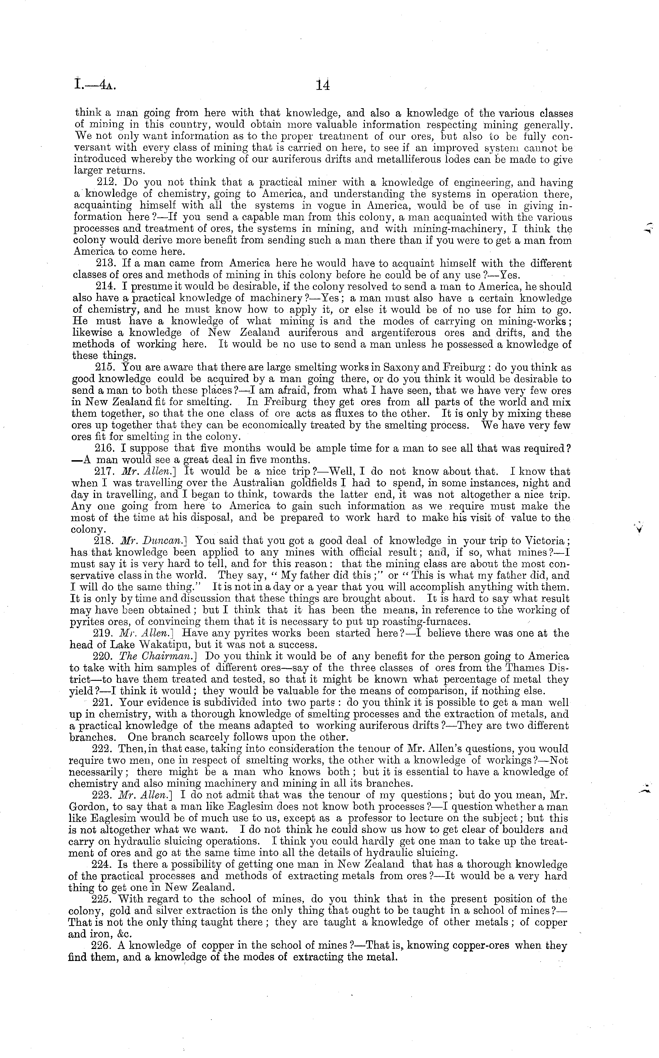 think a man going from here with that knowledge, and also a knowledge of the various classes of mining in this country, would obtain more valuable information respecting mining generally. We not only want information as to the proper treatment of our ores, but also to be fully conversant with every class of mining that is carried on here, to see if an improved system cannot be introduced whereby the working of our auriferous drifts and metalliferous lodes can be made to give larger returns. 212. Do you not think that a practical miner with a knowledge of engineering, and having a knowledge of chemistry, going to America, and understanding the systems in operation there, acquainting himself with all the systems in vogue in America, would be of use in giving information here ?—lf you send a capable man from this colony, a man acquainted with the various processes and treatment of ores, the systems in mining, and with mining-machinery, I think the colony would derive more benefit from sending such a man there than if you were to get a man from America to come here. 213. If a man came from America here he would have to acquaint himself with the different classes of ores and methods of mining in this colony before he could be of any use ? —Yes. 214. I presume it would be desirable, if the colony resolved to send a man to America, he should also have a practical knowledge of machinery ?—Yes; a man must also have a certain knowledge of chemistry, and he must know how to apply it, or else it would be of no use for him to go. He must have a knowledge of what mining is and the modes of carrying on mining-works ; likewise a knowledge of New Zealand auriferous and argentiferous ores and drifts, and the methods of working here. It would be no use to send a man unless he possessed a knowledge of these things. 215. You are aware that there are large smelting works in Saxony and Freiburg : do you think as good knowledge could be acquired by a man going there, or do you think it would be desirable to send a man to both these places ?—I am afraid, from what I have seen, that we have very few ores in New Zealand fit for smelting. In Freiburg they get ores from all parts of the world and mix them together, so that the one class of ore acts as fluxes to the other. It is only by mixing these ores up together that they can be economically treated by the smelting process. We have very few ores fit for smelting in the colony. 216. I suppose that five months would be ample time for a man to see all that was required? —A man would see a great deal in five months. 217. Mr. Allen.] It would be a nice trip? —Well, I do not know about that. I know that when I was travelling over the Australian goldfields I had to spend, in some instances, night and day in travelling, and I began to think, towards the latter end, it was not altogether a nice trip. Any one going from here to America to gain such information as we require must make the most of the time at his disposal, and be prepared to work hard to make his visit of value to the colony. 218. Mr. Duncan.'] You said that you got a good deal of knowledge in your trip to Victoria ; has that knowledge been applied to any mines with official result; and, if so, what mines ?—I must say it is very hard to tell, and for this reason : that the mining class are about the most conservative class in the world. They say, "My father did this ;" or " This is what my father did, and I will do the same thing." It is not in a day or a year that you will accomplish anything with them. It is only by time and discussion that these things are brought about. It is hard to say what result may have been obtained ; but I think that it has been the means, in reference to the working of pyrites ores, of convincing them that it is necessary to put up roasting-furnaces. 219. Mr. Allen.] Have any pyrites works been started here? —I believe there was one at the head of Lake Wakatipu, but it was not a success. 220. The Chairman.] Do you think it would be of any benefit for the person going to America to take with him samples of different ores —say of the three classes of ores from the Thames District—to have them treated and tested, so that it might be known what percentage of metal they yield? —I think it would; they would be valuable for the means of comparison, if nothing else. 221. Your evidence is subdivided into two parts : do you think it is possible to get a man well up in chemistry, with a thorough knowledge of smelting processes and the extraction of metals, and a practical knowledge of the means adapted to working auriferous drifts ?—They are two different branches. One branch scarcely follows upon the other. 222. Then,in that case, taking into consideration the tenour of Mr. Allen's questions, you would require two men, one in respect of smelting works, the other with a knowledge of workings ? —Not necessarily; there might be a man who knows both ; but it is essential to have a knowledge of chemistry and also mining machinery and mining in all its branches. 223. Mr. Allen.] I do not admit that was the tenour of my questions; but do you mean, Mr. Gordon, to say that a man like Eaglesim does not know both processes ?—I question whether a man like Eaglesim would be of much use to us, except as a professor to lecture on the subject; but this is not altogether what we want. Ido not think he could show us how to get clear of boulders and carry on hydraulic sluicing operations. I think you could hardly get one man to take up the treatment of ores and go at the same time into all the details of hydraulic sluicing. 224. Is there a possibility of getting one man in New Zealand that has a thorough knowledge of the practical processes and methods of extracting metals from ores ? —lt would be a very hard thing to get one in New Zealand. 225. With regard to the school of mines, do you think that in the present position of the colony, gold and silver extraction is the only th