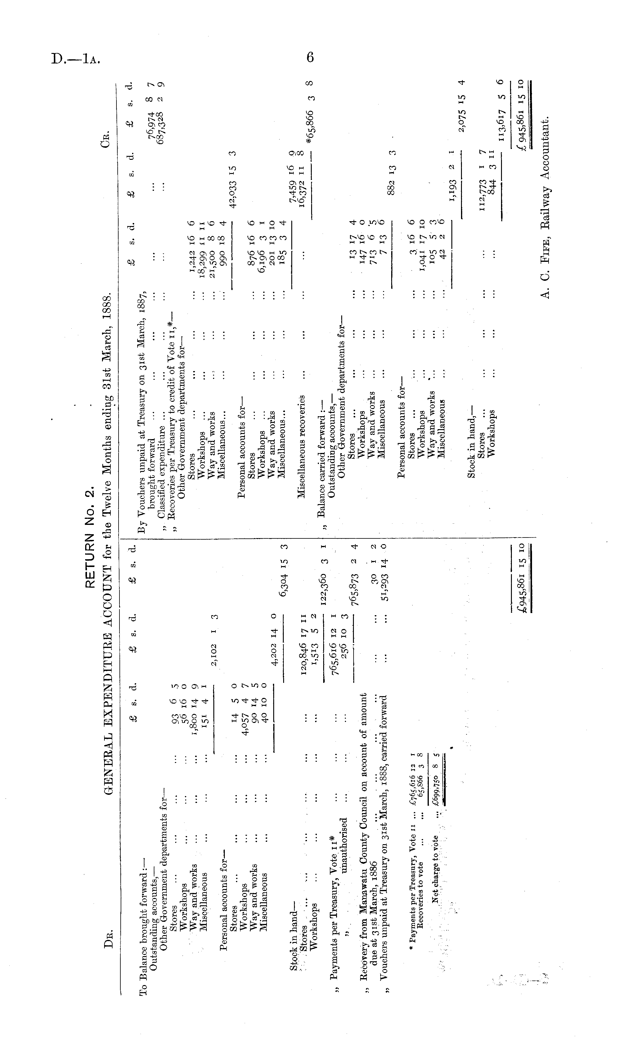 £ s. d. £ s. d. £ s. a. £ s. d. £ s. d. £ s. d. Po Balance brought forward: — ■ Outstanding accounts, — Other Government departments for — Stores ... ... ... ... 93 6 5 Workshops ... ... ... 56 16 o Way and worts ... ... ... r,8oo 14 9 Miscellaneous ... ... ... 151 4 1 By Vouchers unpaid at Treasury on 31st March, 1887, brought forward ... ... ... ... ... ... 76,974 8 7 „ Classified expenditure ... ... ... ... ... ... 687,328 2 9 „ Recoveries per Treasury to credit of Vote 11,* — Other Grovernment departments for — Stores ... ... ... ... 1,24.2 16 6 Workshops ... ... ... ... 18,299 11 11 Way and works ... ... ... 21,500 8 6 Miscellaneous... ... ... ... 990 18 4 42=033 15 3 2,102 1 3 Personal accounts for — Stores ... ... ... ... 14 5 o Workshops ... ... ... 4,057 4 7 Way and works ... ... ... 90 14 5 Miscellaneous ... ... ... 40 10 o Personal accounts for — Stores ... ... ... ... 876 16 6 Workshops ... ... ... ... 6,196 3 1 Way and works ... ... ... 201 13 10 Miscellaneous... ... ... ... 185 3 4 7,459 16 9 Miscellaneous recoveries ... ... ... ... 16,372 11 8 *6s,866 3 8 4,202 14 o ■ 6,304 IS 3 Stock in hand — ' . Stores . ... Workshops 120,846 17 11 122,360 3 1 „ Payments per Treasury, Vote 11* ,, unauthorised 765,616 12 1 256 10 3 765,873 2 4 „ Balance carried forward :— Outstanding accounts, — Other Grovernment departments for — Stores ... ... ... ... 13 17 4 Workshops ... ... ... 147 16 o Way and works ... ... ... 713 6 '5 Miscellaneous ... ... ... 7 13 6 882 13 3 ,, Recovery from Manawatu County Council on account of amount due at 31st March, 1886 „ Vouchers unpaid at Treasury on 31st March, 1888, carried forward 30 1 2 ... 51,293 '4 o * Payments per Treasurj^, Vote 11 ... 12 1 Recoveries to vote ... ... 6^,S6t) 3 8 , Net charge to vote ... £699,7^0 8 J Personal accounts for — Stores ... ... ... ... 3 16 6 Workshops ... ... ... 1,041 17 10 Way and works "... ... ... 105 5 3 Miscellaneous ... ... ... 42 2 6 1,193 2 1 - 2,075 15 4 Stock in hand, — Stores ... ... ... ... ... 112,773 l 7 Workshops ... ... ... ... 844 3 11 V *t — 113.617 S 0 . i £945,861 15 10 £ 945,861 15 10 A. C. Fife, Railway Accountant.