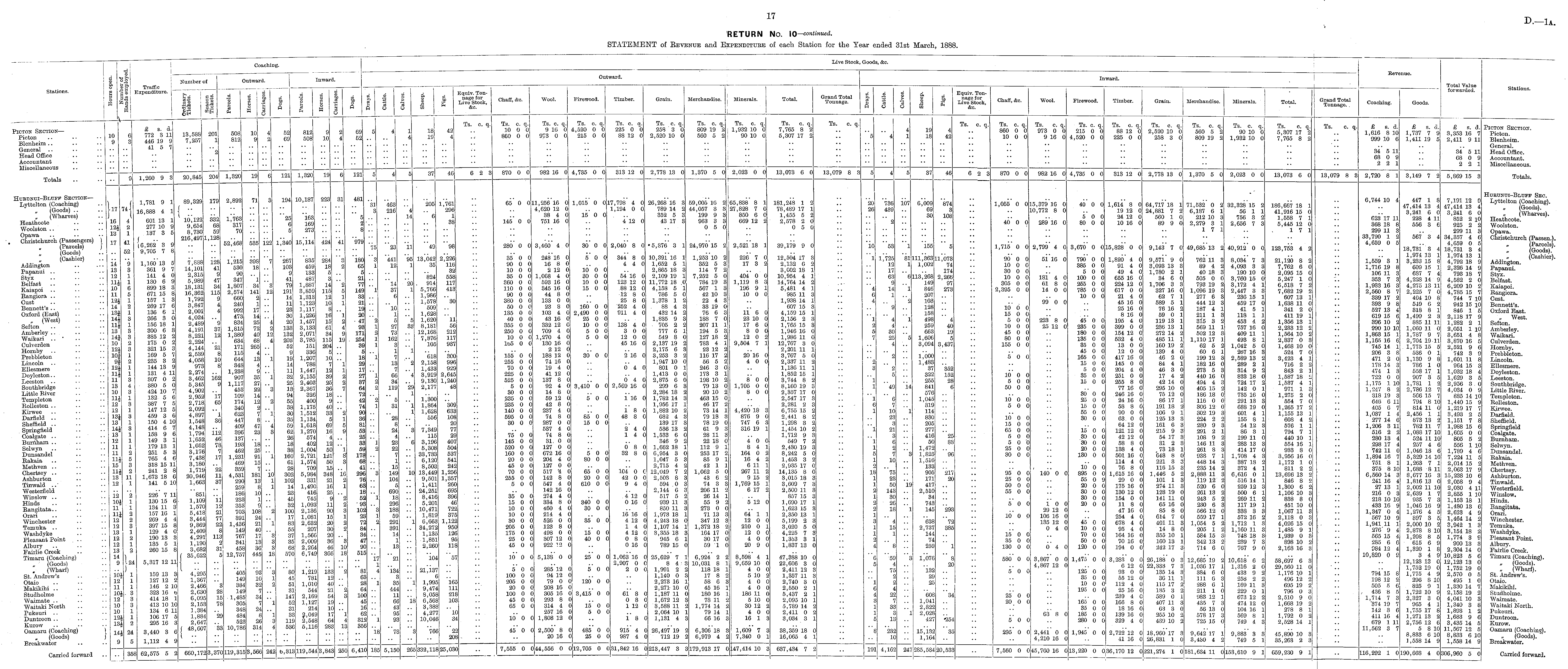 RETURN No. 10-continued. STATEMENT of Revenue and Expenditure of each Station for the Year ended 31st March, 1888.