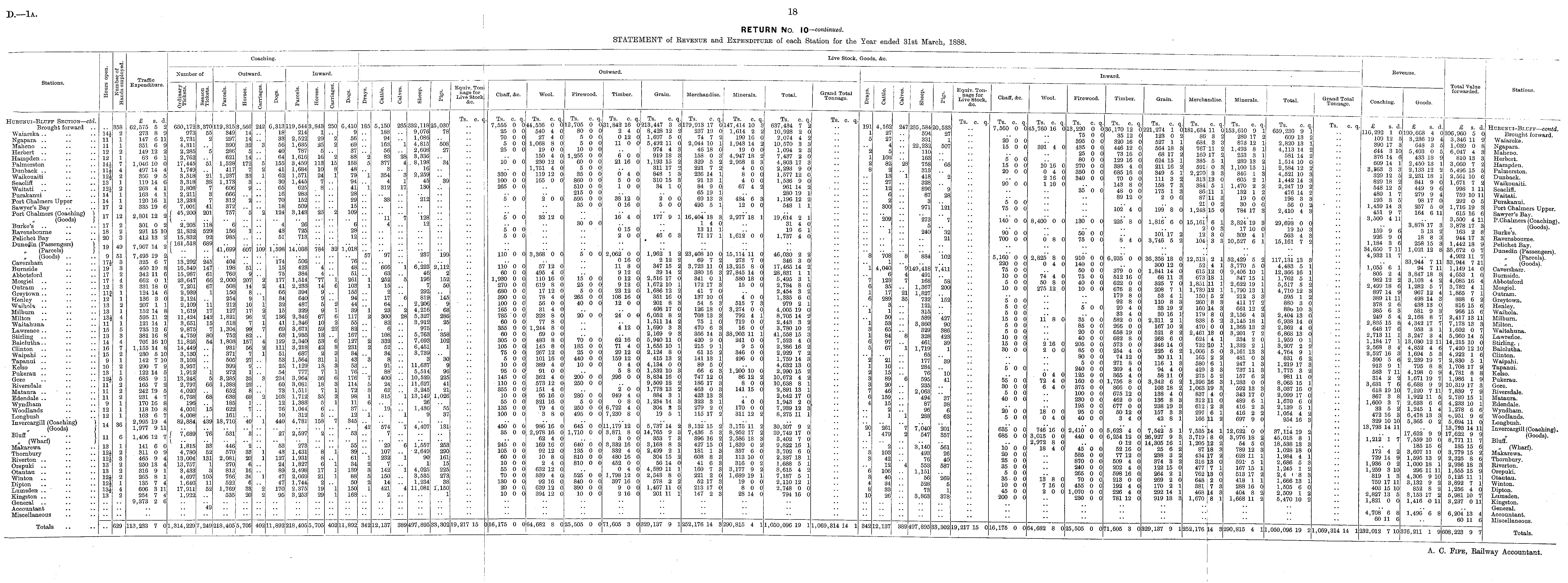 Coaching. Live Stock, Goods, &c. Stations. I s I Traffic Expenditure. Number of Outward. lutward. Inward. u % „• ■ 6 9 a, . Equiv.Tonf S S S S 53 \ t £ S> nagefor S 'fi ° £ ( H I "3 js £ Live stuck, Chaff, &c. Wool. Firewood. Timber. |_ Outward. Grain. Merchandise. : Minerals. Inward. Revenue. Stations. I! Total. <«- f I lit 1 SSE; ~. 0 « j a> * &c. Wool. Firewood. Timber. Grain. Merchandise. Minerals. Total. Grand Total Tonnage. I Total Value j forwarded. Coaching. (ioo<R I Huktjnui-Bluff Section— ctd. Brought forward Waiarcka Ngapara Maheno Herbert Hampden .. Palmersfcoir Dunbaek .. Waikouaiti Seaclifl .. Waitati .. Purakanui Port Chalmers Upper Sawyer's Bay Port Chalmers (Coaching) ) (Goods) \ Burke's Ravensbourne Pelichet Bay Duncdin (Passengers) ) (Parcels) (Goods) .. Caversham Burnside Abbotsford Mosgiel Outram Greyfcown Henley .. Waihola .. Milburn Milton Waitahuna Lawrence Stirling .. Balclutha Clinton Waipahi .. Tapanui Kelso Pukerau Gore Riversdale Mataura .. Edendalo Wyndham Woodlands Longbush Invercargill (Coaching) ) (Goods) t Bluff .. .. I „ (Wharf) .. ) Makarewa Thornbury Riverton Orepuki Otautau Winton .. Dipton Lumsden Kingston General Accountant Miscellaneous Hi 11 11 12 12 141 11J 12' 13 121 14 14 17 5W 2 1 1 2 1 7 4 2 2 1 1 2 S s. d. 02,575 5 2 273 8 9 147 6 11 351 6 9 149 12 2 68 6 1 1,040 10 0 497 14 4 356 9 5 119 14 6 263 4 1 163 4 1 120 16 1 335 19 6 2,S01 12 2 301 0 2 291 15 10 412 13 2 660,172 973 2,731 4,311 2,285 2,762 17,445 1,749 3,518 3,318 3,808 2,211 13,233 7,001 ( 45,200 2^208 21,832 15,832 ( 161,518 1 •• S.370 55 2 5 '51 119,315 349 297 390 286 621 1,528 417 1,237 1,173 606 666 312 372 757 S.56I 1' 1' 3; 14 172 7 242 5 0,313 18 S3 56 40 64 155 41 62 30 65 16 70 18 124 119,544 214 2,522 1,635 787 1,616 3,459 1,634 1,571 1,445 625 283 152 509 3.14S "26 725 713 3,813 1 29 25 5 16 113 10 ■21 7 8 2 15 8 1 6,410 9 y 56 69 37 88 158 48 79 94 41 28 29 IS 109 185 "2 5 5,150 188 94 163 56 83 377 3 354 4 312 26! 28 4 332.11S 9,076 1,086 4,815 2,60S 3,336 8,198 16 2,259 45 130 25,0*') , 78 508 27 34 Ts. c. Ts. c. q. 7,555 0 0 25 0 0 70 0 0 5 0 0 25 0 0 10 0 0 Ts. c. q. 44,556 0 0 540 4 0 27 4 0 1,068 8 0 19 0 0 150 4 0 230 12 0 1,751 4 0 119 12 0 165 0 0 Ts. c. q. 12,705 0 0 80 0 0 5 0 0 5 0 0 10 0 0 1,255 0 0 60 0 0 5 0 0 35 0 0 860 0 0 510 0 0 215 0 0 595 0 0 35 0 0 Ts. c. q. 81,842 16 0' 2 4 Oj 0 12 0! 11 0 0 1 6 0 0 21 16 0 Ts. c. q. '213,447 3 3 8,428 12 2 1,697 5 0 I 5,492 11 0 974 4 3 919 IS 3 1,193 15 2 311 17 2 848 1 3 310 15 3 34 1 0 Ts. c. q.j 179,913 17 0 237 19 0 74 7 2 2,044 10 1 46 18 0 158 0 3 329 5 2 221 7 2 236 14 1 91 13 1 84 9 0 65 19 1 69 13 3 495 5 1 j Ts. c. q. 147,414 10 3 1,614 2 2 199 16 0 1,943 14 2 19 0 0 4,947 18 2 2,958 8 3 4 0 0 8 0 0 4 0 0 67 4 2 Ts. c. q. 637,434 7 2 10,928 2 0 2,074 4 2 10,570 3 8 1,094 2 3 7,437 2 0 4,803 17 3 2,293 9 0 1,577 12 0 1,536 9 0 961 14 2| 280 19 li 1,190 12 2i 548 1 1, Ts. c. q. 191 1 4,162 27 27 103 82 18 27 12 6 300 247 28 285,584 594 331 22,232 110 163 758 313 418 328 896 87 97? 20,533 27 1 507 66 Ts. c. q. Ts. 0. q. 7,560 0 0 26' 0 0 15 0 0 5 0 0 15 0 0 20 0 0 Ts. c. q. 45,760 16 0 391 4 0 10 16 0 0 4 0 2 16 0 1 10 0 Ts. c. q. 13,220 0 0 75 0 0 395 0 0 435 0 0 25 0 0 80 0 0 270 0 0 350 0 0 340 0 0 Ts. c. q. 36,170 12 0 35 12 0 320 16 0 446 12 0 73 16 0 129 1G 0 385 4 0 685 1G 0 70 0 0 143 8 0 48 0 0 89 12 0 Ts. c. q. 221,274 1 0 123 0 2 527 1 1 564 18 3 68 17 2 624 15 1 211 16 2 349 5 1 111 3 2 158 7 3 175 1 3 2 0 0 Ts. 181,034 S6j 684 7671 160 385 591 2,270 313 384 86 S7 21 1,248 o. q. 11 0 s: in 2 17 2 5 1 i 0 3 3 3 13 0 5 1 11 1 11 3 0 2 15 0 Ts. c. q. 153,610 9 1 289 17 2 873 12 1 1.493 8 1 253 3 1 289 13 2 1,100 15 1 840 1 3 605 2 1 1,470 2 2 182 1 2 19 0 0 30 0 01 784 17 3 Ts. c. q. 659,230 9 1 609 13 2 2,820 13 1 4,113 14 2 581 14 2 1,514 10 0 2,584 12 2 4,521 10 3 1,442 14 3 2,247 19 2 476 14 2 19S 3 3 56 0 2 2,410 4 3 Ts. o. q. e s. d. 110.202 1 0 109 12 5 390 17 3 644 3 10 376 14 6 609 14 1 3,863 3 3 329 12 5 829 18 2 548 12 5 480 1 7 193 3 5 1,459 14 3 451 9 7 3,500 4 11 B s. d. 190,608 4 0 3,236 19 4 C4S 3 5 5,403 0 5 433 18 9 2,450 13 1 2,133 12 2 2,231 18 1 841 9 0 449 9 6 279 9 4 98 17 0 257 5 0 164 6 11 £ s. d. :;!(;.neo 5 0 3,346 11 9 1,039 0 8 6,047 4 3 810 13 3 3,000 7 2 5,496 15 5 2,561 10 6 1,671 7 2 998 1 11 759 10 11 292 0 5 1,716 19 3 615 16 G 3,500 4 11 3,878 17 8 163 2 8 944 17 3 1,442 18 9 35,672 0 7 4,932 11 7 33,944 7 -11 1,149 14 0 4,653 1 0 4,085 16 4 3,782 4 1 1,865 7 1 888 0 2 816 15 6 966 15 6 2,417 13 11 7,178 13 3 1,602 0 7 5,960 14 5 14,215 10 0 7,420 12 10 4,222 1 6 2,830 5 1 1,708 17 9 4,781 8 8 1,986 1 9 10,310 17 3 7,839 7 9 2,789 15 1 4,233 10 1 1,278 6 6 o,951 9 61 5,694 11 0 13,793 14 11 17,022 9 9 8,771 11 7 185 15 6 3,779 15 2 2,325 8 6 2,936 18 3 1,555 15 9 5,125 11 1 3,892 7 1 1,256 4 0 5,981 10 7 3,237 0 11 Hubuhut-Bluff— contd,. Brought forward. Waiareka. Ngapara. Maheno. Herbert. Hampden. Palmers ton. Dunback. Waikouaiti. Seacliff. Waitati. Purakanui. Port Chalmers Upper. Sawyer's Bay. P.Chalmers (Coaching). (Goods). Burke's. Ravensbourae. Pelichct Bay. Dimcdin (Passengers) (Parcels). (Goods). Cavcrshan?. Burnside. Abbotsfonl Mosgiel. Outram. Grey town. Henley. Waihola. Milburn. Milton. Waitahuna-. Lawrence. Stirling. 1 Balclutha. Clinton. Waipahi. Tapanui. Kelso. Pukerau. Gore. Puiversdale. Mataura. Eden dale. Wyndham. Woodlands. Longbush. Invercargill (Coaching). Goods). Bluff. „ (Wharf). Makarcwa. Thornbury. Riverton. Orepuki. Otaufcau. Winton. Dipton. Lumsden. Kingston. General. Accountant. Miscellaneous. 21 3S 7 3 7 41 201 7 33 1 1 "39 330 0 0 100 0 0 265 0 0 0 4 0 5 0 0| 10 0! 1 2 90' 0 0 1 1 17 35 0 0 "33 212 5 0 0 2 0 0 38*13 Oj 0 16 0 2 0 0 5 0 0 484 6 3 12 0 0 9 28 121 5' 0 0 75 0 0 102 4 0 199' 8 0 25 "2 17 17 18 20 12 2 3 118 529 0S9 6 156 985 4 43 51 6 28 12 "ll 4 'l28 12 5 0 0 5 0 0 5 0 0 32 12 0 36' 0 0 ie' 4 0 0 15 0 200: 177' 9 1 16,404 IS 3 1 4 O; 13 11 1 71 17 1 I 2,977 18 1 " 19,614 2 1 31 4 0; 19 6 1!