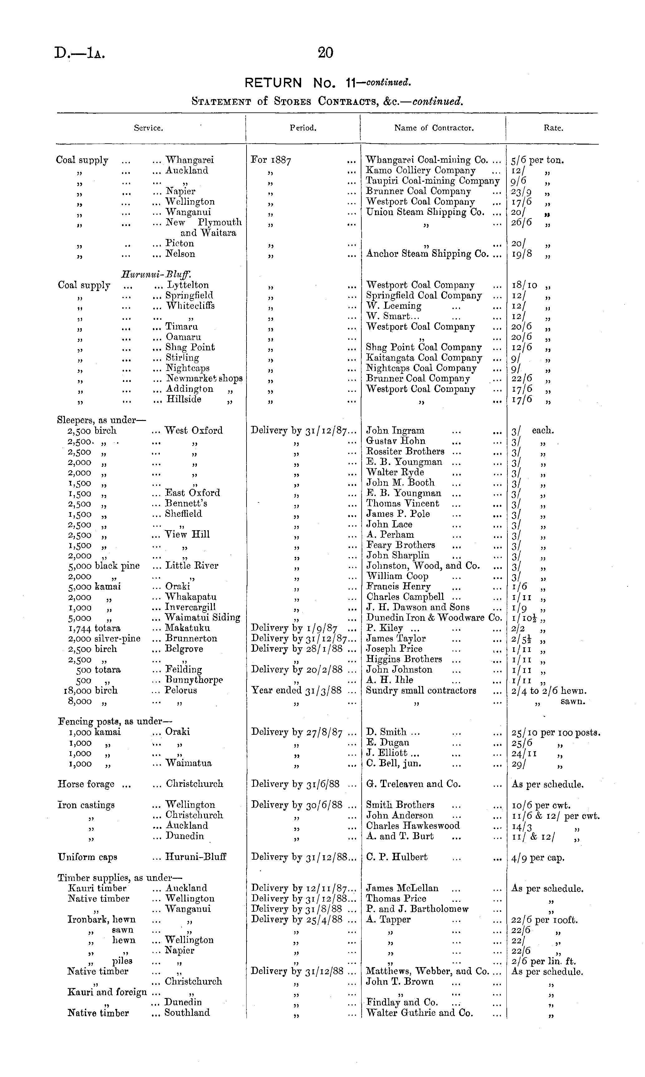 Service. Period. Name of Contractor. Rate. Coal supply ... ... Whangarei „ ... ... Auckland For 1887 Whangarei Coal-mining Co. ... Kamo Colliery Company Tmipiri Coal-mining Company B runner Coal Company Westport Coal Company Union Steam Shipping Co. ... 5/6 per ton. 12/ 9/6 „ 23/9 » 17/6 „ 20/ „ 26/6 „ 3 , ,, ... ... ,, ,, ... ... Napier „ ... ... Wellington „ ... ... Wanganui „ ... ... New Plymouth and Waitara „ .. ... Picton Nelson j, ... *> ,, ,, j, ... jj ,, .. ■ ,, ... Anchor Steam Shipping Co. ... 20/ „ 19/8 „ j) ... Hurunui- Bluff. Coal supply ... ... Lyttelton „ ... ... Springfield Whitecliffs ,, ... Westport Coal Company Springfield Coal Company W. Leeming W. Smart... Westport Coal Company 18/10 „ 12/ „ 12/ „ 12/ „ 20/6 „ 20/6 „ 12/6 „ 9/ 9/ 22/6 „ 17/6 „ 17/6 „ j, j> „ ... ... Timaru „ ... ... Oamaru ... Shag Point „ ... ... Stirling ), ... ... Nightcaps ... Newmarket shops „ ... ... Addington „ „ Hillside „ 5) ,, 3> • ■ ' jj ... Shag Point Coal Company ... Kaitangata Coal Company ... Nightcaps Coal Company Brunner Coal Company Westport Coal Company jj ... ,, ,, )> ■•• jj ... Sleepers, as under — 2,500 birch. ... West Oxford 2,500. „ . ... „ 2,500 „ ... „ 2,000 ,, ... „ 2,000 „ ... „ 1,500 „ 1,500 „ ... East Oxford 2,500 „ ... Bennett's 1,500 „ ... Sheffield 2,500 „ ... „ 2,500 ,, ... View Hill 1,500 „ ... „ 2,000 ,, ... ,, 5,000 black pine ... Little River 2,000 5,000 kamai ... Oraki 2,000 „ ... Whakapatu 1,000 „ ... Invercargill 5,000 ,, ... Waimatui Siding 1,744 totara ... Makatuku 2,000 silver-pine ... Brunnerton 2,500 birch ... Belgrove 2,500 „ ... ,, 500 totara ... Feilding 500 ,, ... Bunnythorpe 18,000 birch ... Pelorus 8,000 „ „ Delivery by 31/12/87... tTohn Ingram ... ... Grustav Holm Eossiter Brothers ... E. B. Toungman ... Walter Hyde John M. Booth K. B. Youngman ... Thomas Vincent James P. Polo John Lace A.. Perham Feary Brothers John Sharplin Johnston, Wood, and Co. William Coojj Francis Henry Charles Campbell ... J. H. Dawson and Sons Dunedin Iron & Woodware Co. P. Kiley ... James Taylor Joseph Price Higgins Brothers John Johnston A. H. Ihle Sundry small contractors 3/ each. 3/ ,. ■ 3/ ;; 3 „ 3/ „ 3/ 3/ ;; 3 „ 3 „ 3 „ 3 „ 3/ 3/ „ 3 „ 3/ 1/6 » I/";; 1/9 » i/iol,, 2/2 „ 2/5i >, 1/11 „ 1/11 „ 1/11 „ i/u „ 2/4 to 2/6 hewn. ,, sawn. Delivery by 1/9/87 ... Delivery by 31/12/87.., Delivery by 28/1/88 ... Delivery by 20/2/88 ... Year ended 31/3/88 ... j, jj Fencing postB, as under — 1,000 kamai ...Oraki 1,000 „ ... „ 1,000 ,, ... ,, 1,000 „ ... Waimatua Delivery by 27/8/87 ... „ D. Smith ... E. Dugan J.Elliott... C. Bell, jun. 25/10 per 100 posts 25/6 24/11 „ 29/ jj jj ... Horse forage ... ... Christclmrch Delivery by 31/6/88 ... Q-. Treleaven and Co. As per schedule. iron castings ... Wellington ... Christchurcli ... Auckland ... Dunedin Delivery by 30/6/88 ... Smith Brothers John Anderson Charles Hawkeswood A. and T. Burt 10/6 per cwb. 11/6 & 12/ per cwt, H/3 11/ & 12/ ,, Uniform caps ... Huruni-BIuff Delivery by 31/12/88... C. P. Hulbert 4/9 per cap. Timber supplies, as under— Kauri timber ...Auckland Native timber ...Wellington ,, ... Wanganui Ironbark, hewn ... ,, Delivery by 12/11/87... Delivery by 31/12/88... Delivery by 31/8/88 ... Delivery by 25/4/88 ... James McLellan Thomas Price P. and J. Bartholomew A. Tapper As per schedule. „ sawn ... „ ,, hewn ... Wellington ,, „ ... Napier „ piles ... „ Native timber ... ,, „ ... Christchurch Kauri and foreign ... ,, „ ... Dunedin Native timber ... Southland jj 22/6 per looffc. 22/6 „ 22/ „ 22/6 2/6 per lin. ft. As per schedule. jj Delivery by 31/12/88 ... Matthews, Webber, and Co. ... John T. Brown >> Findlay and Co. Walter Guthrie and Co. )J f)