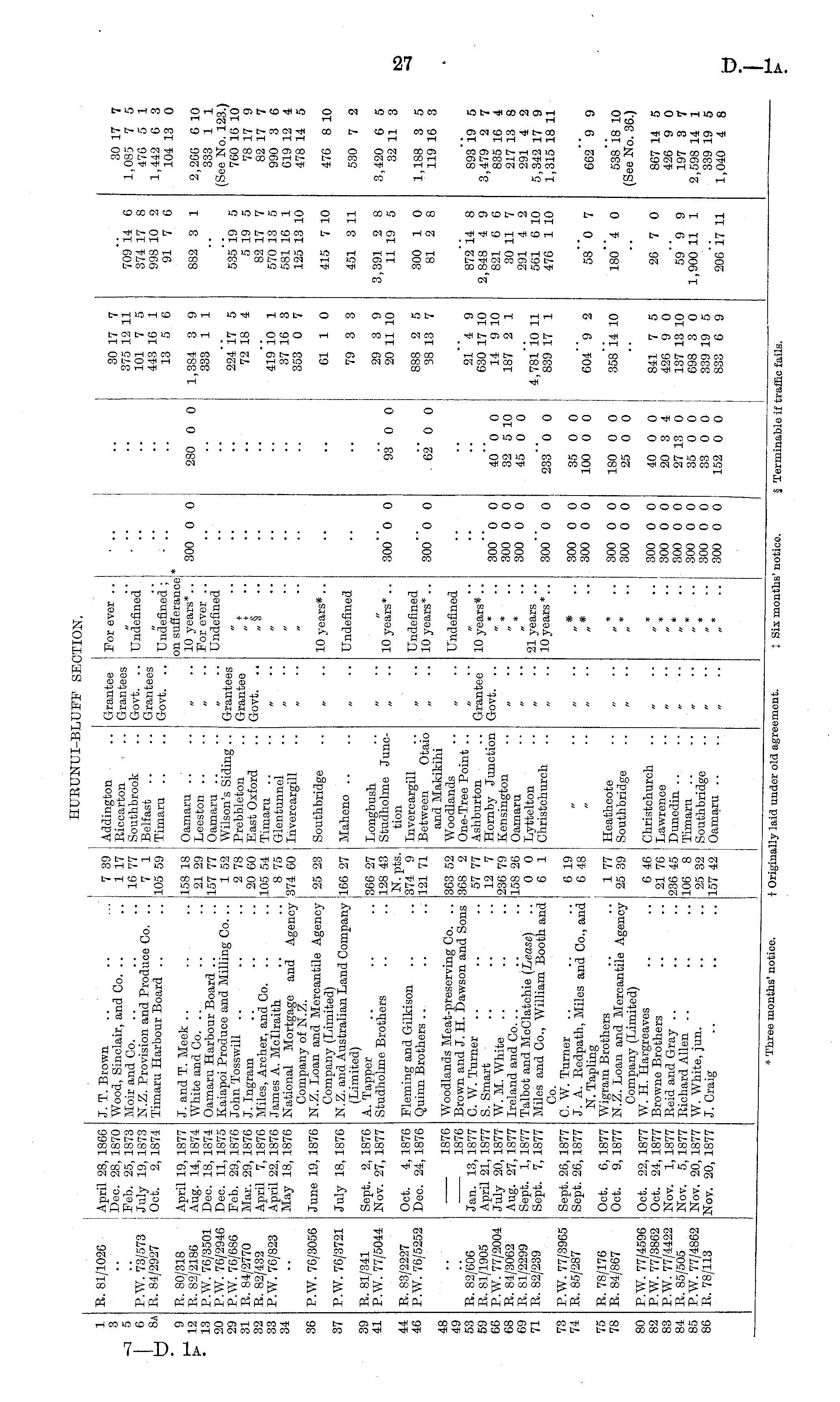 JTION. 1 3 5 6 8a E. 81/102G April 28, 1866 Dec. 28, 1870 Feb. 25, 1873 July 19, 1873 Oct. 2, 1874 J. T. Brown Wood, Sinclair, and Co. .. Moir and Go. N.Z. Provision and Produce Go. .. Tirnaru Harbour Board .. 7 39 1 17 16 77 7 1 105 59 Addington Riccarton . .. Southbrook Belfast Timaru Grantee Grantees Govt. .. Grantees Govt. .. For ever .. P.W. 73/573 R. 84/2927 Undefined 30 17 7 375 12 11 101 7 5 443 16 1 13 5 6 709 14 6 374 17 8 998 10 2 91 7 6 30 17 7 1,085 7 5 476 5 1 1,442 6 3 104 13 0 9 12 13 20 29 31 32 33 34 R. 80/318 R. 82/2186 P.W. 76/3501 P.W. 76/2946 P.W. 76/686 R. 84/2770 R. 82/432 P.W. 76/823 April 19, 1877 Aug. 14, 1874 Dec. 18, 1874 Dec. 11, 1875 Feb. 29, 1876 Mar. 29, 1876 April 7, 1876 April 22, 1876 May 18, 1876 J. and T. Meek .. White and Go. .. Oamaru Harbour Board Kaiapoi Produce and Milling Co. .. John Tosswill J. Ingram Miles, Archer, and Co. James A. Mcllraith National Mortgage and Agency Company of N.Z. N.Z. Loan and Mercantile Agency Company (Limited) N.Z. and Australian Land Company (Limited) A. Tapper Studholme Brothers 158 18 21 29 157 77 1 52 2 78 20 60 105 54 8 75 374 60 Oamaru Leeston Oamaru Wilson's Siding .. Prebbleton East Oxford Timaru Glentunnel Invercargill Undefined ; on sufferance 10 years*.. For ever .. Undefined 300 0 0 280 0 0 1,384 3 9 333 1 1 882 3 1 2,266 0 10 333 1 1 (See No. 123.) 760 16 10 78 17 9 82 17 7 990 3 6 C19 12 4 478 14 5 Grantees Grantee Govt. .. -. •■ + 224 17 5 72 18 4 535 19 5 5 19 5 82 17 7 570 13 5 581 16 1 125 13 10 ..-. • •• 419 10 1 37 16 3 353 0 7 36 P.W. 76/3056 June 19, 1876 25 23 Southbridge 10 years*.. 61 1 0 415 7 10 476 8 10 37 P.W. 76/3721 July 18, 1876 |166 27 Maheno Undefined 79 3 3 39 41 451 3 11 530 7 2 R. 81/341 P.W. 77/5044 Sept. 2, 1876 Nov. 27, 1877 366 27 128 43 N. pts. 374 9 121 71 Longbush Studholme Junction Invercargill Between Otaio and Makikihi Woodlands One-Tree Point .. Ashburton Hornby Junction Kensington Oamaru Lyttelton Christchurch 10 years* .. 300"o 0 93' 0 0 29 3 9 20 11 10 3,391 2 8 11 19 5 3,420 6 5 32 11 3 44 46 E. 83/2227 P.W. 76/5252 Oct. 4, 1876 Dec. 24, 1876 Fleming and Gilkison Quinn Brothers Undefined 10 years* .. 300 0 0 62 0 0 888 2 5 38 13 7 300 1 0 81 2 8 1,188 3 5 119 16 3 48 49 53 59 66 68 69 71 R. 82/606 R. 81/1905 P.W. 77/2004 R. 84/3062 R. 81/2299 R. 82/239 1876 1876 Jail. 13, 1877 April 21, 1877 July 20, 1877 Aug. 27, 1877 Sept. 1, 1877 Sept. 7, 1877 Woodlands Meat-preserving Co. .. Brown and J. H. Dawson and Sons C. W. Turner .. S. Smart w. m. white .. .. ;; Ireland and Co. .. Talbot and McGlatchie (Lease) Miles and Co., William Booth and Co. C. W. Turner J. A. Bedpath, Miles and Co., and N. Tapling Wigram Brothers N.Z. Loan and Mercantile Agency Company (Limited) W. H. Hargreaves Browne Brothers Reid and Gray Richard Allen W. White, jun. .. " J. Craig 363 52 368 2 57 77 12 7 236 79 158 26 0 0 6 1 Grantee Govt. .. Undefined 10 years* .. 300 0 0 300 0 0 300 0 0 40 0 0 32 5 10 45 0 0 21 4 9 630 17 10 14 9 10 187 2 1 872 14 8 2,848 4 9 821 6 6 30 11 7 291 4 2 561 6 10 476 1 10 893 19 5 3,479 2 7 835 16 4 217 13 8 291 4 2 5,342 17 9 1,315 18 11 * 21 years .. 10 years *.. 300 0 0 233 0 0 4,781 10 11 839 17 1 73 74 P.W. 77/3965 R. 85/287 Sept. 26, 1877 Sept. 26, 1877 6 19 6 48 # 300 0 0 300 0 0 35 0 0 100 0 0 604 9 2 58"0 7 662 9 9 75 78 # R. 78/176 R. 84/867 Oct. 6, 1877 Oct. 9, 1877 1 77 25 39 Heathcote Southbridge ■: -j 300 0 0 300 0 0 180 0 0 25 0 0 358 14 10 180 4 0 538 18 10 (See No. 36.) 80 82 83 84 85 86 P.W. 77/4596 P.W. 77/3862 P.W. 77/4422 R. 85/505 P.W. 77/4862 R. 78/113 Oct. 22, 1877 Oct. 24, 1877 Nov. 1, 1877 Nov. 5, 1877 Nov. 20, 1877 Nov. 20, 1877 .. I 6 46 21 76 236 45 106 8 25 32 157 42 Christchurch Lawrence Dunedin Timaru Southbridge Oamaru * 300 0 0 300 0 0 300 0 0 300 0 0 300 0 0 300 0 0 40 0 0 20 3 4 27 13 0 35 0 0 33 0 0 152 0 0 841 7 5 426 9 0 137 13 10 698 3 0 339 19 5 833 6 9 26 7 0 59 9 9 1,900 11 1 867 14 5 426 9 0 197 3 7 2,598 14 1 339 19 5 1,040 4 8 :* -! * 206 17 11 * Three mouths' notice. i Originally laid under old agreement. f Six months' notice. Termi