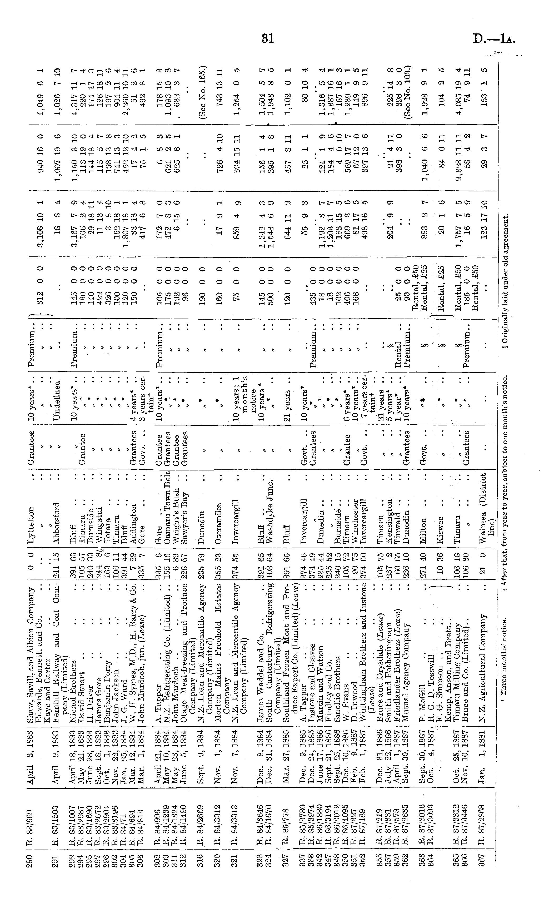 290 E. 83/669 April 3, 1883 Shaw, Savill, and Albion Company Edwards, Bennett, and Co. Kayo and Garter Fernhill Eailway and Coal Company (Limited) Nichol Brothers David Stuart H. Driver James Gore Benjamin Perry John Jackson J. G. Ward W. H. Symes, M.D., H. Barry & Co. John Murdoch, jun. (Lease) 0 0 Lyttelton Grantees 10 years*.. Premium.. [ 312 0 0 3,108 10 1 940 16 0 4,049 0 1 291 E. 83/1503 April 9, 1883 241 15 Abbotsford Undefined 18 8 4 1,007 19 6 1,026 7 10 292 294 295 297 298 302 304 305 306 E. 83/1007 R. 83/2987 E. 83/1690 E. 83/2672 R. 83/2904 E. 83/3196 R. 84/71 E. 84/694 R. 84/813 April 18, 1883 May 31, 1883 June 28, 1883 Sept. 18, 1883 Oct. 1, 18S3 Nov. 22, 1883 Jan. 25, 1884 Mar. 12, 1884 Mar. 1, 1884 391 63 105 57 240 33 244 8^ 163 6" 106 11 391 44 7 29 335 7 Bluff Timaru Burnside Wingatui . < Totara Timaru Bluff Addington Gore Grantee 10 years*.. # 4 years* .. 3 years certain! 10 years* .. * Premium.. 145 0 0 130 0 0 140 0 0 422 0 0 326 0 0 100 0 0 120 0 0 150 0 0 3,167 7 9 106 2 4 29 18 11 11 13 4 3 8 10 162 18 1 1,807 18 1 33 18 4 417 6 8 1,150 3 10 113 19 0 144 18 4 115 5 7 193 13 8 741 13 3 452 12 10 17 4 2 75 1 5 4,317 11 7 220 1 4 174 17 3 126 18 11 197 2 6 904 11 4 2,260 10 11 51 2 6 492 8 1 Grantees Govt. .. 308 309 311 312 R. 84/996 E. 84/1239 E. 84/1324 E. 84/1490 April 21, 1884 May 10, 1884 May 23, 1884 June 5, 1884 A. Tapper N.Z. Refrigerating Co. (Limited) .. John Murdoch Otago Meat-freezing and Produce Company (Limited) N.Z. Loan and Mercantile Agency Company (Limited) Morton Mains Freehold Estates Company N.Z. Loan and Mercantile Agency Company (Limited) 335 6 155 16 6 39 228 67 Gore Oamaru Town Belt Wright's Bush .. Sawyer's Bay Grantee Grantees Grantee Grantees Premium.. 105 0 0 175 0 0 192 0 0 96 0 0 172 7 0 472 8 3 6 15 6 6 8 3 621 2 5 625 8 1 178 15 3 1,093 10 8 . 632 3 7 316 E. 84/2669 Sept. 9.1S84 235 79 Dunedin * 190 0 0 (See No. 165.) 320 E. 84/3312 Nov. 1, 1884 355 23 Oteramika * 160 0 0 17 9 1 72G 4 10 743 13 11 321 E. 84/3313 Nov. 7, 1884 374 55 Invercargill 10 years; 1 month's notice 10 years * 75 0 0 859 4 9 3P4 15 11 1,254 0 5 323 324 R. 84/3646 E. 84/1670 Dee. 8, 1884 Deo. 31, 1884 James Waddel and Co. South Canterbury Refrigerating Company (Limited) Southland Frozen Meat and Produce Export Co. (Limited) (Lease) A. Tapper Instone and Cleaves Martin and Watson Findlay and Co. Smellie Brothers W. Evans D. Inwood Whittingham Brothers and Instone (Lease) Bruce and Drysdale (Lease) Smith and Fotheringham Friedlander Brothers (Lease) Mutual Agency Company J391 65 103 64 Bluff Washdyke Juno. 145 0 0 500 0 0 1,3:13 4 3 1,548 6 9 156 1 4 395 1 8 1,504 5 7 1,943 8 5 327 R. 85/778 Mar. 27, 1885 391 65 Blufi 21 years .. 120 0 0 644 11 2 457 8 11 1,102 0 1 337 338 342 347 348 350 351 352 R. 85/3780 E. 85/3974 E. 86/1880 E. 86/3194 E. 86/3012 R. 86/4095 E. 87/327 R. 87/189 Dec. 9, 1885 Dec. 24, 1885 June 17, 1886 Sept. 21, 1886 Sept. 25, 1886 Dec. 10, 1886 Feb. 9, 1887 Feb. 1, 1887 374 46 374 49 235 44 235 52 240 15 105 72 90 75 374 60 Invercargill Dunedin Burnside Timaru Winchester Invercargill Govt. .. Grantees 10 years* * * 6 years* .. 10 years*.. 7yearscertainf 21 years .. 5 years* .. 1 year* 10 years* Premium.. 435 0 0 18 0 0 18 0 0 102 0 0 406 0 0 168 0 0 55 9 3 1,192 3 7 1,203 11 7 183 15 5 669 3 6 81 17 5 498 16 5 25 1 1 124 1 9 184 4 6 4 0 10 569 17 7 67 12 0 397 13 6 80 10 4 1,316 5 4 1,387 16 1 187 16 3 1,239 1 1 149 9 5 896 9 11 Grantee Govt. .. 355 357 359 362 E. 87/219 R. 87/331 R. 87/578 E. 87/2S35 Dec. 31, 1886 July 22, 1886 April 1, 1887 Sept. 30, 1887 105 75 237 2 60 65 236 10 Timaru Kensington Tinwald .. Dunedin Rental Premium.. 25 0 0 90 0 0 Rental, £50 Rental, £25 204"9 9 21 4 11 398 3 0 225 14 8 398 3 0 (See No. 103.) Grantees 363 364 R. 87/3016 E. 87/3093 Sept. 30, 1887 Oct. 4,1887P. McGill R, G. D. Tosswill .. ) F. G. Simpson .. .. I Kemp, Anson, and Brett.. Timaru Milling Company Bruce and Co. (Limited) 271 40 Milton Govt. .. «# § | Rental, £25 Rental, £50 185 0 0 Rental, £50 883 2 7 1,040 6 6 1,923 9 1 10 36 Kirwee § 20 1 6 84 0 11 104 2 5 365 366 E. 87/3312 E. 87/3446 Oct. 25, 1887 Nov. 10, 1887 106 18 106 30 Timaru .. Grantees * Premium.. 1,757 7 5 16 5 9 2,328 11 11 58 4 2 4,085 19 4 74 9 11 367 E. 87/2S68 Jan. 1, 1881 N.Z. Agricultural Company 21 0 Waimea (District line) 123 17 10 29 3 7 153 1 5 * Three months' notice. ■\ After that, from year to year, subject to one month's notice. § Originally laid under old agreement.