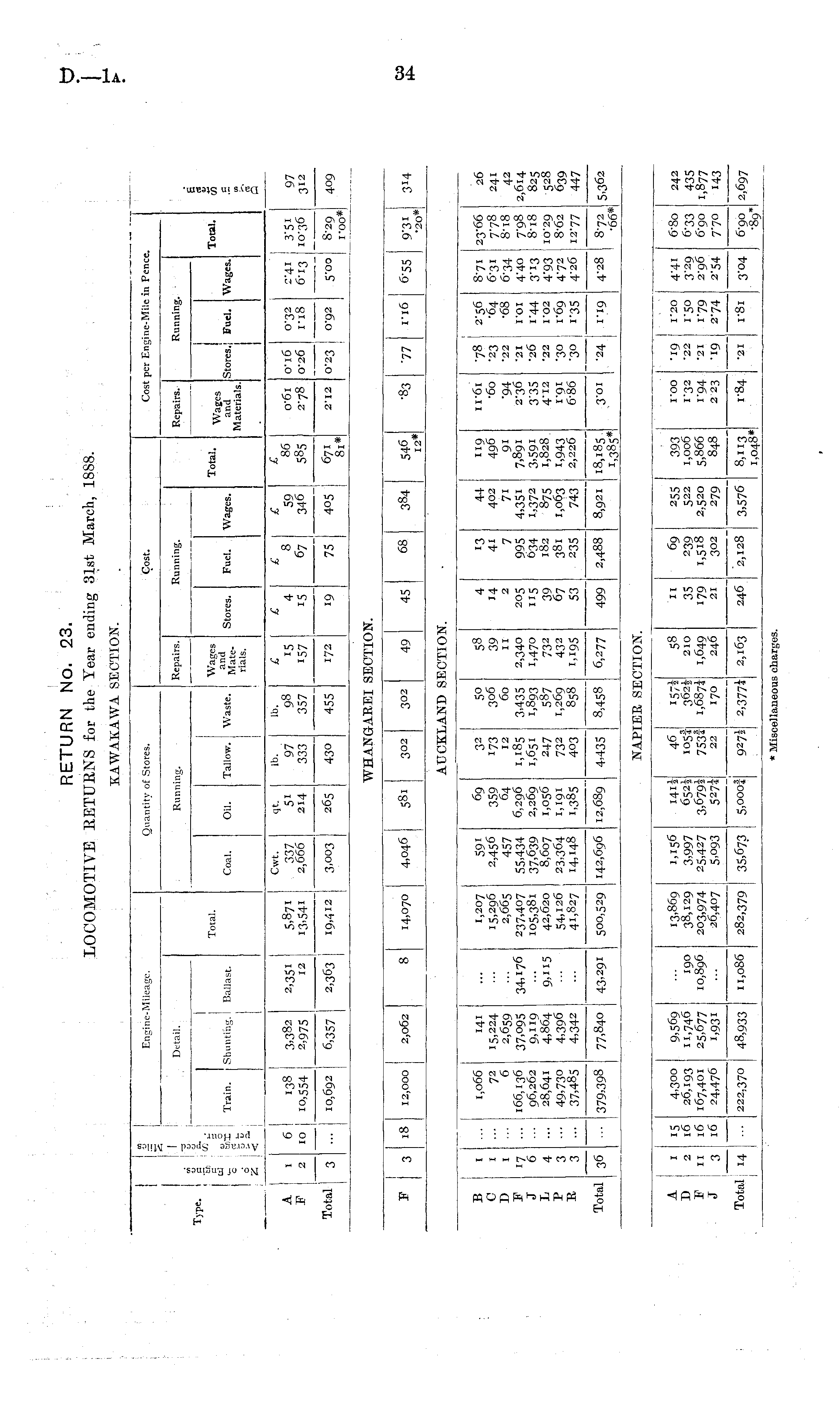 RETURN NO. 23. LOCOMOTIVE RETURNS for the Year ending 31st March, 1888. KAWAKAWA SECTION.