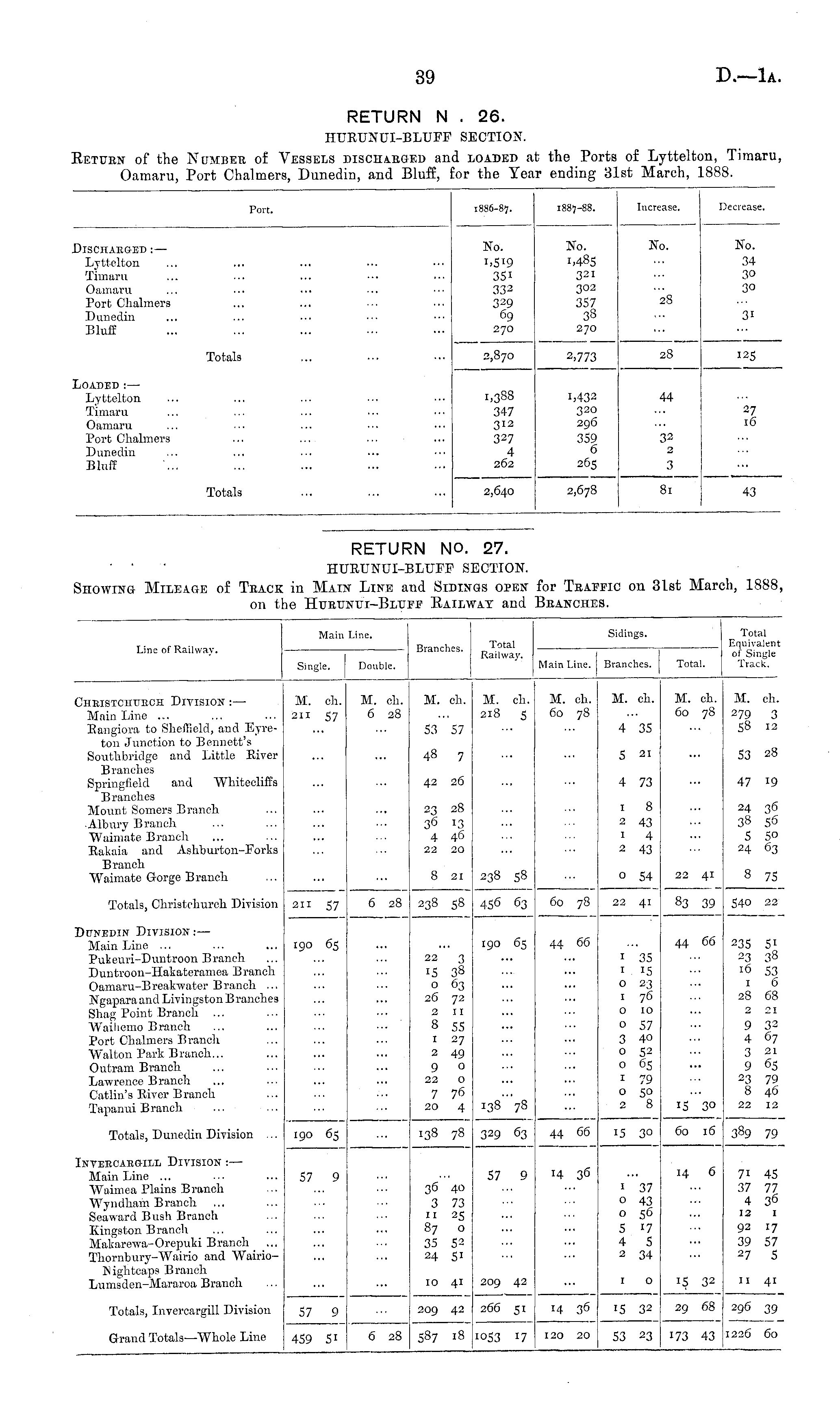 RETURN No. 26. HURUNUI-BLUFF SECTION. Return of the Number of Vessels discharged and loaded at the Ports of Lyttelton, Timaru, Oamaru, Port Chalmers, Dunedin, and Bluff, for the Year ending 31st March, 1888.
