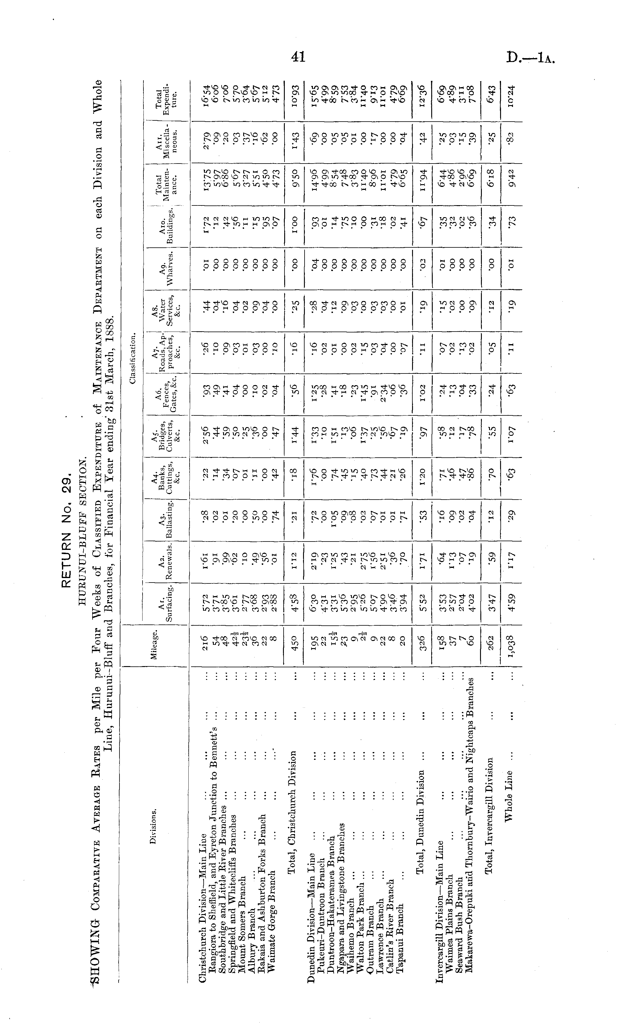 RETURN No. 29. HURUNUI-BLUFF SECTION. SHOWING Comparative Average Rates per Mile per Four Weeks of Classified Expenditure of Maintenance Department on each Division and Whole Line, Hurunui -Bluff and Branches, for Financial Year ending 31st March, 1888.
