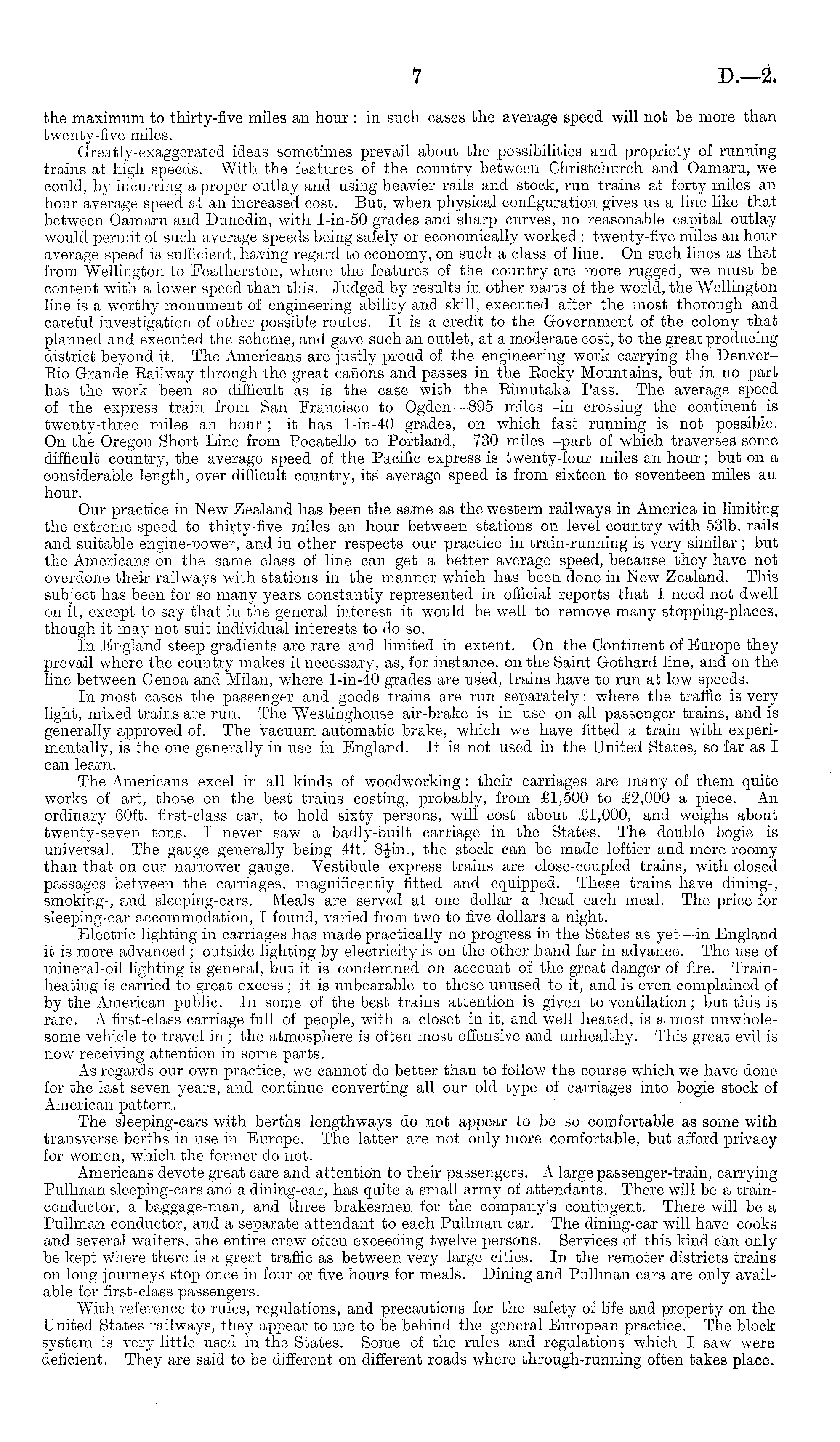 the maximum to thirty-five miles an hour : in such cases the average speed will not be more than twenty-five miles. Greatly-exaggerated ideas sometimes prevail about the possibilities and propriety of running trains at high speeds. With the features of the country between Christchurch and Oamaru, we could, by incurring a proper outlay and using heavier rails and stock, run trains at forty miles an hour average speed at an increased cost. But, when physical configuration gives us a line like that between Oamaru and Dunedin, with l-in-50 grades and sharp curves, no reasonable capital outlay would permit of such average speeds being safely or economically worked : twenty-five miles an hour average speed is sufficient, having regard to economy, on such a class of line. On such lines as that from Wellington to Featherston, where the features of the country are more rugged, we must be content with a lower speed than this. Judged by results in other parts of the world, the Wellington line is a worthy monument of engineering ability and skill, executed after the most thorough and careful investigation of other possible routes. It is a credit to the Government of the colony that planned and executed the scheme, and gave such an outlet, at a moderate cost, to the great producing district beyond it. The Americans are justly proud of the engineering work carrying the DenverBio Grande Bailway through the great canons and passes in the Eocky Mountains, but in no part has the work been so difficult as is the case with the Eimutaka Pass. The average speed of the express train from San Francisco to Ogden—B9s miles—in crossing the continent is twenty-three miles an hour ; it has l-in-40 grades, on which fast running is not possible. On the Oregon Short Line from Pocatello to Portland, —730 miles—part of which traverses some difficult country, the average speed of the Pacific express is twenty-four miles an hour; but on a considerable length, over difficult country, its average speed is from sixteen to seventeen miles an hour. Our practice in New Zealand has been the same as the western railways in America in limiting the extreme speed to thirty-five miles an hour between stations on level country with 531b. rails and suitable engine-power, and in other respects our practice in train-running is very similar ; but the Americans on the same class of line can get a better average speed, because they have not overdone their railways with stations in the manner wdiich has been done in New Zealand. This subject has been for so many years constantly represented in official reports that I need not dwell on it, except to say that in the general interest it would be well to remove many stopping-places, though it may not suit individual interests to do so. In England steep gradients are rare and limited in extent. On the Continent of Europe they prevail where the country makes it necessary, as, for instance, on the Saint Gothard line, and on the line between Genoa and Milan, where l-in-40 grades are used, trains have to run at low speeds. In most cases the passenger and goods trains are run separately: where the traffic is very light, mixed trains are run. The Westinghouse air-brake is in use on all passenger trains, and is generally approved of. The vacuum automatic brake, which we have fitted a train with experimentally, is the one generally in use in England. It is not used in the United States, so far as I can learn. The Americans excel in all kinds of woodworking : their carriages are many of them quite works of art, those on the best trains costing, probably, from £1,500 to £2,000 a piece. An ordinary 60ft. first-class car, to hold sixty persons, will cost about £1,000, and weighs about twenty-seven tons. I never saw a badly-built carriage in the States. The double bogie is universal. The gauge generally being 4ft. 8-|in., the stock can be made loftier and more roomy than that on our narrower gauge. Vestibule express trains are close-coupled trains, with closed passages between the carriages, magnificently fitted and equipped. These trains have dining-, smoking-, and sleeping-cars. Meals are served at one dollar a head each meal. The price for sleeping-car accommodation, I found, varied from two to five dollars a night. Electric lighting in carriages has made practically no progress in the States as yet—in England it is more advanced ; outside lighting by electricity is on the other hand far in advance. The use of mineral-oil lighting is general, but it is condemned on account of the great danger of fire. Trainheating is carried to great excess; it is unbearable to those unused to it, and is even complained of by the American public. In some of the best trains attention is given to ventilation; but this is rare. A first-class carriage full of people, with a closet in it, and well heated, is a most unwholesome vehicle to travel in ; the atmosphere is often most offensive and unhealthy. This great evil is now receiving attention in some parts. As regards our own practice, we cannot do better than to follow the course which we have done for the last seven years, and continue converting all our old type of carriages into bogie stock of American pattern. The sleeping-cars with berths lengthways do not appear to be so comfortable as some with transverse berths in use in Europe. The latter are not only more comfortable, but afford privacy for women, which the former do not. Americans devote great care and attention to their passengers. A large passenger-train, carrying Pullman sleeping-cars and a dining-car, has quite a small army of attendants. There will be a trainconductor, a baggage-man, and three brakesmen for the company's contingent. There will be a Pullman conductor, and a separate attendant to each Pullman car. The dining-car will have cooks and several waiters, the entire crew often exceeding twelve persons. Services of this kind can only be kept where there is a great traffic as between very la