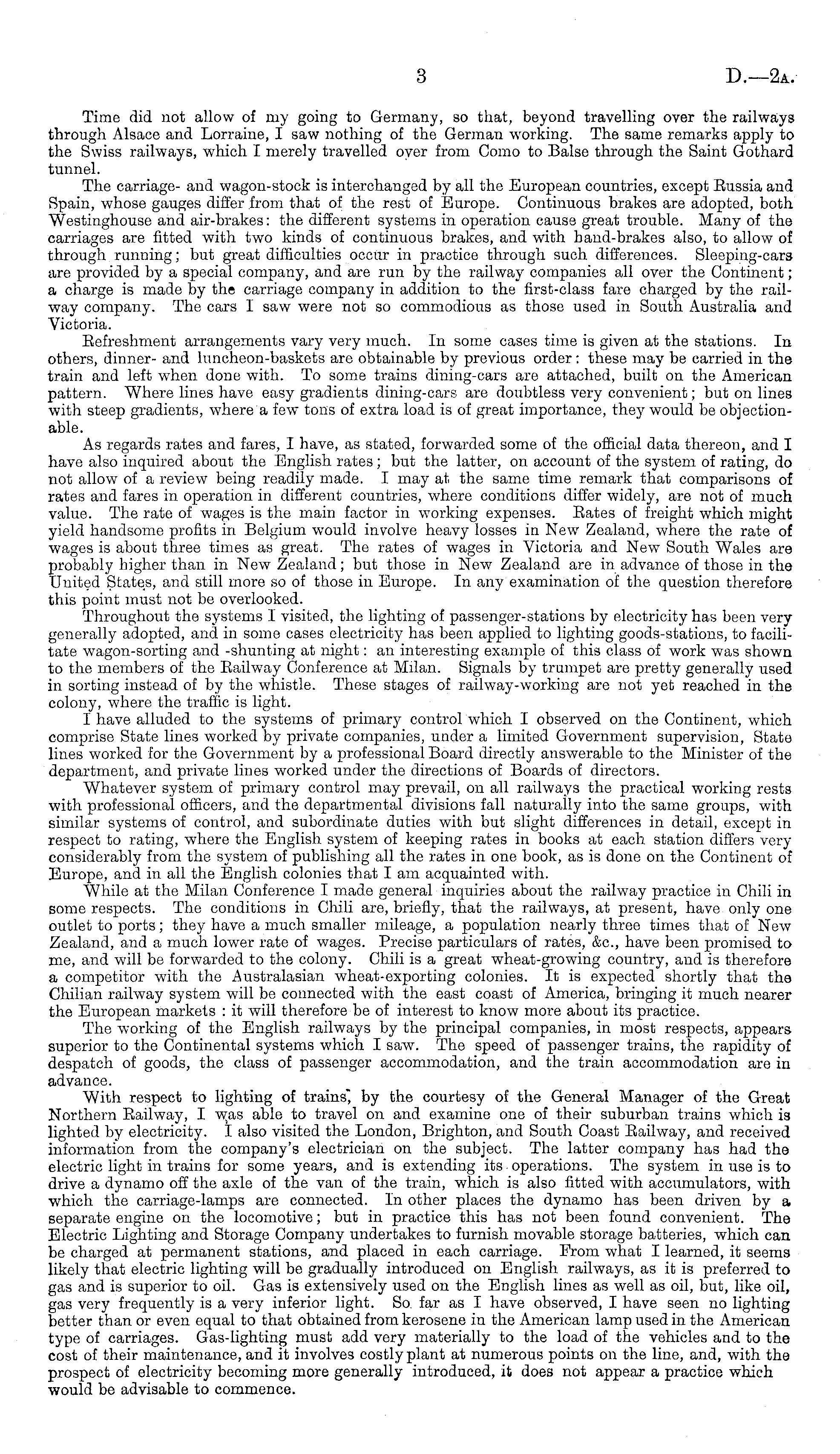 Time did not allow of my going to Germany, so that, beyond travelling over the railways through Alsace and Lorraine, I saw nothing of the German working. The same remarks apply to the Swiss railways, which I merely travelled over from Como to Balse through the Saint Gothard tunnel. The carriage- and wagon-stock is interchanged by all the European countries, except Russia and Spain, whose gauges differ from that of the rest of Europe. Continuous brakes are adopted, both Westinghouse and air-brakes: the different systems in operation cause great trouble. Many of the carriages are fitted with two kinds of continuous brakes, and with hand-brakes also, to allow of through running; but great difficulties occur in practice through such differences. Sleeping-cars are provided by a special company, and are run by the railway companies all over the Continent; a charge is made by the carriage company in addition to the first-class fare charged by the railway company. The cars I saw were not so commodious as those used in South Australia and Victoria. Refreshment arrangements vary very much. In some cases time is given at the stations. la others, dinner- and luncheon-baskets are obtainable by previous order : these may be carried in the train and left when done with. To some trains dining-cars are attached, built on the American pattern. Where lines have easy gradients dining-cars are doubtless very convenient; but on lines with steep gradients, where a few tons of extra load is of great importance, they would be objectionable. As regards rates and fares, I have, as stated, forwarded some of the official data thereon, and I have also inquired about the English rates ; but the latter, on account of the system of rating, do not allow of a review being readily made. I may at. the same time remark that comparisons of rates and fares in operation in different countries, where conditions differ widely, are not of much value. The rate of wages is the main factor in working expenses. Rates of freight which might yield handsome profits in Belgium would involve heavy losses in New Zealand, where the rate of wages is about three times as great. The rates of wages in Victoria and New South Wales are probably higher than in New Zealand; but those in New Zealand are in advance of those in the United States, and still more so of those in Europe. In any examination of the question therefore this point must not be overlooked. Throughout the systems I visited, the lighting of passenger-stations by electricity has been very generally adopted, and in some cases electricity has been applied to lighting goods-stations, to facilitate wagon-sorting and -shunting at night: an interesting example of this class of work was shown to the members of the Railway Conference at Milan. Signals by trumpet are pretty generally used in sorting instead of by the whistle. These stages of railway-working are not yet reached in the colony, where the traffic is light. I have alluded to the systems of primary control which I observed on the Continent, which comprise State lines worked by private companies, under a limited Government supervision, State lines worked for the Government by a professional Board directly answerable to the Minister of the department, and private lines worked under the directions of Boards of directors. Whatever system of primary control may prevail, on all railways the practical working rests with professional officers, and the departmental divisions fall naturally into the same groups, with similar systems of control, and subordinate duties with but slight differences in detail, except in respect to rating, where the English system of keeping rates in books at each station differs very considerably from the system of publishing all the rates in one book, as is done on the Continent of Europe, and in all the English colonies that I am acquainted with. While at the Milan Conference I made general inquiries about the railway practice in Chili in some respects. The conditions in Chili are, briefly, that the railways, at present, have only one outlet to ports; they have a much smaller mileage, a population nearly three times that of New Zealand, and a much lower rate of wages. Precise particulars of rates, &c, have been promised to me, and will be forwarded to the colony. Chili is a great wheat-growing country, and is therefore a competitor with the Australasian wheat-exporting colonies. It is expected shortly that the Chilian railway system will be connected with the east coast of America, bringing it much nearer the European markets : it will therefore be of interest to know more about its practice. The working of the English railways by the principal companies, in most respects, appears superior to the Continental systems which I saw. The speed of passenger trains, the rapidity of despatch of goods, the class of passenger accommodation, and the train accommodation are in advance. With respect to lighting of trains" by the courtesy of the General Manager of the Great Northern Railway, I w,as able to travel on and examine one of their suburban trains which is lighted by electricity. I also visited the London, Brighton, and South Coast Railway, and received information from the company's electrician on the subject. The latter company has had the electric light in trains for some years, and is extending its operations. The system in use is to drive a dynamo off the axle of the van of the train, which is also fitted with accumulators, with which the carriage-lamps are connected. In other places the dynamo has been driven by a separate engine on the locomotive; but in practice this has not been found convenient. The Electric Lighting and Storage Company undertakes to furnish movable storage batteries, which can be charged at permanent stations, and placed in each carriage. From what I learned, it seems likely that electric lighting will be gradually introduced on English railways, as it is preferred to gas and is superior