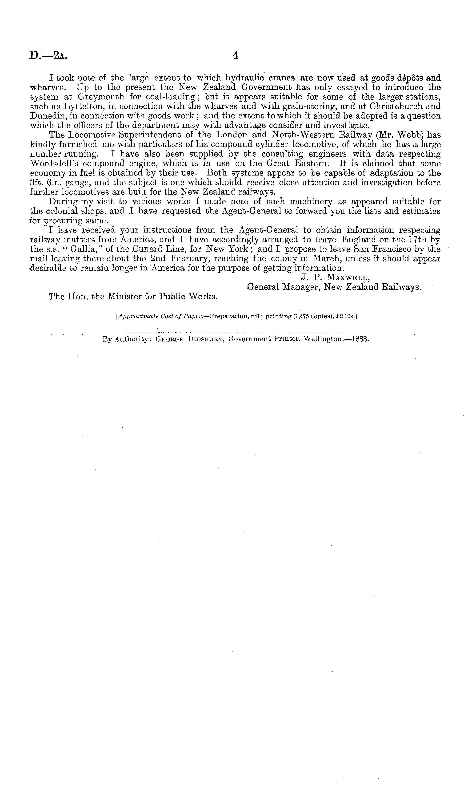 I took note of the large extent to which hydraulic cranes are now used at goods depots and wharves. Up to the present the New Zealand Government has only essayed to introduce the system at Greymouth for coal-loading ; but it appears suitable for some of the larger stations, such as Lyttelton, in connection with the wharves and with grain-storing, and at Christchurch and Dunedin, in connection with goods work ; and the extent to which it should be adopted is a question which the officers of the department may with advantage consider and investigate. The Locomotive Superintendent of the London and North-Western Eailway (Mr. Webb) has kindly furnished me with particulars of his compound cylinder locomotive, of which he has a large number running. I have also been supplied by the consulting engineers with data respecting Wordsdell's compound engine, which is in use on the Great Eastern. It is claimed that some economy in fuel is obtained by their use. Both systems appear to be capable of adaptation to the 3ft. 6in. gauge, and the subject is one which should receive close attention and investigation before further locomotives are built for the New Zealand railways. During my visit to various works I made note of such machinery as appeared suitable for the colonial shops, and I have requested the Agent-General to forward you the lists and estimates for procuring same. I have received your instructions from the Agent-General to obtain information respecting railway matters from America, and I have accordingly arranged to leave England on the 17th by the s.s. " Gallia," of the .Cunard Line, for New York ; and I propose to leave San Francisco by the mail leaving there about the 2nd February, reaching the colony in March, unless it should appear desirable to remain longer in America for the purpose of getting information. J. P. Maxwell, General Manager, New Zealand Railways. The Hon. the Minister for Public Works. [Approximate Cost of Paper.— Preparation, nil; printing (1,475 copies), £2 10sj