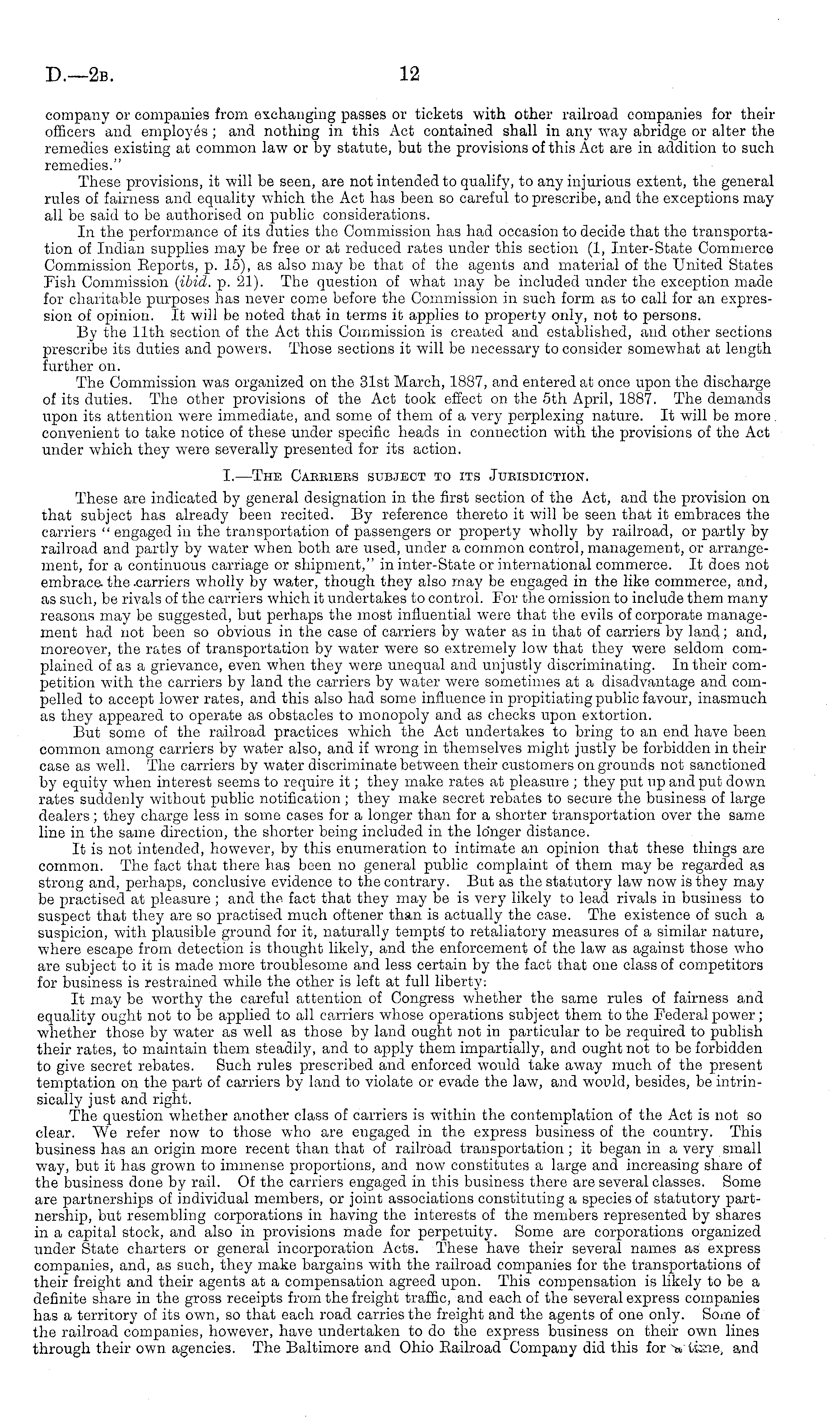 company or companies from exchanging passes or tickets with other railroad companies for their officers and employes ; and nothing in this Act contained shall in any way abridge or alter the remedies existing at common law or by statute, but the provisions of this Act are in addition to such remedies." These provisions, it will be seen, are not intended to qualify, to any injurious extent, the general rules of fairness and equality which the Act has been so careful to prescribe, and the exceptions may all be said to be authorised on public considerations. In the performance of its duties the Commission has had occasion to decide that the transportation of Indian supplies may be free or at reduced rates under this section (1, Inter-State Commerce Commission Eeports, p. 15), as also may be that of the agents and material of the United States Fish Commission (ibid. p. 21). The question of what may be included under the exception made for charitable purposes has never come before the Commission in such form as to call for an expression of opinion. It will be noted that in terms it applies to property only, not to persons. By the 11th section of the Act this Commission is created and established, and other sections prescribe its duties and powers. Those sections it will be necessary to consider somewhat at length further on. The Commission was organized on the 31st March, 1887, and entered at once upon the discharge of its duties. The other provisions of the Act took effect on the sth April, 1887. The demands upon its attention were immediate, and some of them of a very perplexing nature. It will be more convenient to take notice of those under specific heads in connection with the provisions of the Act under which they w rere severally presented for its action. I. —The Caeiueks subject to its Jurisdiction. These are indicated by general designation in the first section of the Act, and the provision on that subject has already been recited. By reference thereto it will be seen that it embraces the carriers " engaged in the transportation of passengers or property wholly by railroad, or partly by railroad and partly by water when both are used, under a common control, management, or arrangement, for a continuous carriage or shipment," in inter-State or international commerce. It does not embrace, the .carriers wholly by water, though they also may be engaged in the like commerce, and, as such, be rivals of the carriers which it undertakes to control. For the omission to include them many reasons may be suggested, but perhaps the most influential were that the evils of corporate management had not been so obvious in the case of carriers by water as in that of carriers by land; and, moreover, the rates of transportation by water were so extremely low that they were seldom complained of as a grievance, even when they were unequal and unjustly discriminating. In their competition with the carriers by land the carriers by water were sometimes at a disadvantage and compelled to accept lower rates, and this also had some influence in propitiating public favour, inasmuch as they appeared to operate as obstacles to monopoly and as checks upon extortion. But some of the railroad practices which the Act undertakes to bring to an end have been common among carriers by water also, and if wrong in themselves might justly be forbidden in their case as well. The carriers by water discriminate between their customers on grounds not sanctioned by equity when interest seems to require it; they make rates at pleasure ; they put up and put down rates suddenly without public notification ; they make secret rebates to secure the business of large dealers; they charge less in some cases for a longer than for a shorter transportation over the same line in the same direction, the shorter being included in the longer distance. It is not intended, however, by this enumeration to intimate an opinion that these things are common. The fact that there has been no general pviblie complaint of them may be regarded as strong and, perhaps, conclusive evidence to the contrary. But as the statutory law now is they may be practised at pleasure ; and the. fact that they may be is very likely to lead rivals in business to suspect that they are so practised much oftener than is actually the case. The existence of such a suspicion, with plausible ground for it, naturally tempts to retaliatory measures of a similar nature, where escape from detection is thought likely, and the enforcement of the law as against those who are subject to it is made more troublesome and less certain by the fact that one class of competitors for business is restrained while the other is left at full liberty: It may be worthy the careful attention of Congress whether the same rules of fairness and equality ought not to be applied to all carriers whose operations subject them to the Federal power; whether those by water as well as those by land ought not in particular to be required to publish their rates, to maintain them steadily, and to apply them impartially, and ought not to be forbidden to give secret rebates. Such rules prescribed and enforced would take away much of the present temptation on the part of carriers by land to violate or evade the Jaw, and would, besides, be intrinsically just and right. The question whether another class of carriers is within the contemplation of the Act is not so clear. We refer now to those who are engaged in the express business of the country. This business has an origin more recent than that of railroad transportation ; it began in a very small way, but it has grown to immense proportions, and now constitutes a large and increasing share of the business done by rail. Of the carriers engaged in this business there are several classes. Some are partnerships of individual members, or joint associations constituting a species of statutory partnership, but resembling corporations in having the interests of the members r