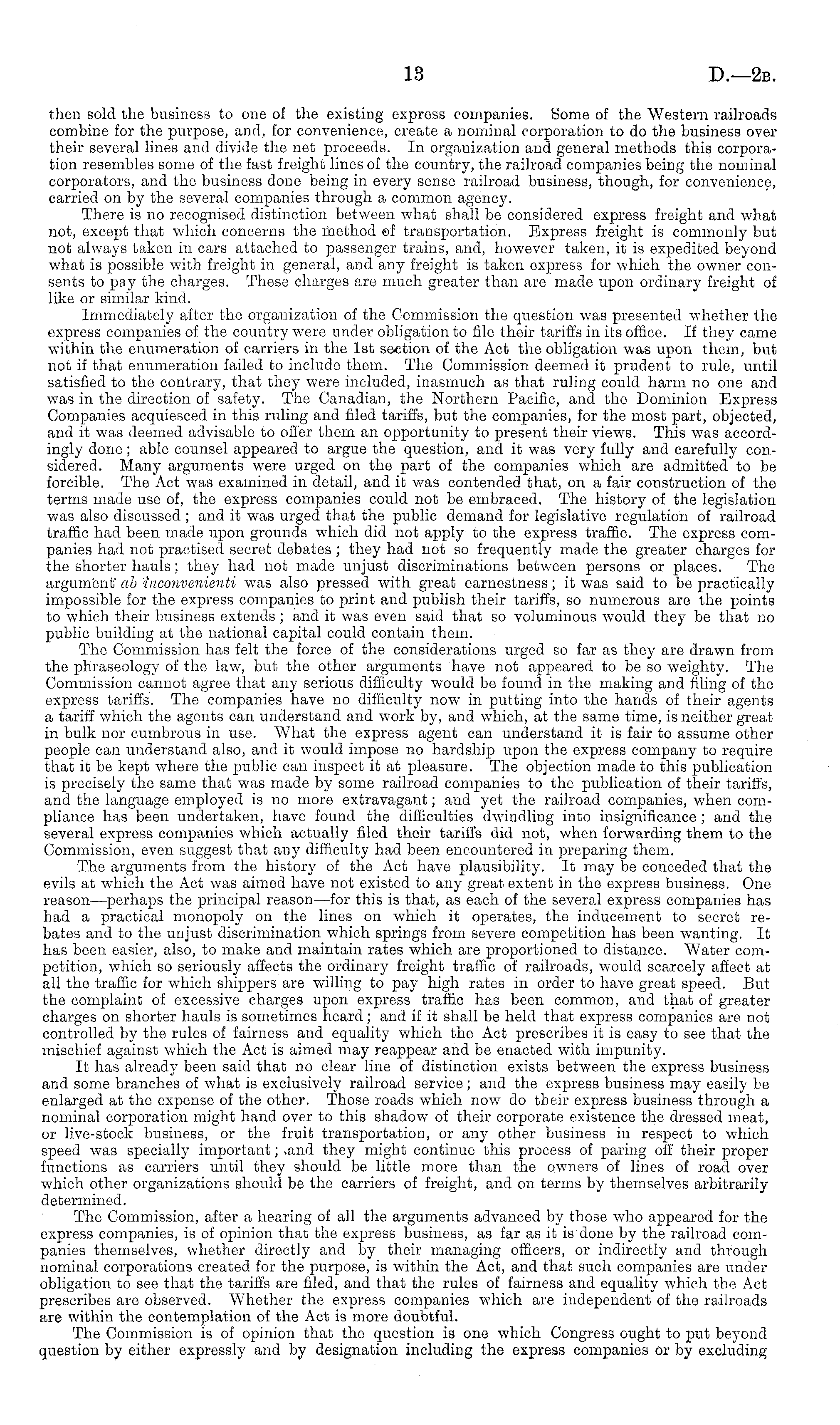 then sold the business to one of the existing express companies. Some of the Western railroads combine for the purpose, and, for convenience, create a nominal corporation to do the business over their several lines and divide the net proceeds. In organization and general methods this corporation resembles some of the fast freight lines of the country, the railroad companies being the nominal corporators, and the business done being in every sense railroad business, though, for convenience, carried on by the several companies through a common agency. There is no recognised distinction between what shall be considered express freight and what not, except that which concerns the method ©f transportation. Express freight is commonly but not always taken in cars attached to passenger trains, and, however taken, it is expedited beyond what is possible with freight in general, and any freight is taken express for which the owner consents to pay the charges. These charges are much greater than are made upon ordinary freight of like or similar kind. Immediately after the organization of the Commission the question was presented whether the express companies of the country were under obligation to file their tariffs in its office. If they came within the enumeration of carriers in the Ist section of the Act the obligation was upon them, but not if that enumeration failed to include them. The Commission deemed it prudent to rule, until satisfied to the contrary, that they were included, inasmuch as that ruling could harm no one and was in the direction of safety. The Canadian, the Northern Pacific, and the Dominion Express Companies acquiesced in this ruling and filed tariffs, but the companies, for the most part, objected, and it was deemed advisable to offer them an opportunity to present their views. This was accordingly done; able counsel appeared to argue the question, and it was very fully and carefully considered. Many arguments were urged on the part of the companies which are admitted to be forcible. The Act was examined in detail, and it was contended that, on a fair construction of the terms made use of, the express companies could not be embraced. The history of the legislation was also discussed ; and it was urged that the public demand for legislative regulation of railroad traffic had been made ripon grounds which did not apply to the express traffic. The express companies had not practised secret debates ; they had not so frequently made the greater charges for the shorter hauls; they had not made unjust discriminations between persons or places. The argument' ab inconvenienti was also pressed with great earnestness; it was said to be practically impossible for the express companies to print and publish their tariffs, so numerous are the points to which their business extends ; and it was even said that so voluminous would they be that no public building at the national capital could contain them. The Commission has felt the force of the considerations urged so far as they are drawn from the phraseology of the law, but the other arguments have not appeared to be so weighty. The Commission cannot agree that any serious difficulty would be found in the making and filing of the express tariffs. The companies have no difficulty now in putting into the hands of their agents a tariff which the agents can understand and work by, and which, at the same time, is neither great in bulk nor cumbrous in use. What the express agent can understand it is fair to assume other people can understand also, and it would impose no hardship upon the express company to require that it be kept where the public can inspect it at pleasure. The objection made to this publication is precisely the same that was made by some railroad companies to the publication of their tariffs, and the language employed is no more extravagant; and yet the railroad companies, when compliance has been undertaken, have found the difficulties dwindling into insignificance ; and the several express companies which actually filed their tariffs did not, when forwarding them to the Commission, even suggest that any difficulty had been encountered in preparing them. The arguments from the history of the Act have plausibility. It may be conceded that the evils at which the Act was aimed have not existed to any great extent in the express business. One reason —perhaps the principal reason —for this is that, as each of the several express companies has had a practical monopoly on the lines on which it operates, the inducement to secret rebates and to the unjust discrimination which springs from severe competition has been wanting. It has been easier, also, to make and maintain rates which are proportioned to distance. Water competition, which so seriously affects the ordinary freight traffic of railroads, would scarcely affect at all the traffic for which shippers are willing to pay high rates in order to have great speed. But the complaint of excessive charges upon express traffic has been common, and that of greater charges on shorter hauls is sometimes heard; and if it shall be held that express companies are not controlled by the rules of fairness and equality which the Act prescribes it is easy to see that the mischief against which the Act is aimed may reappear and be enacted with impunity. It has already been said that no clear line of distinction exists between the express business and some branches of what is exclusively railroad service ; and the express business may easily be enlarged at the expense of the other. Those roads which now do their express business through a nominal corporation might hand over to this shadow of their corporate existence the dressed meat, or live-stock business, or the fruit transportation, or any other business in respect to which speed was specially important; >and they might continue this process of paring off their proper functions as carriers until they should be little more than the owners 