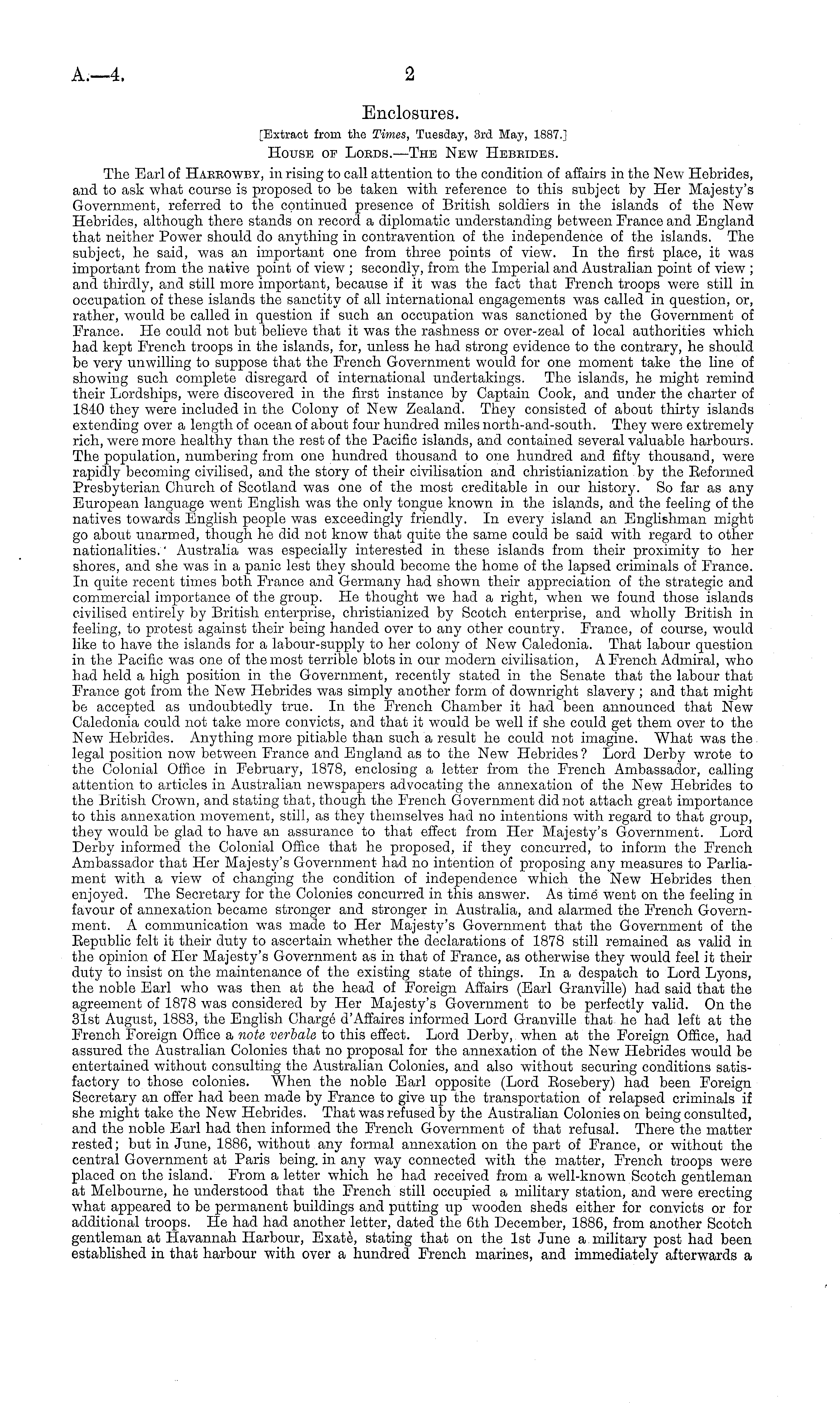 Enclosures. [Extract from the Times, Tuesday, 3rd May, 1887.] House of Loeds. —The New Hebeides. The Earl of Haeeowby, in rising to call attention to the condition of affairs in the New Hebrides, and to ask what course is proposed to be taken with reference to this subject by Her Majesty's Government, referred to the continued presence of British soldiers in the islands of the New Hebrides, although there stands on record a diplomatic understanding between France and England that neither Power should do anything in contravention of the independence of the islands. The subject, he said, was an important one from three points of view. In the first place, it was important from the native point of view ; secondly, from the Imperial and Australian point of view ; and. thirdly, and still more important, because if it was the fact that French troops were still in occupation of these islands the sanctity of all international engagements was called in question, or, rather, would be called in question if such an occupation was sanctioned by the Government of France. He could not but believe that it was the rashness or over-zeal of local authorities which had kept French troops in the islands, for, unless he had strong evidence to the contrary, he should be very unwilling to suppose that the French Government would for one moment take the line of showing such complete disregard of international undertakings. The islands, he might remind their Lordships, were discovered in the first instance by Captain Cook, and under the charter of 1840 they were included in the Colony of New Zealand. They consisted of about thirty islands extending over a length of ocean of about four hundred miles north-and-south. They were extremely rich, were more healthy than the rest of the Pacific islands, and contained several valuable harbours. The population, numbering from one hundred thousand to one hundred and fifty thousand, were rapidly becoming civilised, and the story of their civilisation and christianization by the Eeformed Presbyterian Church of Scotland was one of the most creditable in our history. So far as any European language went English was the only tongue known in the islands, and the feeling of the natives towards English people was exceedingly friendly. In every island an Englishman might go about unarmed, though he did not know that quite the same could be said with regard to other nationalities.' Australia was especially interested in these islands from their proximity to her shores, and she was in a panic lest they should become the home of the lapsed criminals of France. In quite recent times both France and Germany had shown their appreciation of the strategic and commercial importance of the group. He thought we had a right, when we found those islands civilised entirely by British enterprise, christianized by Scotch enterprise, and wholly British in feeling, to protest against their being handed over to any other country. France, of course, would like to have the islands for a labour-supply to her colony of New Caledonia. That labour question in the Pacific was one of the most terrible blots in our modern civilisation, A French Admiral, who had held a high position in the Government, recently stated in the Senate that the labour that France got from the New Hebrides was simply another form of downright slavery; and that might be accepted as undoubtedly true. In the French Chamber it had been announced that New Caledonia could not take more convicts, and that it would be well if she could get them over to the New Hebrides. Anything more pitiable than such a result he could not imagine. What was the legal position now between France and England as to the New Hebrides ? Lord Derby wrote to the Colonial Office in February, 1878, enclosing a letter from the French Ambassador, calling attention to articles in Australian newspapers advocating the annexation of the New Hebrides to the British Crown, and stating that, though the French Government did not attach great importance to this annexation movement, still, as they themselves had no intentions with regard to that group, they would be glad to have an assurance to that effect from Her Majesty's Government. Lord Derby informed the Colonial Office that he proposed, if they concurred, to inform the French Ambassador that Her Majesty's Government had no intention of proposing any measures to Parliament with a view of changing the condition of independence which the New Hebrides then enjoyed. The Secretary for the Colonies concurred in this answer. As time went on the feeling in favour of annexation became stronger and stronger in Australia, and alarmed the French Government. A communication was made to Her Majesty's Government that the Government of the Republic felt it their duty to ascertain whether the declarations of 1878 still remained as valid in the opinion of Her Majesty's Government as in that of France, as otherwise they would feel it their duty to insist on the maintenance of the existing state of things. In a despatch to Lord Lyons, the noble Earl who was then at the head of Foreign Affairs (Earl Granville) had said that the agreement of 1878 was considered by Her Majesty's Government to be perfectly valid. On the 31st August, 1883, the English Charge d'Affaires informed Lord Granville that he had left at the French Foreign Office a note verbale to this effect. Lord Derby, when at the Foreign Office, had assured the Australian Colonies that no proposal for the annexation of the New Hebrides would be entertained without consulting the Australian Colonies, and also without securing conditions satisfactory to those colonies. When the noble Earl opposite (Lord Eosebery) had been Foreign Secretary an offer had been made by France to give up the transportation of relapsed criminals if she might take the New Hebrides. That was refused by the Australian Colonies on being consulted, and the noble Earl had then informed the French Government of that