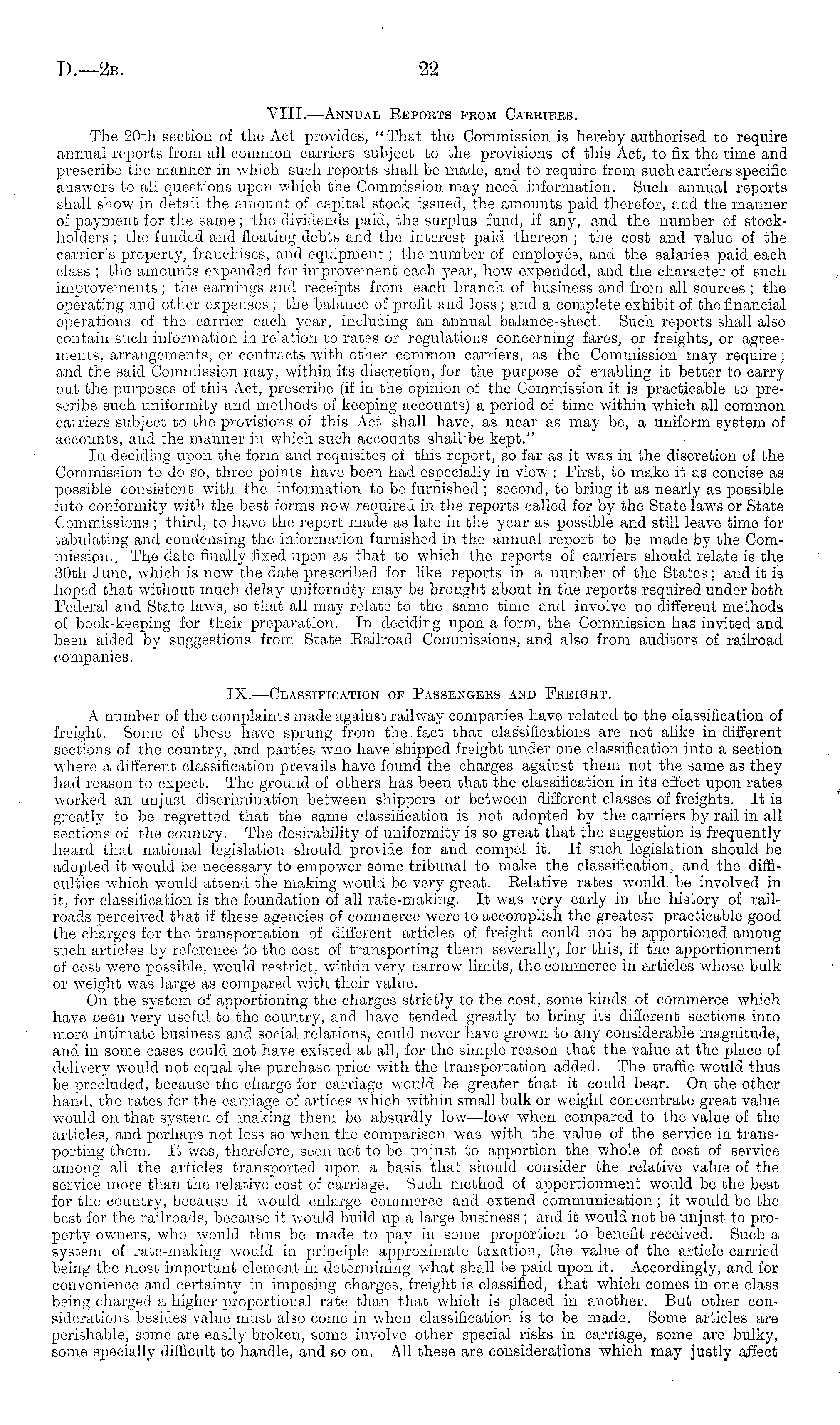 Vlll.—Annual Reports feom Caeriebs. The 20th section of the Act provides, " That the Commission is hereby authorised to require annual reports from all common carriers subject to the provisions of this Act, to fix the time and prescribe the manner in winch such reports shall bo made, and to require from such carriers specific answers to all questions upon which the Commission may need information. Such annual reports shall show in detail the amount of capital stock issued, the amounts paid therefor, and the manner of payment for the same; the dividends paid, the surplus fund, if any, and the number of stockholders ; the funded and floating debts and the interest paid thereon ; the cost and value of the carrier's property, franchises, and equipment; the number of employes, and the salaries paid each class ; the amounts expended for improvement each year, how expended, and the character of such improvements; the earnings and receipts from each branch of business and from all sources ; the operating and other expenses ; the balance of profit and loss ; and a complete exhibit of the financial operations of the carrier each year, including an annual balance-sheet. Such reports shall also contain such information in relation to rates or regulations concerning fares, or freights, or agreements, arrangements, or contracts with other common carriers, as the Commission may require; and the said Commission may, within its discretion, for the purpose of enabling it better to carry out the purposes of this Act, prescribe (if in the opinion of the Commission it is practicable to prescribe such uniformity and methods of keeping accounts) a period of time within which all common carriers subject to the provisions of this Act shall have, as near as may be, a uniform system of accounts, and the manner in which such accounts shallbe kept." In deciding upon the form and requisites of this report, so far as it was in the discretion of the Commission to do so, three points have been had especially in view : First, to make it as concise as possible consistent with the information to be furnished ; second, to bring it as nearly as possible into conformity with the best forms now required in the reports called for by the State laws or State Commissions ; third, to have the report made as late in the year as possible and still leave time for tabulating and condensing the information furnished in the annual report to be made by the Commission.. The date finally fixed upon as that to which the reports of carriers should relate is the 30th June, which is now the date prescribed for like reports in a number of the States; and it is hoped that without much delay uniformity may be brought about in the reports required under both Federal and State laws, so that all may relate to the same time and involve no different methods of book-keeping for their preparation. In deciding upon a form, the Commission has invited and been aided by suggestions from State Railroad Commissions, and also from auditors of railroad companies. IX. —Classification of Passengers and Freight. A number of the complaints made against railway companies have related to the classification of freight. Some of these have sprung from the fact that classifications are not alike in different sections of the country, and parties who have shipped freight under one classification into a section where a different classification prevails have found the charges against them not the same as they had reason to expect. The ground of others has been that the classification in its effect upon rates worked an unjust discrimination between shippers or between different classes of freights. It is greatly to be regretted that the same classification is not adopted by the carriers by rail in all sections of the country. The desirability of uniformity is so great that the suggestion is frequently heard that national legislation should provide for and compel it. If such legislation should be adopted it would be necessary to empower some tribunal to make the classification, and the difficulties which would attend the making would be very groat. Relative rates would be iuvolved in ic, for classification is the foundation of all rate-making. It was very early in the history of railroads perceived that if these agencies of commerce were to accomplish the greatest practicable good the charges for the transportation of different articles of freight could not be apportioned among such articles by reference to the cost of transporting them severally, for this, if the apportionment of cost were possible, would restrict, within very narrow limits, the commerce in articles whose bulk or weight was large as compared with their value. On the system of apportioning the charges strictly to the cost, some kinds of commerce which have been very useful to the country, and have tended greatly to bring its different sections into more intimate business and social relations, could never have grown to any considerable magnitude, and in some cases could not have existed at all, for the simple reason that the value at the place of delivery would not equal the purchase price with the transportation added. The traffic would thus be precluded, because the charge for carriage would be greater that it could bear. On the other hand, the rates for the carriage of artices which within small bulk or weight concentrate great value would on that system of making them bo absurdly low—low when compared to the value of the articles, and perhaps not less so when the comparison was with the value of the service in transporting them. It was, therefore, seen not to be unjust to apportion the whole of cost of service among all the articles transported upon a basis that should consider the relative value of the service more than the relative cost of carriage. Such method of apportionment would be the best for the country, because it would enlarge commerce and extend communication ; it would be the best for the