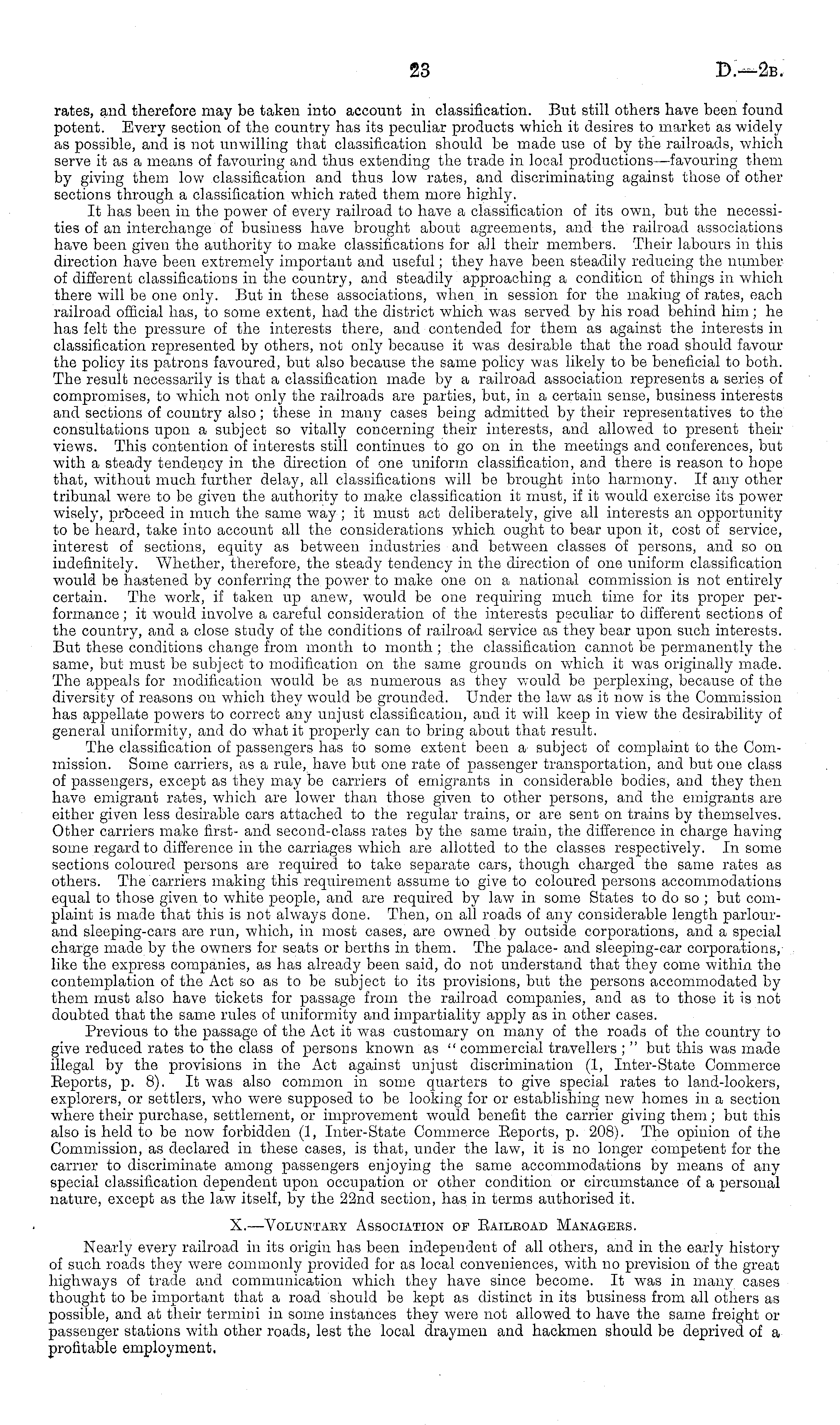 rates, and therefore may be taken into account in classification. But still others have been found potent. Every section of the country has its peculiar products which it desires to market as widely as possible, and is not unwilling that classification should be made use of by the railroads, which serve it as a means of favouring and thus extending the trade in local productions—favouring them by giving them low classification and thus low rates, and discriminating against those of other sections through a classification which rated them more highly. It has been in the power of every railroad to have a classification of its own, but the necessities of an interchange of business have brought about agreements, and the railroad associations have been given the authority to make classifications for all their members. Their labours in this direction have been extremely important and useful; they have been steadily reducing the number of different classifications in the country, and steadily approaching a condition of things in which there will be one only. But in these associations, when in session for the making of rates, each railroad official has, to some extent, had the district which was served by his road behind him; he has felt the pressure of the interests there, and contended for them as against the interests in classification represented by others, not only because it w Tas desirable that the road should favour the policy its patrons favoured, but also because the same policy was likely to be beneficial to both. The result necessarily is that a classification made by a railroad association represents a series of compromises, to which not only the railroads are parties, but, in a certain sense, business interests and sections of country also ; these in many cases being admitted by their representatives to the consultations upon a subject so vitally concerning their interests, and allowed to present their views. This contention of interests still continues to go on in the meetings and conferences, but with a steady tendency in the direction of one uniform classification, and there is reason to hope that, without much further delay, all classifications will be brought into harmony. If any other tribunal were to be given the authority to make classification it must, if it would exercise its power wisely, proceed in much the same way ; it must act deliberately, give all interests an opportunity to be heard, take into account all the considerations which ought to bear upon it, cost of service, interest of sections, equity as between industries and between classes of persons, and so on indefinitely. Whether, therefore, the steady tendency in the direction of one uniform classification would be hastened by conferring the power to make one on a national commission is not entirely certain. The work, if taken up anew, w'ould be one requiring much time for its proper performance ; it would involve a careful consideration of the interests peculiar to different sections of the country, and a close study of the conditions of railroad service as they bear upon such interests. But these conditions change from month to month ; the classification cannot be permanently the same, but must be subject to modification on the same grounds on which it was originally made. The appeals for modification would be as numerous as they would be perplexing, because of the diversity of reasons on which they would be grounded. Under the law as it now is the Commission has appellate powers to correct any unjust classification, and it will keep in view the desirability of general uniformity, and do what it properly can to bring about that result. The classification of passengers has to some extent been a subject of complaint to the Commission. Some carriers, as a rule, have but one rate of passenger transportation, and but one class of passengers, except as they may be carriers of emigrants in considerable bodies, and they then have emigrant rates, which are lower than those given to other persons, and the emigrants are either given less desirable cars attached to the regular trains, or are sent on trains by themselves. Other carriers make first- and second-class rates by the same train, the difference in charge having some regard to difference in the carriages which are allotted to the classes respective^. In some sections coloured persons are required to take separate cars, though charged the same rates as others. The carriers making this requirement assume to give to coloured persons accommodations equal to those given to white people, and are required by law in some States to do so ; but complaint is made that this is not always done. Then, on all roads of any considerable length parlourand sleeping-cars are run, which, in most cases, are owned by outside corporations, and a special charge made by the owners for seats or berths in them. The palace- and sleeping-car corporations, like the express companies, as has already been said, do not understand that they come within the contemplation of the Act so as to be subject to its provisions, but the persons accommodated by them must also have tickets for passage from the railroad companies, and as to those it is not doubted that the same rules of uniformity and impartiality apply as in other cases. Previous to the passage of the Act it was customary on many of the roads of the country to give reduced rates to the class of persons known as " commercial travellers ; " but this was made illegal by the provisions in the Act against unjust discrimination (I, Inter-State Commerce Eeports, p. 8). It was also common in some quarters to give special rates to land-lookers, explorers, or settlers, who were supposed to be looking for or establishing new homes in a section where their purchase, settlement, or improvement would benefit the carrier giving them; but this also is held to be now forbidden (I, Inter-State Commerce Eeports, p. 208). The opinion of the Commission, as decl