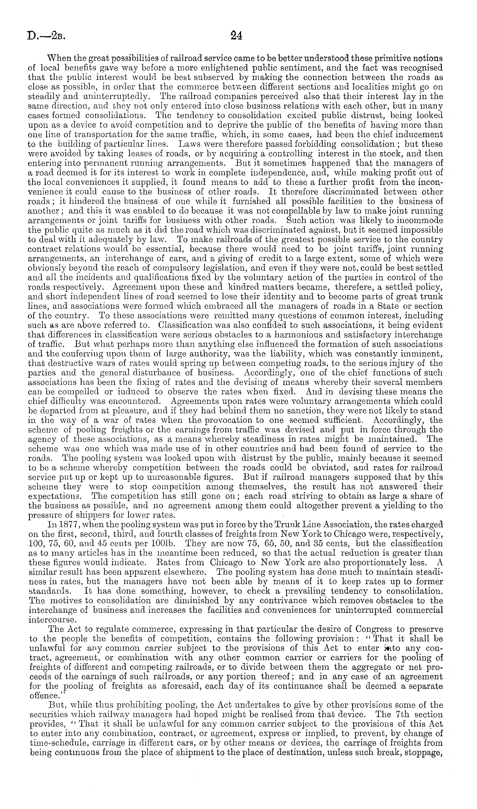 When the great possibilities of railroad service came to be better understood these primitive notions of local benefits gave way before a more enlightened public sentiment, and the fact was recognised that the public interest would be best subserved by making the connection between the roads as close as possible, in order that the commerce between different sections and localities might go on steadily and uninterruptedly. The railroad companies perceived also that their interest lay in the same direction, and they not only entered into close business relations with each other, but in many cases formed consolidations. The tendency to consolidation excited public distrust, being looked upon as a device to avoid competition and to deprive the public of the benefits of having more than one line of transportation for the same traffic, which, in some cases, had been the chief inducement to the building of particular lines. Laws were therefore passed forbidding consolidation ; but these were avoided by taking leases of roads, or by acquiring a controlling interest in the stock, and then entering into permanent running arrangements. But it sometimes happened that the managers of a road deemed it for its interest to work in complete independence, and, while making profit out of the local conveniences it supplied, it found means to add to these a further profit from the inconvenience it could cause to the business of other roads. It therefore discriminated between other roads ; it hindered the business of one while it furnished all possible facilities to the business of another ; and this it was enabled to do because it was not coinpellable by law to make joint running arrangements or joint tariff's for business with other roads. Such action was likely to incommode the public quite as much as it did the road which was discriminated against, but it seemed impossible to deal with it adequately by law. To make railroads of the greatest possible service to the country contract relations would be essential, because there would need to be joint tariffs, joint running arrangements, an interchange of cars, and a giving of credit to a large extent, some of which were obviously beyond the reach of compulsory legislation, and even if they were not, could be best settled and all the incidents and qualifications fixed by the voluntary action of the parties in control of the roads respectively. Agreement upon these and kindred matters became, therefere, a settled policy, and short independent lines of road seemed to lose their identity and to become parts of great trunk lines, and associations were formed which embraced all the managers of roads in a State or section of the country. To these associations were remitted many questions of common interest, including such as are above referred to. Classification was also confided to such associations, it being evident that differences in classification were serious obstacles to a harmonious and satisfactory interchange of traffic. But what perhaps more than anything else influenced the formation of such associations and the conferring upon them of large authority, was the liability, which was constantly imminent, that destructive wars of rates would spring up between competing roads, to the serious injury of the parties and the general disturbance of business. Accordingly, one of the chief functions of such associations has been the fixing of rates and the devising of means whereby their several members can be compelled or induced to observe the rates when fixed. And in devising these means the chief difficulty was encountered. Agreements upon rates were voluntary arrangements which could be departed from at pleasure, and if they had behind them no sanction, they were not likely to stand in the way of a war of rates when the provocation to one seemed sufficient. Accordingly, the scheme of pooling freights or the earnings from traffic was devised and put in force through the agency of these associations, as a means whereby steadiness in rates might be maintained. The scheme was one which was made use of in other countries and had been found of service to the roads. The pooling system was looked upon with distrust by the public, mainly because it seemed to be a scheme whereby competition between the roads could be obviated, and rates for railroad service put up or kept up to unreasonable figures. But if railroad managers supposed that by this scheme they were to stop competition among themselves, the result has not answered their expectations. The competition has still gone on; each road striving to obtain as large a share of the business as possible, and no agreement among them could altogether prevent a yielding to the pressure of shippers for lower rates. In 1877, when the pooling system was put in force by the Trunk Line Association, the rates charged on the first, second, third, and fourth classes of freights from New York to Chicago were, respectively, 100, 75, 60, and 45 cents per 1001b. They are now 75, 65, 50, and 35 cents, but the classification as to many articles has in the meantime been reduced, so that the actual reduction is greater than these figures would indicate. Bates from Chicago to New York are also proportionately less. A similar result has been apparent elsewhere. The pooling system has done much to maintain steadiness in rates, but the managers have not been able by means of it to keep rates up to former standards. It has done something, however, to check a prevailing tendency to consolidation. The motives to consolidation are diminished by any contrivance which removes obstacles to the interchange of business and increases the facilities and conveniences for uninterrupted commercial intercourse. The Act to regulate commerce, expressing in that particular the desire of Congress to preserve to the people the benefits of competition, contains the following provision: "That it shall be unlawful for any common carrier subject to the provisions of 