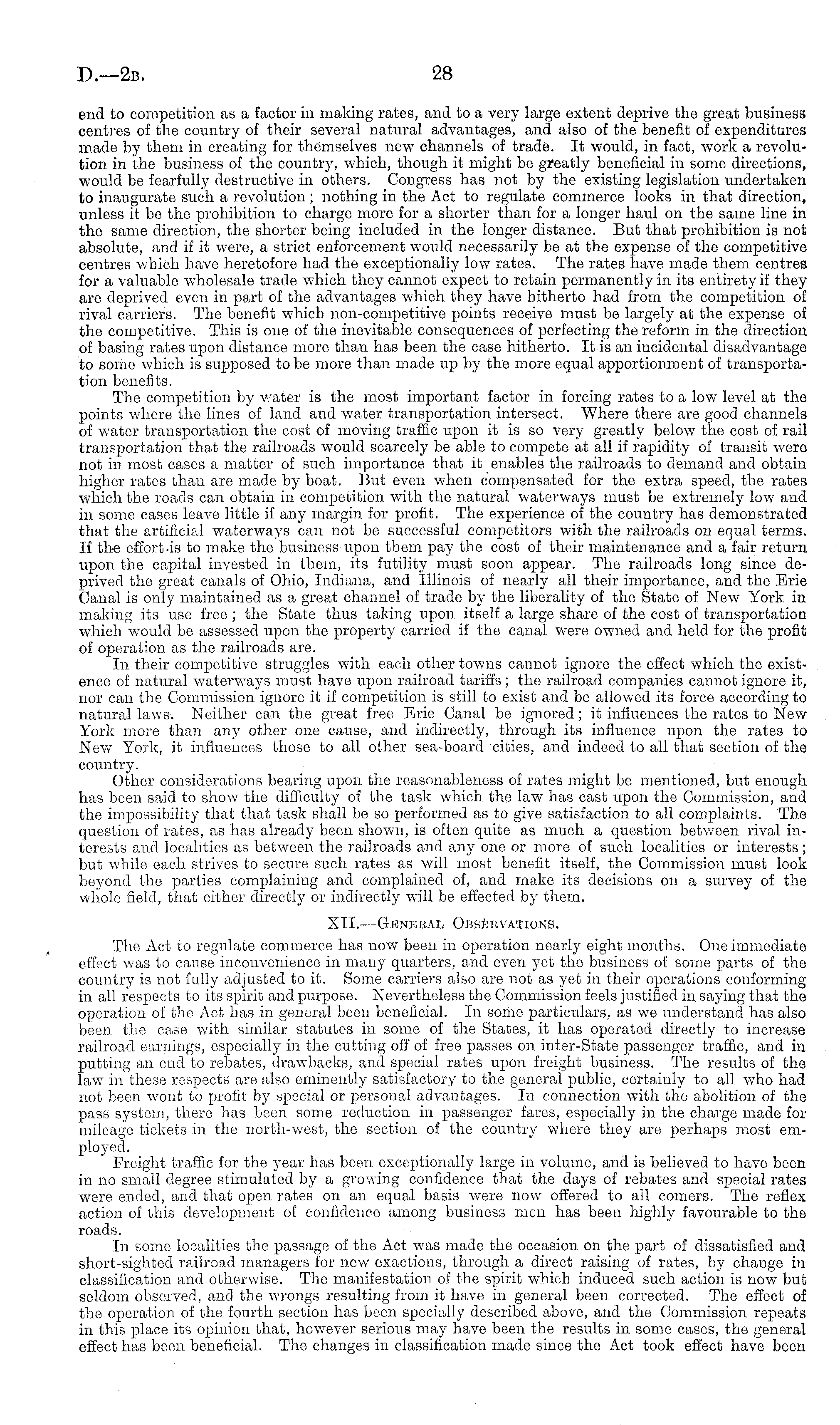 end to competition as a factor in making rates, and to a very large extent deprive the great business centres of the country of their several natural advantages, and also of the benefit of expenditures made by them in creating for themselves new channels of trade. It would, in fact, work a revolution in the business of the country, which, though it might be greatly beneficial in some directions, would be fearfully destructive in others. Congress has not by the existing legislation undertaken to inaugurate such a revolution; nothing in the Act to regulate commerce looks in that direction, unless it be the prohibition to charge more for a shorter than for a longer haul on the same line in the same direction, the shorter being included in the longer distance. But that prohibition is not absolute, and if it were, a strict enforcement would necessarily be at the expense of the competitive centres which have heretofore had the exceptionally low rates. The rates have made them centres for a valuable wholesale trade which they cannot expect to retain permanently in its entirety if they are deprived even in part of the advantages which they have hitherto had from the competition of rival carriers. The benefit which non-competitive points receive must be largely at the expense of the competitive. This is one of the inevitable consequences of perfecting the reform in the direction of basing rates upon distance more than has been the case hitherto. It is an incidental disadvantage to some which is supposed to be more than made up by the more equal apportionment of transportation benefits. The competition by water is tho most important factor in forcing rates to a low level at the points where the lines of land and water transportation intersect. Where there are good channels of water transportation the cost of moving traffic upon it is so very greatly below the cost of rail transportation that the railroads would scarcely be able to compete at all if rapidity of transit were not in most cases a matter of such importance that it enables the railroads to demand and obtain higher rates than are made by boat. But even when compensated for the extra speed, the rates which the roads can obtain in competition with the natural waterways must be extremely low and in some cases leave little if any margin for profit. The experience of the country has demonstrated that the artificial waterways can not be successful competitors with the railroads on equal terms. If the effort-is to make the business upon them pay the cost of their maintenance and a fair return upon the capital invested in them, its futility must soon appear. The railroads long since depraved the great canals of Ohio, Indiana, and Illinois of nearly all their importance, and the Erie Canal is only maintained as a great channel of trade by the liberality of the State of New York in making its use free ; the State thus taking upon itself a large share of the cost of transportation which would be assessed upon the property carried if the canal were owned and held for the profit of operation as the railroads are. In their competitive struggles with each other towns cannot ignore the effect which the existence of natural waterways must have upon railroad tariffs; tho railroad companies cannot ignore it, nor can the Commission ignore it if competition is still to exist and be allowed its force according to natural laws. Neither can. the great free Erie Canal be ignored; it influences the rates to New York more than any other one cause, and indirectly, through its influence upon the rates to New York, it influences those to all other sea-board cities, and indeed to all that section of the country. Other considerations bearing upon the reasonableness of rates might be mentioned, but enough has been said to show the difficulty of the task which the law has cast upon the Commission, and the impossibility that that task shall be so performed as to give satisfaction to all complaints. The question of rates, as has already been shown, is often quite as much a question between rival interests and localities as between the railroads and any one or more of such localities or interests; but while each strives to secure such rates as will most benefit itself, the Commission must look beyond the parties complaining and complained of, and make its decisions on a survey of the whole field, that either directly or indirectly will be effected by them. XII. —Geneeal Observations. The Act to regulate commerce has now been in operation nearly eight mouths. One immediate effect was to cause inconvenience in many quarters, and even yet the business of some parts of the country is not fully adjusted to it. Some carriers also are not as yet in their operations conforming in all respects to its spirit and purpose. Nevertheless the Commission feels justified in saying that the operation of the Act has in general been beneficial. In some particulars, as we understand has also been the case with similar statutes in some of the States, it has operated directly to increase railroad earnings, especially in the cutting off of free passes on inter-State passenger traffic, and in putting an end to rebates, drawbacks, and special rates upon freight business. 'The results of the law in these respects are also eminently satisfactory to the general public, certainly to all who had not been wont to profit by special or personal advantages. In connection with the abolition of the pass system, there has been some reduction in passenger fares, especially in the charge made for mileage tickets in the north-west, the section of the country where they are perhaps most employed. Freight traffic for the year has been exceptionally large in volume, and is believed to have been in no small degree stimulated by a growing confidence that the days of rebates and special rates were ended, and that open rates on an equal basis were now offered to all comers. The reflex action of this development of conf