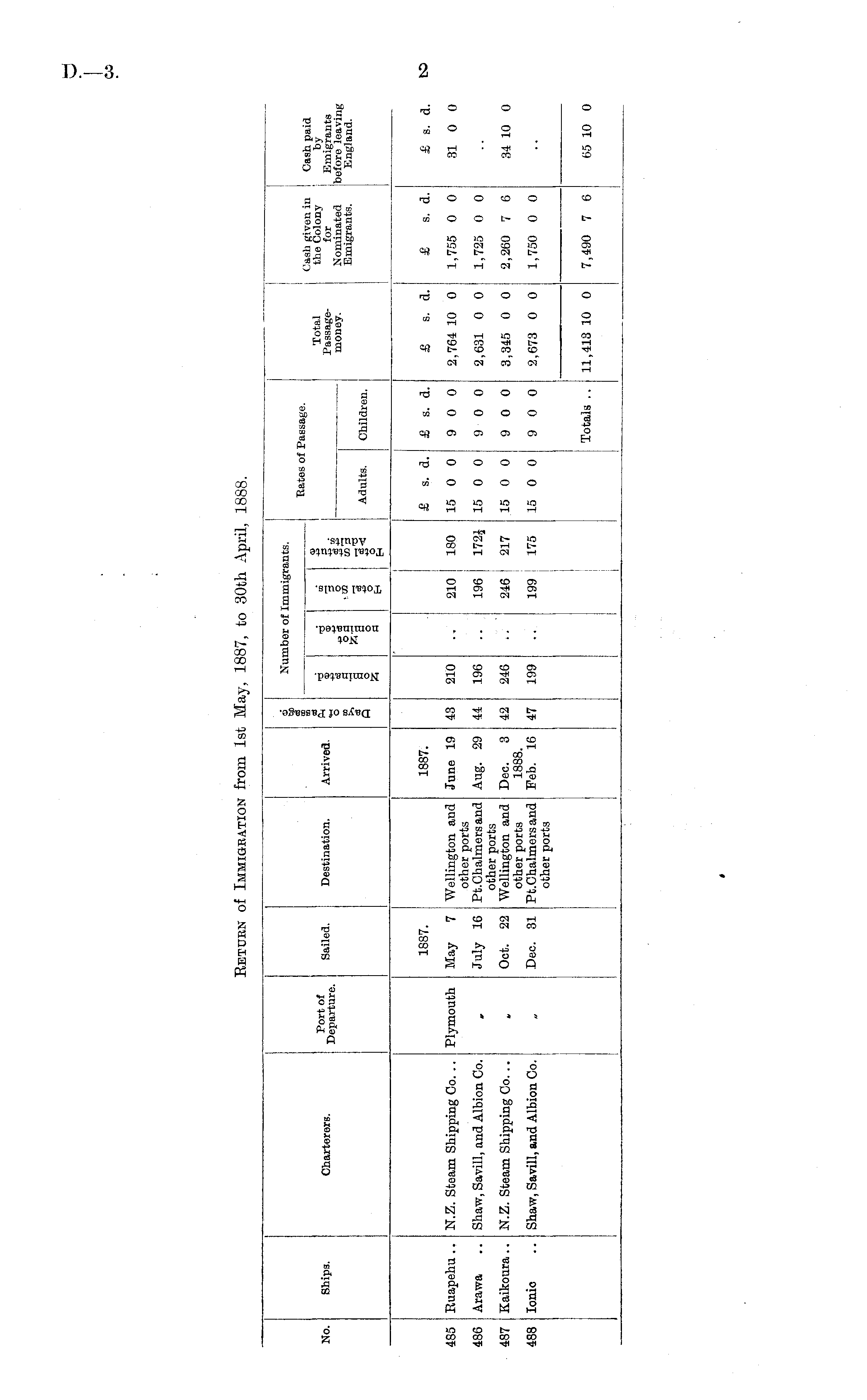 CD ■s d 3 Number of Immigrants. I I I f Bates of Passage. Cash given in the Colonv for Nominated Emigrants. Cash paid by Emigrants ibefore leavinj England. No. Ships. Charterers. Port of Departure. Sailed. Destination. Arrived. I Total Passagemoney. Adults. I Children. 1887. 1887. £ s. d. & s. d. £ s. d. £ s. d. £ s. d. 485 Buapehu .. N.Z. Steam Shipping Go. .. Plymouth May 7 Wellington and other ports Pt.Chalmers and other ports Wellington and other ports Pt.Chalmersand other ports June 19 43 210 210 i 180 15 0 0 9 0 0 2,764 10 0 1,755 0 0 31 0 0 | 486 Arawa Shaw, Savill, and Albion Co. July 16 Aug. 29 44 196 196 172* 15 0 0 9 0 0 2,631 0 0 1,725 0 0 487 Kaikoura.. N.Z. Steam Shipping Co. .. Oct. 22 Deo. 3 1888. Feb. 16 42 246 246 j 217 15 0 0 9 0 0 3,345 0 0 2,260 7 6 34 10 0 488 Ionic Shaw, Savill, and Albion Co. Dec. 31 47 199 199 175 15 0 0 9 0 0 2,673 0 0 1,750 0 0 Totals .. 11,413 10 0 7,490 7 6 65 10