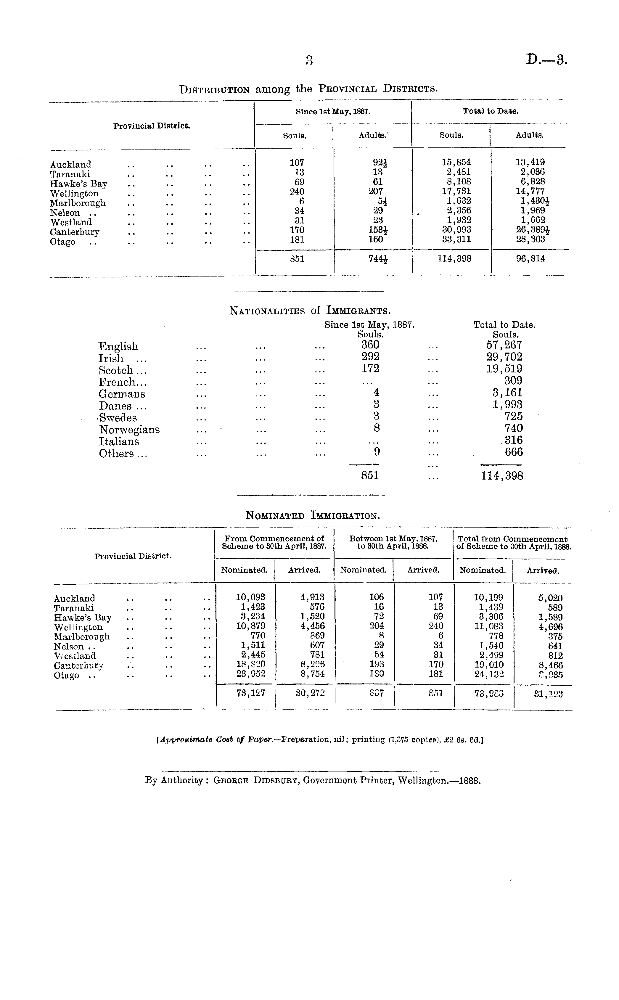 Provincial District. From Commencement of Scheme to 30th April, 1887. Nominated. Arrived. Between 1st May, 1887, to 30th April, 1888. Total from Commencement of Scheme to 30th April, 1888. Arrived. Nominated. Arrived. Nominated. Arrived. Auckland raranaki Hawke's Bay Wellington Marlborough STelson .. Westland 3anteibury Dtago .. 10,093 1,423 3,234 10,879 770 1,511 2,445 18,820 23,952 4,913 376 1,520 4,456 369 607 781 8,200 8,754 106 16 72 204 8 29 54 198 ISO 107 13 69 240 6 34 31 170 181 10,199 1,439 3,306 11,083 778 1,540 2,499 19,010 24,182 5,020 589 1,589 4,696 375 641 812 8,466 P,035 73,127 30,272 £07 851 73,980 81,123 [Approximate Cost of Paper.— Preparation, nil; printing (1,876 copies), £2 Cs. 6d.]