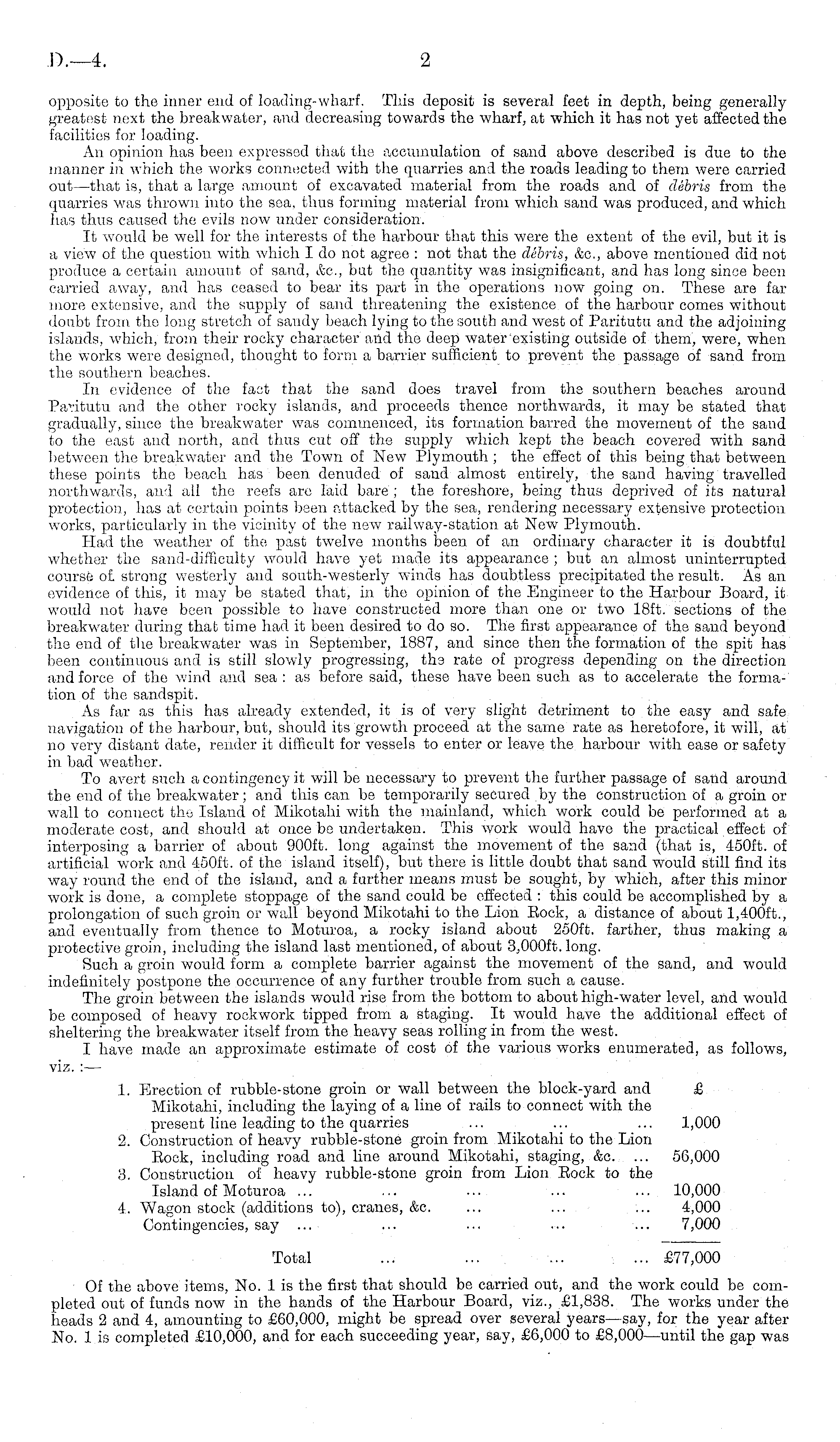 opposite to the inner end of loading-wharf. This deposit is several feet in depth, being generally greatest next the breakwater, and decreasing towards the wharf, at which it has not yet affected the facilities for loading. An opinion has been expressed that the accumulation of sand above described is due to the manner in which the works connected with the quarries and the roads leading to them were carried out —that is, that a large amount of excavated material from the roads and of debris from tho quarries was thrown into the soa. thus forming material from which sand was produced, and which has thus caused the evils now under consideration. It would be well for the interests of the harbour that this were the extent of the evil, but it is a view of the question with which I do not agree : not that the debris, Ac, above mentioned did not produce a certain amount of sand, &c, but the quantity was insignificant, and has long since been carried away, and has ceased to bear its part in the operations now going on. These are far more extensive, and the supply of sand threatening the existence of the harbour comes without doubt from the long stretch of sandy beach lying to the south and west of Paritutu and the adjoining islands, which, from their rocky character and the deep water existing outside of them, were, when the works were designed, thought to form a barrier sufficient to prevent the passage of sand from the southern beaches. In evidence of the fact that the sand does travel from the southern beaches around Paritutu and the other rocky islands, and proceeds thence northwards, it may be stated that gradually, since tho breakwater was commenced, its formation barred the movement of the sand to the east and north, and thus cut off the supply which kept the beach covered with sand between the breakwater and the Town of New Plymouth ; the effect of this being that between these points the beach has been denuded of sand almost entirely, the sand having travelled northwards, and all the reefs are laid bare ; the foreshore, being thus deprived of its natural protection, has at certain points been attacked by the sea, rendering necessary extensive protection works, particularly in the vicinity of the now railway-station at New Plymouth. Had the weather of tho past twelve months been of an ordinary character it is doubtful whether the sand-difficulty would have yet made its appearance ; but an almost uninterrupted course of. strong westerly and south-westerly winds has doubtless precipitated the result. As an evidence of this, it may be stated that, in the opinion of the Engineer to the Harbour Board, it would not have been possible to have constructed more than one or two 18ft. sections of the breakwater during that time had it been desired to do so. The first appearance of the sand beyond the end of the breakwater was in September, 1887, and since then the formation of the spit has been continuous and is still slowly progressing, the rate of progress depending on the direction and force of the wind and sea : as before said, these have been such as to accelerate the formation of the sandspit. As far as this has already extended, it is of very slight detriment to the easy and safe navigation of the harbour, but, should its growth proceed at the same rate as heretofore, it will, at no very distant date, render it difficult for vessels to enter or leave the harbour with ease or safety in bad weather. To avert such a contingency it will be necessary to prevent the further passage of sand around the end of the breakwater; and this can be temporarily secured by tho construction of a groin or wall to connect the Island of Mikotahi with the mainland, which work could be performed at a moderate cost, and should at once be undertaken. This work would have the practical effect of interposing a barrier of about 900 ft. long against the movement of the sand (that is, 450 ft. of artificial work and 450 ft. of the island itself), but there is little doubt that sand would still find its way round the end of the island, and a further means must be sought, by which, after this minor work is done, a complete stoppage of the sand could be effected : this could be accomplished by a prolongation of such groin or wall beyond Mikotahi to the Lion Rock, a distance of about 1,400 ft., and eventually from thence to Moturoa, a rocky island about 250 ft. farther, thus making a protective groin, including the island last mentioned, of about 3,000 ft. long. Such a groin would form a complete barrier against the movement of tho sand, and would indefinitely postpone the occurrence of any further trouble from such a cause. The groin between the islands would rise from the bottom to about high-water level, and would be composed of heavy rockwork tipped from a staging. It would have the additional effect of sheltering the breakwater itself from the heavy seas rolling in from the west. I have made an approximate estimate of cost of the various works enumerated, as follows, viz. :— 1. Erection of rubble-stone groin or wall between the block-yard and £ Mikotahi, including the laying of a line of rails to connect with tho present line leading to the quarries ... ... ... 1,000 2. Construction of heavy rubble-stone groin from Mikotahi to the Lion Kock, including road and line around Mikotahi, staging, &c. ... 56,000 3. Construction of heavy rubble-stone groin from Lion Eock to the Island of Moturoa ... ... ... ... ... 10,000 4. Wagon stock (additions to), cranes, &c. ... ... ... 4,000 Contingencies, say ... ... ... ... ... 7,000 Total ... ... ... ... £77,000 Of the above items, No. 1 is the first that should be carried out, and the work could be completed out of funds now in the hands of the Harbour Board, viz., £1,838. The works under the heads 2 and 4, amounting to £60,000, might be spread over several years—say, for the year after No. 1 is completed £10,000, and for each succeeding year, say, £6,000 to £8,000 —unti