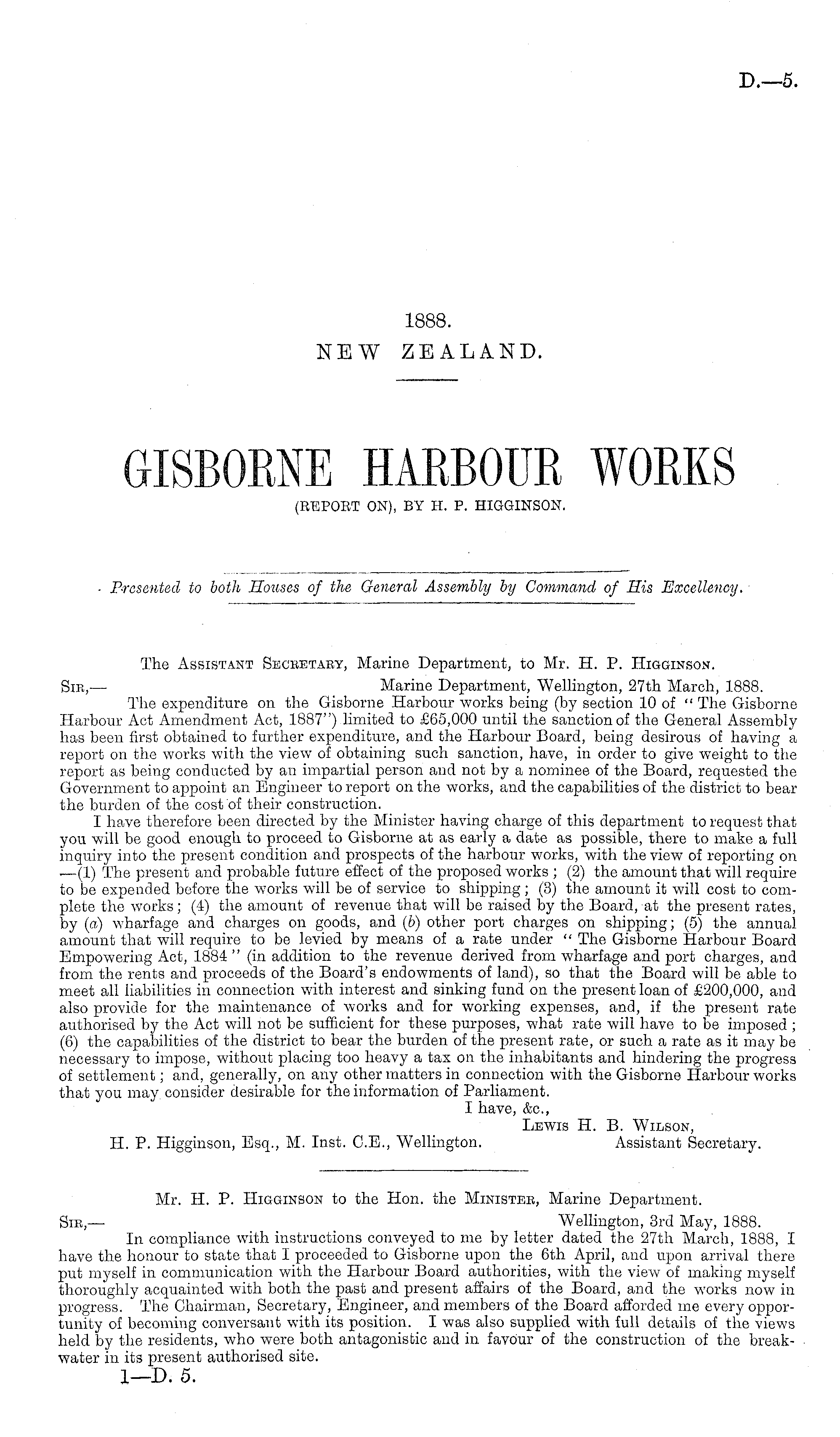 Mr. H. P. Higginson to the Hon. the Minister, Marine Department. See,— Wellington, 3rd May, 1888. In compliance with instructions conveyed to me by letter dated the 27th March, 1888, I have the honour to state that I proceeded to Gisborne upon the 6th April, and upon arrival there put myself in communication with the Harbour Board authorities, with the view of making myself thoroughly acquainted with both the past and present affairs of the Board, and the works now in progress. The Chairman, Secretary, Engineer, and members of the Board afforded me every opportunity of becoming conversant with its position. I was also supplied with full details of the views held by the residents, who were both antagonistic and in favour of the construction of the breakwater in its present authorised site. I—D. 5.