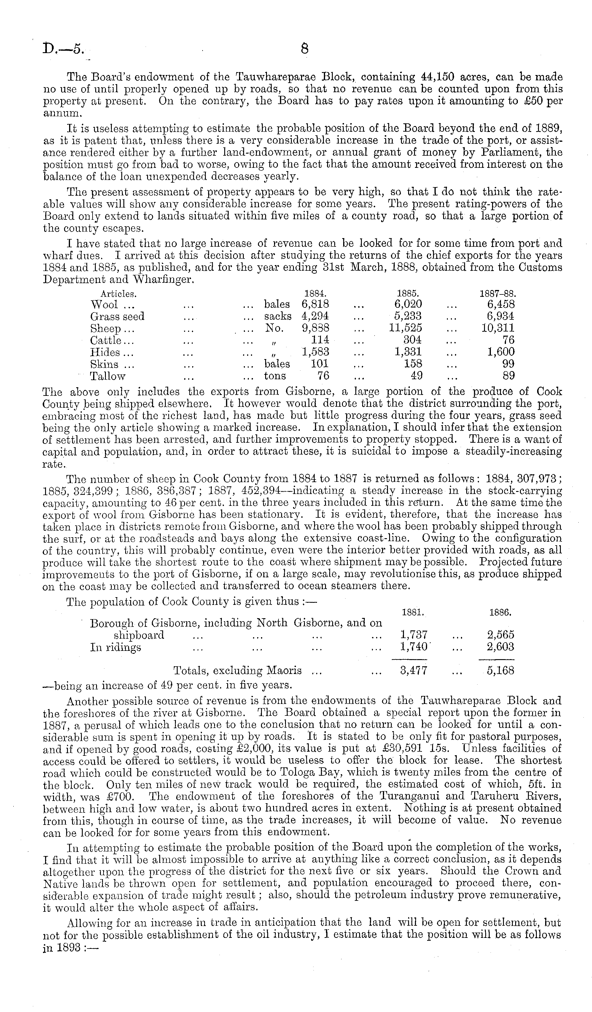 The Board's endowment of the Tauwhareparae Block, containing 44,150 acres, can be made no use of until properly opened up by roads, so that no revenue can be counted upon from this property at present. On the contrary, the Board has to pay rates upon it amounting to £50 per annum. It is useless attempting to estimate the probable position of the Board beyond the end of 1889, as it is patent that, unless there is a very considerable increase in the trade of the port, or assistance rendered either by a further land-endowment, or annual grant of money by Parliament, the position must go from bad to worse, owing to the fact that the amount received from interest on the balance of the loan unexpended decreases yearly. The present assessment of property appears to be very high, so that I do not think the rateable values will show any considerable increase for some years. The present rating-powers of the Board only extend to lands situated within five miles of a county road, so that a large portion of the county escapes. I have stated that no large increase of revenue can be looked for for some time from port and wharf dues. I arrived at this decision after studying the returns of the chief exports for the years 1884 and 1885, as published, and for the year ending 31st March, 1888, obtained from the Customs Department and Wharfinger. Articles. 1884. 1885. 1887-88. Wool ... ... ... bales 6,818 ... 6,020 ... 6,458 Grass seed ... ... sacks 4,294 ... 5,233 ... 6,934 Sheep... ... ... No. 9,838 ... 11,525 ... 10,311 Cattle... ... ... „ 114 ... 304 ... 76 Hides... ... ... „ 1,583 ... 1,331 ... 1,600 Skins ... ... ... bales 101 ... 158 ... 99 Tallow ... ... tons 76 ... 49 ... 89 The above only includes the exports from Gisborne, a large portion of the produce of Cook County being shipped elsewhere. It however would denote that the district surrounding the port, embracing most of the richest land, has made but little progress during the four years, grass seed being the only article showing a marked increase. In explanation, I should infer that the extension of settlement has been arrested, and further improvements to property stopped. There is a want of capital and population, and, in order to attract these, it is suicidal to impose a steadily-increasing rate. The number of sheep in Cook County from 1884 to 1887 is returned as follows : 1884, 307,973; 1885, 324,399 ; 1886, 336,387; 1887, 452,394—indicating a steady increase in the stock-carrying capacity, amounting to 46 per cent, in the three years included in this return. At the same time the export of wool from Gisborne has been stationary. It is evident, therefore, that the increase has taken place in districts remote from Gisborne, and where the wool has been probably shipped through the surf, or at the roadsteads and bays along the extensive coast-line. Owing to the configuration of the country, this will probably continue, even were the interior better provided with roads, as all produce will take the shortest route to the coast where shipment may be possible. Projected future improvements to the port of Gisborne, if on a large scale, may revolutionise this, as produce shipped on the coast may be collected and transferred to ocean steamers there. The population of Cook County is given thus : —■ 1881. 1886. Borough of Gisborne, including North Gisborne, and on shipboard ... ... ... ... 1,737 ... 2,565 In ridings ... ... ... ... 1,740' ... 2,603 Totals, excluding Maoris ... ... 3,477 ... 5,168 —being an increase of 49 per cent, in five years. Another possible source of revenue is from the endowments of the Tauwhareparae Block and the foreshores of the river at Gisborne. The Board obtained a special report upon the former in 1887, a perusal of which leads one to the conclusion that no return can be looked for until a considerable sum is spent in opening it up by roads. It is stated to be only fit for pastoral purposes, and if opened by good roads, costing £2,000, its value is put at £30,591 15s. Unless facilities of access could be offered to settlers, it would be useless to offer the block for lease. The shortest road which could be constructed would be to Tologa Bay, which is twenty miles from the centre of the block. Only ten miles of new track would be required, the estimated cost of which, sft. in width, was £700. The endowment of the foreshores of the Turanganui and Taruheru Rivers, between high and low water, is about two hundred acres in extent. Nothing is at present obtained from this, though in course of time, as the trade increases, it will become of value. No revenue can be looked for for some years from this endowment. In attempting to estimate the probable position of the Board upon the completion of the works, I find that it will be almost impossible to arrive at anything like a correct conclusion, as it depends altogether upon the progress of the district for the next five or six years. Should the Crown and Native lands be thrown open for settlement, and population encouraged to proceed there, considerable expansion of trade might result; also, should the petroleum industry prove remunerative, it would alter the whole aspect of affairs. Allowing for an increase in trade in anticipation that the land will be open for settlement, but not for the possible establishment of the oil industry, I estimate that the position will be as follows in 1893 :—