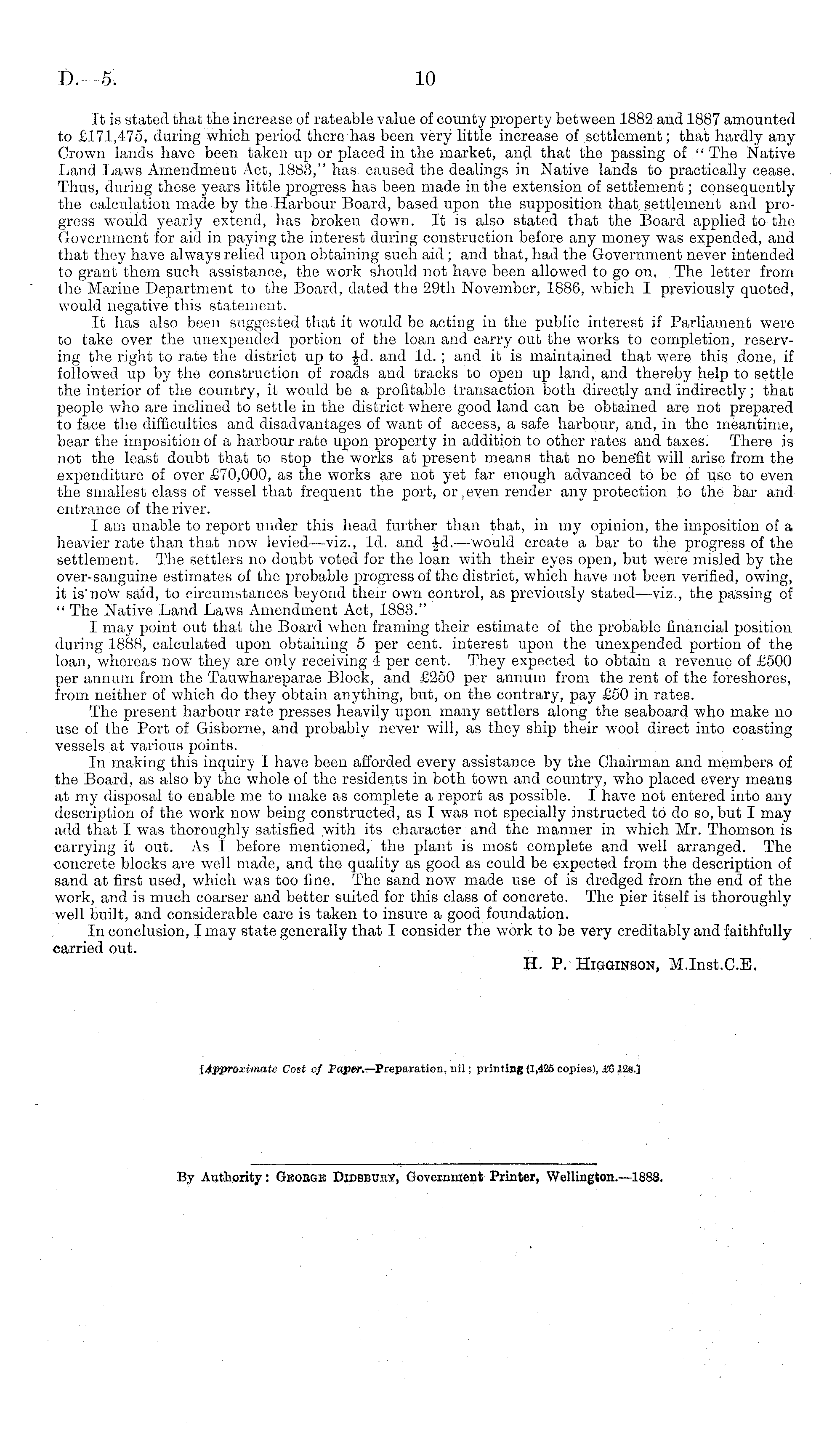 It is stated that the increase of rateable value of county property between 1882 and 1887 amounted to £171,475, during which period there has been very little increase of settlement; that hardly any Crown lands have been taken up or placed in the market, and that the passing of " The Native Land Laws Amendment Act, 1883," has caused the dealings in Native lands to practically cease. Thus, during these years little progress has been made in the extension of settlement; consequently the calculation made by the Harbour Board, based upon the supposition that settlement and progress would yearly extend, has broken down. It is also stated that the Board applied to the Government for aid in paying the interest during construction before any money was expended, and that they have always relied upon obtaining such aid ; and that, had the Government never intended to grant them such assistance, the work should not have been allowed to go on. The letter from the Marine Department to the Board, dated the 29th November, 1886, wdiich I previously quoted, would negative this statement. It has also been suggested that it would be acting in the public interest if Parliament were to take over the unexpended portion of the loan and carry out the works to completion, reserving the right to rate the district up to -J-d. and Id. ; and it is maintained that were this done, if followed up by the construction of roads and tracks to open up land, and thereby help to settle the interior of the country, it would be a profitable transaction both directly and indirectly; that people who are inclined to settle in the district where good land can be obtained are not prepared to face the difficulties and disadvantages of want of access, a safe harbour, and, in the meantime, bear the imposition of a harbour rate upon property in addition to other rates and taxes. There is not the least doubt that to stop the works at present means that no benefit will arise from the expenditure of over £70,000, as the works are not yet far enough advanced to bo of use to even the smallest class of vessel that frequent the port, or,even render any protection to the bar and entrance of the river. I am unable to report under this head further than that, in my opinion, the imposition of a heavier rate than that now levied—viz., Id. and -J-d. —would create a bar to the progress of the settlement. The settlers no doubt voted for the loan with their eyes open, but were misled by the over-sanguine estimates of the probable progress of the district, which have not been verified, owing, it is'no'w said, to circumstances beyond their own control, as previously stated —viz., the passing of " The Native Land Laws Amendment Act, 1883." I may point out that the Board when framing their estimate of the probable financial position during 1888, calculated upon obtaining 5 per cent, interest upon the unexpended portion of the loan, whereas now they are only receiving 4 per cent. They expected to obtain a revenue of £500 per annum from the Tauwhareparae Block, and £250 per annum from the rent of the foreshores, from neither of which do they obtain anything, but, on the contrary, pay £50 in rates. The present harbour rate presses heavily upon many settlers along the seaboard who make no use of the Port of Gisborne, and probably never will, as they ship their wool direct into coasting vessels at various points. In making this inquiry I have been afforded every assistance by the Chairman and members of the Board, as also by the whole of the residents in both town and country, who placed every means at my disposal to enable me to make as complete a report as possible. I have not entered into any description of the work now being constructed, as I was not specially instructed to do so, but I may add that I was thoroughly satisfied with its character and the manner in which Mr. Thomson is carrying it out. As I before mentioned, the plant is most complete and well arranged. The concrete blocks are well made, and the quality as good as could be expected from the description of sand at first used, which was too fine. The sand now made use of is dredged from the end of the work, and is much coarser and better suited for this class of concrete. The pier itself is thoroughly well built, and considerable care is taken to insure a good foundation. In conclusion, I may state generally that I consider the work to be very creditably and faithfully carried out. H. P. Higginson, M.lnst.C.E. [Approximate Cost of Paper. —Preparation, oil; printing (1,425 copies), ±'G 12s.]