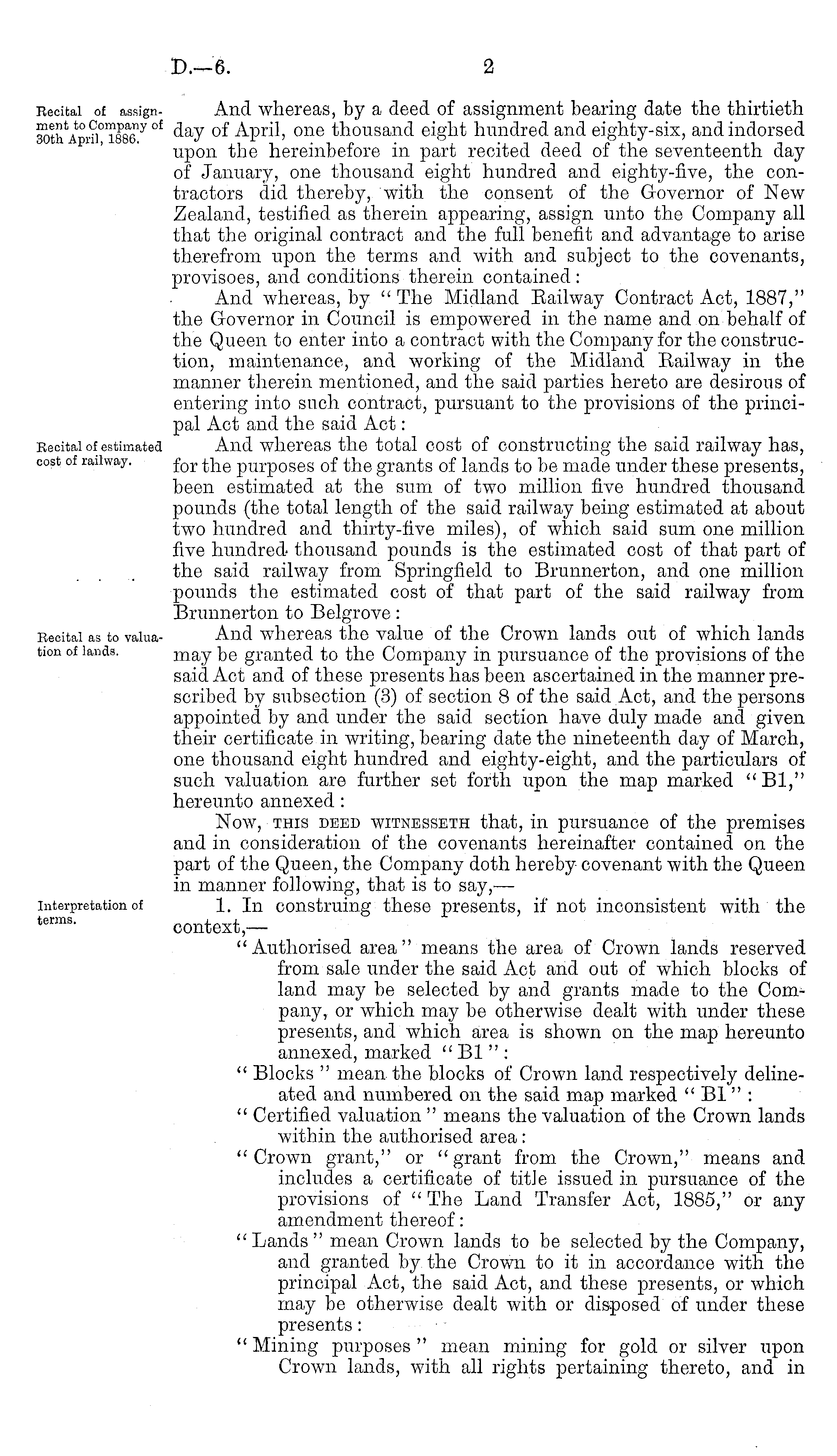 And whereas, by a deed of assignment bearing date the thirtieth day of April, one thousand eight hundred and eighty-six, and indorsed upon the hereinbefore in part recited deed of the seventeenth day of January, one thousand eight hundred and eighty-five, the contractors did thereby, with the consent of the Governor of New Zealand, testified as therein appearing, assign unto the Company all that the original contract and the full benefit and advantage to arise therefrom upon the terms and with and subject to the covenants, provisoes, and conditions therein contained: And whereas, by " The Midland Eailway Contract Act, 1887," the Governor in Council is empowered in the name and on behalf of the Queen to enter into a contract with the Company for the construction, maintenance, and working of the Midland Eailway in the manner therein mentioned, and the said parties hereto are desirous of entering into such contract, pursuant to the provisions of the principal Act and the said Act: And whereas the total cost of constructing the said railway has, for the purposes of the grants of lands to be made under these presents, been estimated at the sum of two million five hundred thousand pounds (the total length of the said railway being estimated at about two hundred and thirty-five miles), of which said sum one million five hundred thousand pounds is the estimated cost of that part of the said railway from Springfield to Brunnerton, and one million pounds the estimated cost of that part of the said railway from Brunnerton to Belgrove: And whereas the value of the Crown lands out of which lands may be granted to the Company in pursuance of the provisions of the said Act and of these presents has been ascertained in the manner prescribed by subsection (3) of section 8 of the said Act, and the persons appointed by and under the said section have duly made and given their certificate in writing, bearing date the nineteenth day of March, one thousand eight hundred and eighty-eight, and the particulars of such valuation are further set forth upon the map marked "Bl," hereunto annexed : Now, this deed witnesseth that, in pursuance of the premises and in consideration of the covenants hereinafter contained on the part of the Queen, the Company doth hereby covenant with the Queen in manner following, that is to say,— 1. In construing these presents, if not inconsistent with the context, — "Authorised area" means the area of Crown lands reserved from sale under the said Act and out of which blocks of land may be selected by and grants made to the Company, or which may be otherwise dealt with under these presents, and which area is shown on the map hereunto annexed, marked "Bl": " Blocks " mean the blocks of Crown land respectively delineated and numbered on the said map marked " Bl " : " Certified valuation " means the valuation of the Crown lands within the authorised area: "Crown grant," or "grant from the Crown," means and includes a certificate of title issued in pursuance of the provisions of " The Land Transfer Act, 1885," or any amendment thereof: "Lands" mean Crown lands to be selected by the Company, and granted by the Crown to it in accordance with the principal Act, the said Act, and these presents, or which may be otherwise dealt with or disposed of under these presents: " Mining purposes " mean mining for gold or silver upon Crown lands, with all rights pertaining thereto, and in