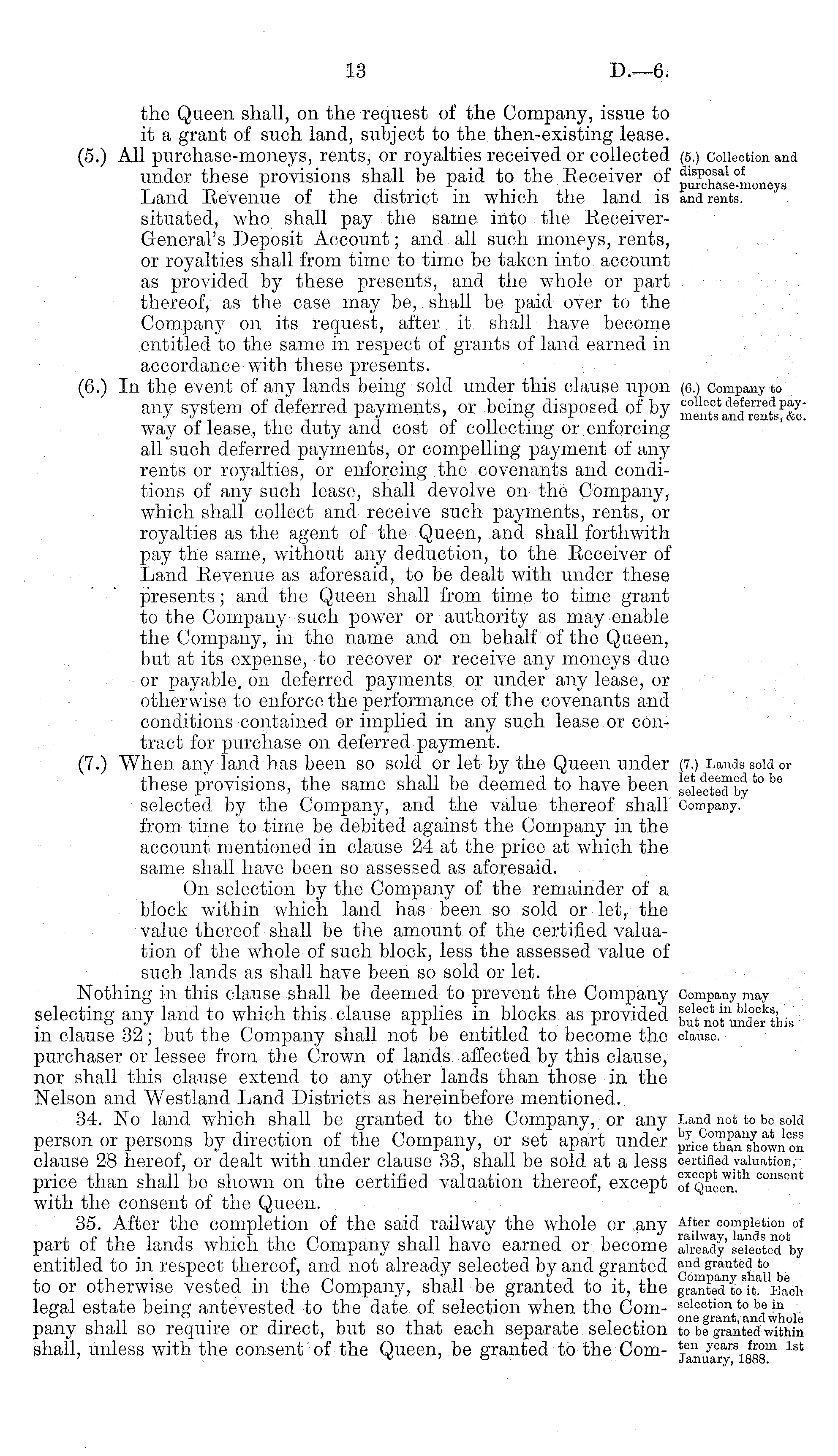 the Queen shall, on the request of the Company, issue to it a grant of such land, subject to the then-existing lease. (5.) All purchase-moneys, rents, or royalties received or collected under these provisions shall be paid to the Receiver of Land Revenue of the district in which the land, is situated, who shall pay the same into the ReceiverGeneral's Deposit Account; and all such moneys, rents, or royalties shall from time to time be taken into account as provided by these presents, and the whole or part thereof, as the case may be, shall be paid over to the Company on its request, after it shall have become entitled to the same in respect of grants of land earned in accordance with these presents. (6.) In the event of any lands being sold under this clause upon any system of deferred payments, or being disposed of by way of lease, the duty and cost of collecting or enforcing all such deferred payments, or compelling payment of any rents or royalties, or enforcing the covenants and conditions of any such lease, shall devolve on the Company, which shall collect and receive such payments, rents, or royalties as the agent of the Queen, and shall forthwith pay the same, without any deduction, to the Receiver of Land Revenue as aforesaid, to be dealt with under these presents; and the Queen shall from time to time grant to the Company such power or authority as may enable the Company, in the name and on behalf of the Queen, but at its expense, to recover or receive any moneys due or payable, on deferred payments or under any lease, or otherwise to enforce the performance of the covenants and conditions contained or implied in any such lease or contract for purchase on deferred payment. (7.) When any land has been so sold or let by the Queen under these provisions, the same shall be deemed to have been selected by the Company, and the value thereof shall from time to time be debited against the Company in the account mentioned in clause 24 at the price at which the same shall have been so assessed as aforesaid. On selection by the Company of the remainder of a block within which land has been so sold or let, the value thereof shall be the amount of the certified valuation of the whole of such block, less the assessed value of such lands as shall have been so sold or let. Nothing in this clause shall be deemed to prevent the Company selecting any land to which this clause applies in blocks as provided in clause 32; but the Company shall not be entitled to become the purchaser or lessee from the Crown of lands affected by this clause, nor shall this clause extend to any other lands than those in the Nelson and Westland Land Districts as hereinbefore mentioned. 34. No land which shall be granted to the Company, or any person or persons by direction of the Company, or set apart under clause 28 hereof, or dealt with under clause 33, shall be sold at a less price than shall be shown on the certified valuation thereof, except with the consent of the Queen. 35. After the completion of the said railway the w Thole or any part of the lands which the Company shall have earned or become entitled to in respect thereof, and not already selected by and granted to or otherwise vested in the Company, shall be granted to it, the legal estate being antevested to the date of selection when the Company shall so require or direct, but so that each separate selection shall, unless with the consent of the Queen, be granted to the Com-