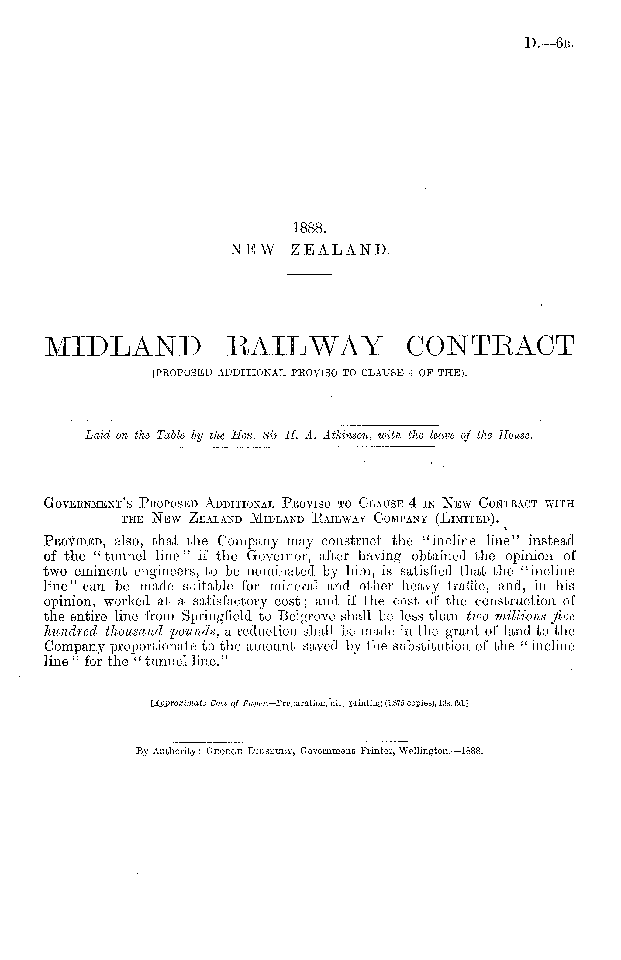 Government's Proposed Additional Peoviso to Clause 4 in New Contract with the New Zealand Midland Railway Company (Limited). Provided, also, that the Company may construct the "incline line" instead of the "tunnel line" if the Governor, after having obtained the opinion of two eminent engineers, to be nominated by him, is satisfied that the "incline line" can be made suitable for mineral and other heavy traffic, and, in his opinion, worked at a satisfactory cost; and if the cost of the construction of the entire line from Springfield to Belgrove shall be less than two millions five hundred thousand 'pounds, a reduction shall be made in the grant of land to the Company proportionate to the amount saved by the substitution of the " incline line " for the " tunnel line." [Approximate Cost of Paper. —Preparation, nil; printing (1,375 copies), V3a. 6d.j