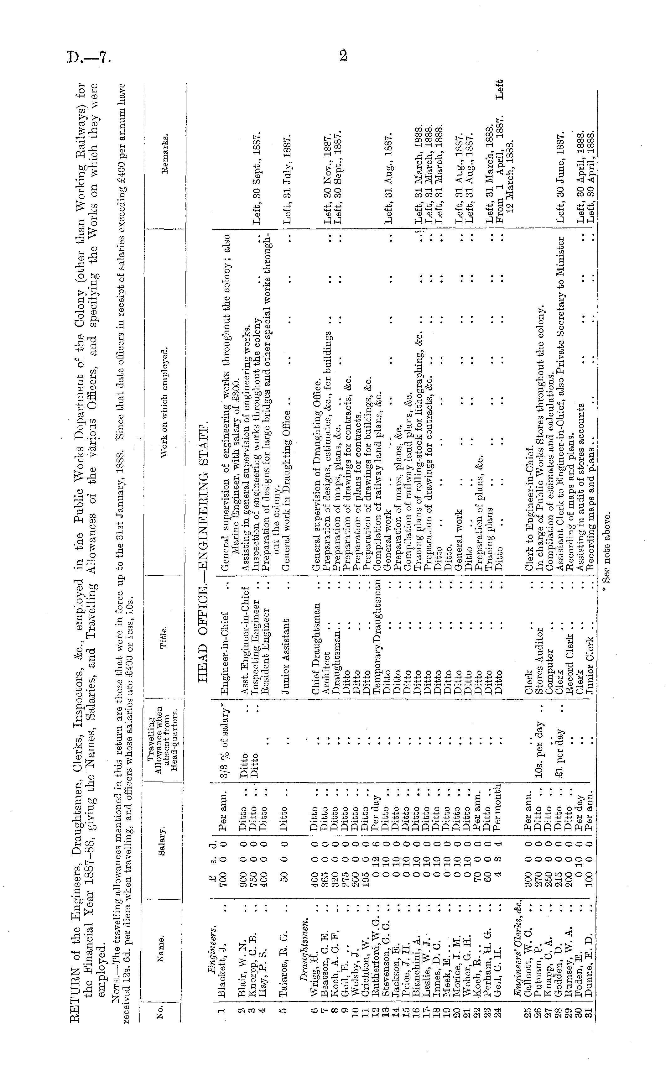 RETURN of the Engineers, Draughtsmen, Clerks, Inspectors, &c., employed in the Public Works Department of the Colony (other than Working Railways) for the Financial Year 1887-88, giving the Names, Salaries, and Travelling Allowances of the various Officers, and specifying the Works on which they were employed. Note —The travelling allowances mentioned in this return are those that were in force up to the 31st January, 1888. Since that date officers in receipt of salaries exceeding £400 per annum have received 12s. 6d. per diem when travelling, and officers whose salaries are £400 or less, 10s.
