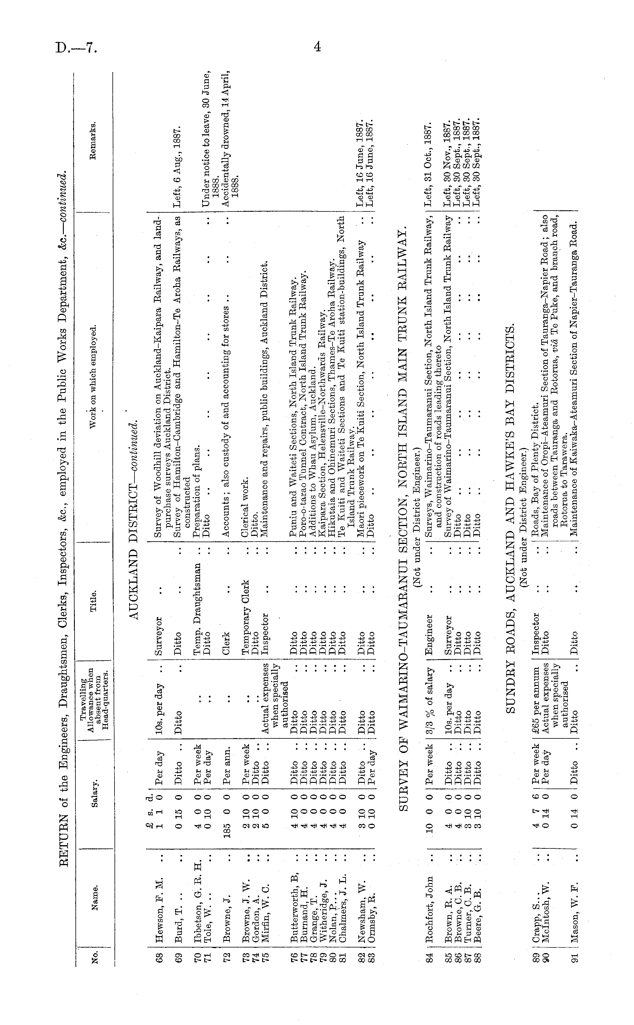 No. Name. Salary. Travelling Allowance when absent from Head-quarters. Title. Work on which employed. Remarks. AUCKLAND DISTRICT— continued. 68 Hewson, P. M. 69 Burd, T. .. 70 Ibbetson, G. R. H. 71 Tole, W. .. 72 Browne, J. £ s. d. 110 Per day 10s. per day .. Surveyor .. Survey of Woodhill deviation on Auckland-Kaipara Railway, and landpurchase surveys Auckland District. 0 15 0 Ditto .. Ditto .. Ditto .. .. Survey of Hamilton-Cambridge and Hamilton-Te Aroha Railways, as Left, 6 Aug., 1887. constructed 4 0 0 Per week .. Temp. Draughtsman .. Preparation of plans. 0 10 0 Per day .. Ditto .. Ditto .. .. .. .. .. .. .. .. Under notice to leave, 30 June. 1888. 185 0 0 Per ann. .. Clerk .. .. Accounts ; also custody of and accounting for stores .. .. .. Accidentally drowned, 14 April. 1888. 73 Browne, J. W. 74 Gordon, A. 75 Mirfin, W. C. 76 Butterworth, B, .. 77 Burnand, H. 78 Grange, T. 79 Witheridge, J. 80 Nolan, P... 81 Chalmers, J. L. 82 , Newsham, W. 83 Ormsby, R. 2 10 0 Per week .. Temporary Clerk .. Clerical work. 2 10 0 Ditto .. .. Ditto .. Ditto. 5 0 0 Ditto .. Actual expenses Inspector .. .. Maintenance and repairs, public buildings, Auckland District. when specially authorised 4 10 0 Ditto .. Ditto .. Ditto .. .. Puniu and Waiteti Sections, North Island Trunk Railway. 4 0 0 Ditto .. Ditto .. Ditto .. .. Poro-o-tarao Tunnel Contract, North Island Trunk Railway. 4 0 0 Ditto .. Ditto .. Ditto .. .. Additions to Wha'u Asylum, Auckland. 4 0 0 Ditto .. Ditto .. Ditto .. .. Kaipara Section, Helensville-Northwards Railway. 4 0 0 Ditto .. Ditto .. Ditto .. .. Hikutaia and Ohinemuri Sections, Thames-Te Aroha Railway. 4 0 0 Ditto .. Ditto .. Ditto .. .. Te Kuiti and Waiteti Sections and Te Kuiti station-buildings, North Island Trunk Railway. 3 10 0 Ditto .. Ditto .. Ditto .. .. Maori piecework on Te Kuiti Section, North Island Trunk Railway .. Left, 16 June, 1887. 0 10 0 Per day Ditto .. Ditto .. .. Ditto .. .. .. .. .. .. .. ' .. Left, 16 June, 1887. 84 Rochf ort, John 85 Brown, R. A. 86 Browne, C. B. 87 Turner, C. B. 88 Beere, G. B. SUEVEY OF WAIMAEINO-TAUMAEANUI SECTION, NOETH ISLAND MAIN TEUNK EAILWAY. (Not under District Engineer.) 10 0 0 Per week 3/3 % of salary Engineer .. .. Surveys, Waimarino-Taumaranui Section, North Island Trunk Railway, Left, 31 Oct., 1887. and construction of roads leading thereto 4 0 0 Ditto .. 10s. per day .. Surveyor .. .. Survey of Waimarino-Taumaranui Section, North Island Trunk Railway Left, 30 Nov., 1887. 4 0 0 Ditto .. Ditto .. Ditto .. .. Ditto .. .. .. .. .. .. .. .. Left, 30 Sept., 1887. 3 10 0 Ditto .. Ditto .. Ditto .. .. Ditto .. .. .. .. .. .. .. .. Left, 30 Sept., 1887. 3 10 0 Ditto .. Ditto .. Ditto .. .. Ditto .. .. .. .. .. .. .. .. Left, 30 Sept., 1887. 89 Crapp, S... 90 Mcintosh, W. 91 Mason, W. P. SUNDEY EOADS, AUCKLAND AND HAWKE'S BAY DISTRICTS. (Not under District Engineer.) 4 7 6 Per week £65 per annum Inspector .. .. Roads, Bay of Plenty District. 0 14 0 Per day Actual expenses Ditto .. .. Maintenance of Oropi-Ateamuri Section of Tauranga-Napier Road; also when specially roads between Tauranga and Rotorua, via Te Puke, and branch road, authorised Rotorua to Tarawera. 0 14 0 Ditto .. Ditto .. Ditto .. .. \ Maintenance of Kaiwaka-Ateamuri Section of Napier-Tauranga Road.