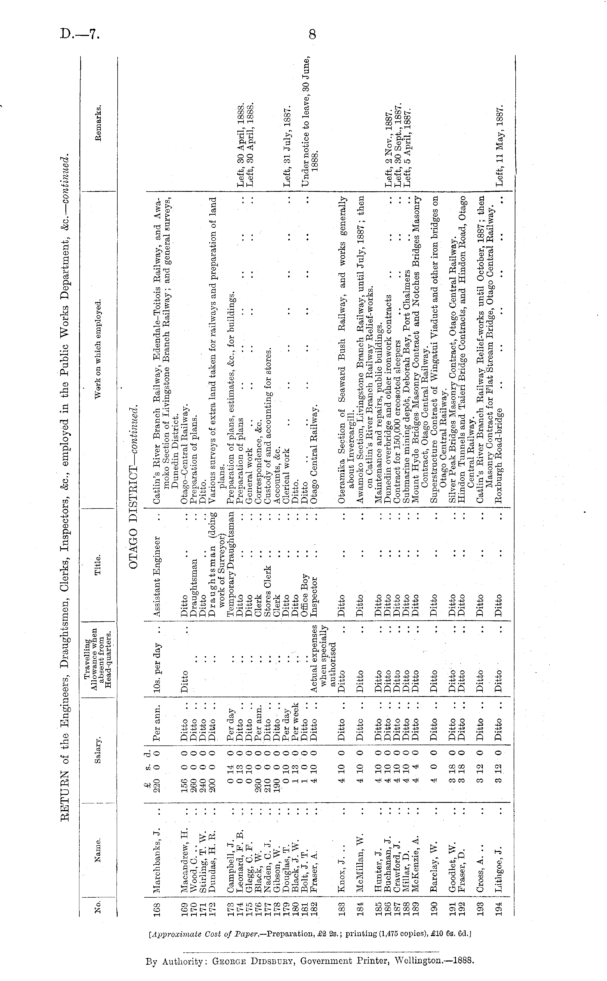 No. Name. Salary. Travelling Allowance when absent from Head-quarters. Title. Work on which employed. Remarks. OTAGO DI! 3TEICT— continued-. 108 Marchbanks, J. £ s. a. 220 0 0 Per ann. 10s. per day .. Assistant Engineer .. Catlin's River Branch Railway, Edendale-Toitois Railway, and Awamoko Section of Livingstone Branch Railway ; and general surveys, Dunedin District. Otago-Central Railway. Preparation of plans. Ditto. Various surveys of extra land taken for railways and preparation of land plans. Preparation of plans, estimates, &c, for buildings. Preparation of plans General work Correspondence, &c. Custody of and accounting for stores. Accounts, &c. Clerical work Ditto. Ditto Otago Central Railway. 169 170 171 172 Macandrew, H. Wood, G. .. Stirling, T. W. Dundas, H. R. 156 0 0 260 0 0 240 0 0 200 0 0 Ditto .. Ditto .. Ditto .. Ditto .. Ditto Ditto Draughtsman Ditto Draughtsman (doing work of Surveyor) Temporary Draughtsman Ditto Ditto Clerk Stores Clerk Clerk Ditto Ditto Office Boy Inspector 173 174 175 176 177 178 179 180 181 182 Campbell, J. Leonard, P. B. Glegg, G. P. Black, W. Naden, C. J. Gibson, W. Douglas, T. Black, J. W. Bolt, J. T. Praser, A. 0 14 0 0 13 0 0 10 0 200 0 0 210 0 0 190 0 0 0 10 0 1 13 0 10 0 4 10 0 Per dav Ditto .. Ditto .. Per ann. Ditto .. Ditto .. Per day Per week Ditto .. Ditto .. Left, 30 April, 1888. Left, 30 April, 1888. Left, 31 July, 1887. Actual expenses when specially authorised Ditto Under notice to leave, 30 Juin 1888. 183 Knox, J. .. 4 10 0 Ditto .. Ditto Oteramika Section of Seaward Bush Railway, and works generally about Invercargill. Awamoko Section, Livingstone Branch Railway, until July, 1887 ; then on Catlin's River Branch Railway Relief-works. Maintenance and repairs, public buildings. Dunedin overbridge and other ironwork contracts Contract for 150,000 creosoted sleepers Submarine mining depot, Deborah Bay, Port Chalmers Mount Hyde Bridges Masonry Contract and Notches Bridges Masonry Contract, Otago Central Railway. Superstructure Contract of Wingatui Viaduct and other iron bridges on Otago Central Railway. Silver Peak Bridges Masonry Contract, Otago Central Railway. Hindon Tunnels and Taieri Bridge Contracts, and Hindon Road, Otago Central Railway. Catlin's River Branch Railway Relief-works until October, 1887; then Masonry Contract for Plat Stream Bridge, Otago Central Railway. Roxburgh Road-bridge 184 McMillan, W. 4 10 0 Ditto .. Ditto Ditto Left, 2 Nov., 1887. Left, 30 Sept., 1887. Left, 5 April, 1887. 185 186 187 188 189 Hunter, J. Buchanan, J. Crawford, J. Millar, D. McKenzie, A. 4 10 0 4 10 0 4 10 0 4 10 0 4 4 0 Ditto .. Ditto .. Ditto .. Ditto .. Ditto .. Ditto Ditto Ditto Ditto Ditto Ditto Ditto Ditto Ditto Ditto 190 Barclay, W. 4 0 0 Ditto .. Ditto Ditto 191 192 Goodlet, W. Fraser, D. 3 18 0 3 18 0 Ditto .. Ditto .. Ditto Ditto Ditto Ditto Left, 11 May, 1887. 193 Cross, A. .. 3 12 0 Ditto .. Ditto Ditto 194 Lithgoe, J. 3 12 0 Ditto .. Ditto Ditto
