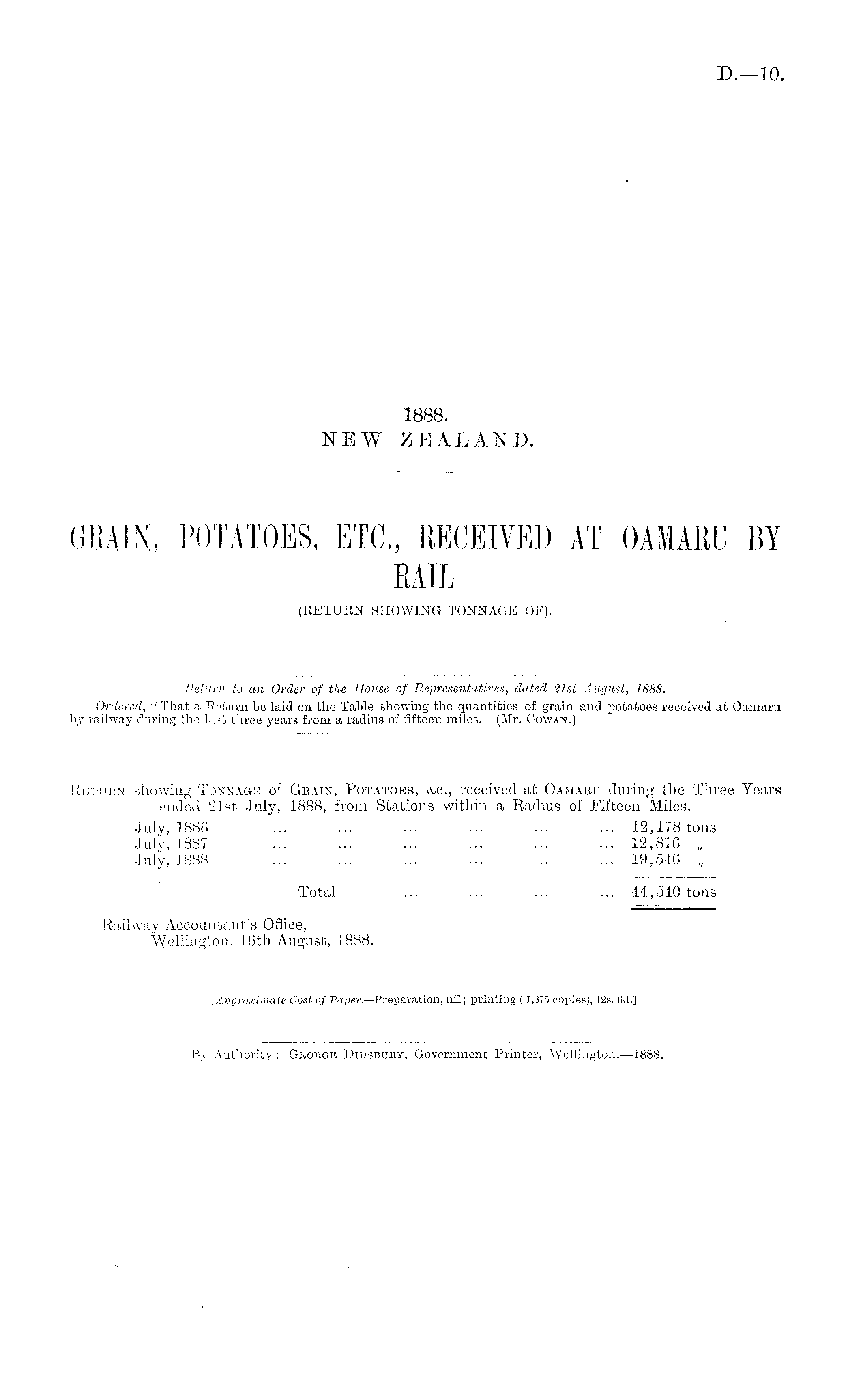 Return showing Tonnage of Gbain, Potatoes, &c, received at Oamaeu during the Three Years ended 21st July, 1888, from Stations within a Radius of Fifteen Miles. July, 1886 ... ... ... ... ... ... 12,178 tons July, 1887 ... ... ... ... ... ... 12,816 „ July, 1888 ... ... ... ... ... ... 19,546 „ Total ... ... ... ... 44,540 tons Railway Accountant's Office, Wellington, 16th August, 1883. I Approximate Cost of Paper.— Preparation, nil; printing (1,375 copies), 12s. 6d.]