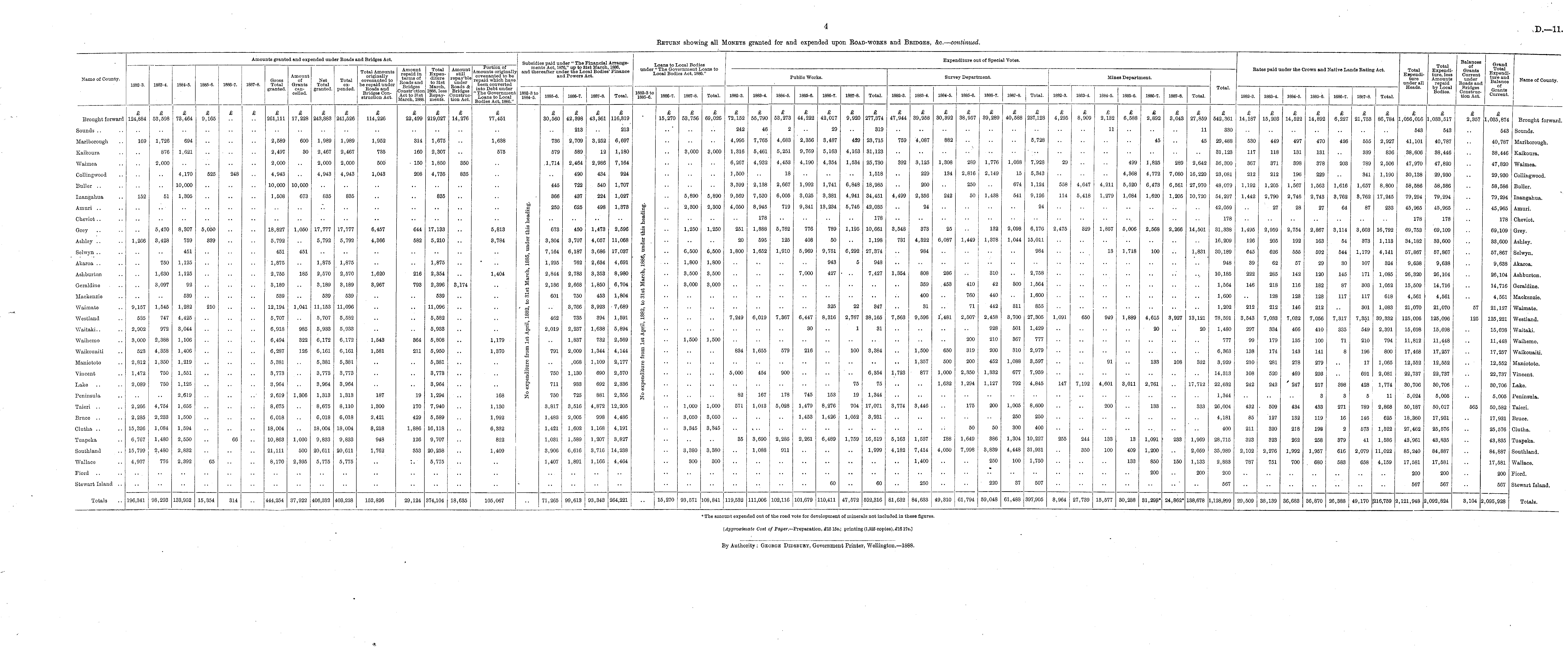 Namo of County. 1332-3. 1883-1. 1881-5, Total Amounts Amount originally Gross of Net Total covenanted to 1887-8. Total Grants Total ex- be repaid under granted. can- granted, ponded. Roads and celled. Bridges Construction Act. Amounts granted and expended under Roads and Bridges Act. Amount repaid in torms of Roads and Bridges Act to 31st March, 1888, Total Expenditure to 31sfc March, 1888, less Eepayments. Amount still repay'ble under Roads & Bridges Construction Act. I Portion of Amounts originally covenanted to be repaid which have been converted into Debt under I" The Government j Loans to Local I Bodies Act, 1886." Subsidies paid under " The Financial Arrangements Act, 1876," up to 3ist March, 1886, and tlu.'rc;aia.r un ior the Local Bodies' Financo and Powers Act. Loans to Local Bodies under "The (.ov, i ninciit Loans to Local Bodies Act, 1886." Public Works. Expenditure out of Special Votes. Survey Department. Mines Department. i 7 Balances n , Total of urand Kates paid under the Crown and Native Lands Eating Act. Total Expendi- Grants Total Expend!- ture, less Current Expendiun£ e an A^pS S SMX Name of County. i : ; ' Heads. by Local Kridges r , ot . Bodies. Construe- grants 3. 1883-1. 1881-5. 1885-6. 1686-7. 1867-8. Total. tion Act. ""rent. _J I 1885-6. 1886-7. 1 18M^ 0 18*5-6. 1886-7. 1887-8. Total. 1883-3 to ,„„„ 1885-6. 1886-7. 1887-8. Total. 1882-3. 1883-4. 1881 5. lfiSj 0. 18S6-7. 1837-8. Total. 1 ' ' 1882-3. 1683-1. 1884-5. 1885-6. , 1886-7. 1887-8. j Total. 1882-3. i 1883-4. j 1881-5. 1885-6. 1886-7. 1887-8. Total. Total. 1883-4. 1884-5. 1885-6. Brought forward £ 124,884 £ 53,598 £ 73,464 £ 9,165 £ £ £ 261,111 £ 17,228 £ 243,883 £ 241,526 £ 114,226 £ 22,499 £ 219,027 £ 14,276 £ 77,451 £ 30,560 £ 42,398 fl 43,361 £ 116,319 213 £ 15,270 £ 53,756 £ 69,026 £ 72,152 £ 55,790 £ 53,273 £ 44,222 £ 42,017 £ 9,920 £ 277,374 £ 47,944 £ 39,958 £ 30,392 £ 38,957 £ 39,289 £ 40,588 £ 237,128 £ 4,295 £ 8,909 £ 2,132 £ 6,588 £ 2,892 £ 3,043 £ 27,859 £ 542,361 £ 14,187 £ 15,203 £ 14,522 £ 14,892 £ 6,227 £ 21,753 £ 86,784 £ 1,056,016 £ 1,033,517 £ 2,357 £ 1,035,874 Brought forward. Sounds 213 242 46 7,765 2 29 319 11 11 330 543 543 543 Sounds. Marlborough 169 1,726 694 2,589 600 1,989 1,989 1,952 314 1,675 1,638 736 2,709 3,252 6,697 4,995 4,683 2,356 3,487 429 28,715 759 4,087 882 6,728 45 45 29,488 530 449 497 470 426 555 2,927 41,101 40,787 40,787 Marlborough. Kaikoura 876 1,621 2,497 30 2,467 2,467 735 160 2,307 575 579 589 12 1,180 3,000 3,000 1,316 5,461 5,251 9,769 5,163 4,163 31,123 31,123 117 118 131 131 339 836 38,606 38,446 38,446 Kaikoura. Waimea 2,000 2,000 2,000 2,000 500 150 1,850 350 1,714 2,464 2,986 7,164 6,267 4,932 4,453 4,190 4,354 1,534 25,730 392 3,125 1,308 289 1,770 1,038 7,928 29 499 1,825 289 2,642 36,300 867 371 398 378 203 789 2,500 47,970 47,820 47,820 Waimea. Collingwood 4,170 525 248 4,943 4,943 4,943 1,043 208 4,735 835 490 434 924 1,500 18 1,518 229 134 2,816 i 2,149 15 5,343 4,368 4,772 7,080 16,220 23,081 212 212 196 1,567 229 341 1,190 30,138 29,930 29,930 Collingwood. Buller 10,000 10,000 10,000 445 722 540 1,707 3,599 2,138 2,667 1,992 1,741 6,848 18,985 200 250 674 1,124 558 4,647 4,211 5,520 6,473 6,561 27,970 48,079 1,192 1,205 1,563 1,616 1,657 8,800 58,586 58,586 58,586 Buller. Inangahua 152 51 1,305 1,508 673 835 835 835 366 437 224 1,027 5,890 5,890 9,569 7,530 6,005 3,025 3,381 4,941 34,451 4,499 2,356 242 50 ; 1,438 541 9,126 114 5,418 1,279 1,084 1,020 1,205 10,720 54,297 1,442 2,790 2,746 2,743 3,762 3,762 17,245 79,294 79,294 79,294 Inangahua. Amuri fa a id 1 re! 1 T-i I CO a 1 M g I 1 I o 250 625 498 1,373 t c3 A I I - a a id" CO CO fSJ" CO I I—t I s a Oh O J 2,300 2,300 4,050 8,945 719 9,341 13,234 5,746 42,035 24 24 42,059 27 28 27 64 87 233 45,965 45,965 45,905 Amuri. Cheviot 178 178 178 178 178 178 Clieviot. Grey 5,470 8,307 5,050 18,827 1,050 17,777 17,777 6,457 644 17,133 5,813 073 450 1,473 2,596 ! 1,250 1,250 251 1,888 5,762 776 789 1,195 10,661 3,548 373 25 132 2,098 6,176 2,475 329 1,857 6,006 2,568 2,266 14,501 31,338 1,495 2,959 2,754 2,867 3,114 3,603 16,792 69,753 69,109 09,109 Grey. Ashley .. 1,266 3,428 759 339 5,792 5,702 5,792 4,366 582 5,210 3,784 8,304 3,707 4,057 11,068 20 595 125 408 50 1,198 731 4,322 6,087 1,449 1,378 i 1,044 15,011 16,209 126 205 192 163 54 373 1,113 34,182 33,600 83,600 Ashley. Selwyn 451 451 451 7,164 6,187 3,686 17,037 6,500 6,500 1,800 1,652 1,910 5,969 9,751 6,292 27,374 984 I 084 13 1,718 100 1,831 30,189 645 626 555 692 544 1,179 4,141 57,867 57,867 57,867 Selwyn. Akaroa 750 1,125 1,875 1,875 1,875 1,875 1,295 762 2,634 4,691 1,800 1,800 943 5 948 948 39 62 29 30 107 324 9,638 9,638 9,638 Akaroa. Ashburton 1,030 1,125 2,755 185 2,570 2,570 1,620 216 2,354 1,404 2,844 2,783 3,353 8,980 3,500 3,500 7,000 427 7,427 1,354 808 286 310 2,758 10,185 222 285 142 120 145 171 1,085 26,320 26,104 26,104 Ashburton. Geraldine 3,097 92 3,189 3,189 3,189 3,967 793 2,396 3,174 2,186 2,668 1,850 6,704 3,000 3,000 359 453 410 42 300 1,564 1,564 146 218 116 182 87 303 1,052 15,509 14,716 14,716 Geraldino. Mackenzie 539 539 539 539 539 601 750 453 1,804 400 760 440 1,600 1,600 128 128 128 117 117 618 4,561 4,561 4,561 Mackenzie. Waimate 9,157 1,545 1,282 210 12,194 1,041 11,153 11,096 11,096 3,766 3,923 7,689 325 22 347 31 71 442 311 855 I 1,202 212 212 146 212 301 1,083 21,070 21,070 57 21,127 Waimate. I Westland 535 747 4,425 5,707 5,707 5,532 5,582 462 735 394 1,591 7,249 6,019 7,367 6,447 8,316 2,767 38,165 7,563 9,596 1,481 2,507 2,458 3,700 27,305 1,091 650 949 1,889 4,615 3,927 13,121 78,591 3,543 7,033 7,032 7,056 7,317 7,351 39,332 125,096 125,096 125 125,221 Westland. Waitaki.. 2,902 972 3,044 6,913 985 5,933 5,933 5,933 2,019 2,237 1,638 5,894 30 1 31 928 501 1,429 20 20 1,480 297 334 466 410 335 549 2,391 15,698 15,698 15,698 Waitaki. Waihemo 3,000 1,106 6,494 322 6,172 6,172 1,543 364 5,808 1,179 1,837 732 2,509 1,500 1,500 200 210 367 