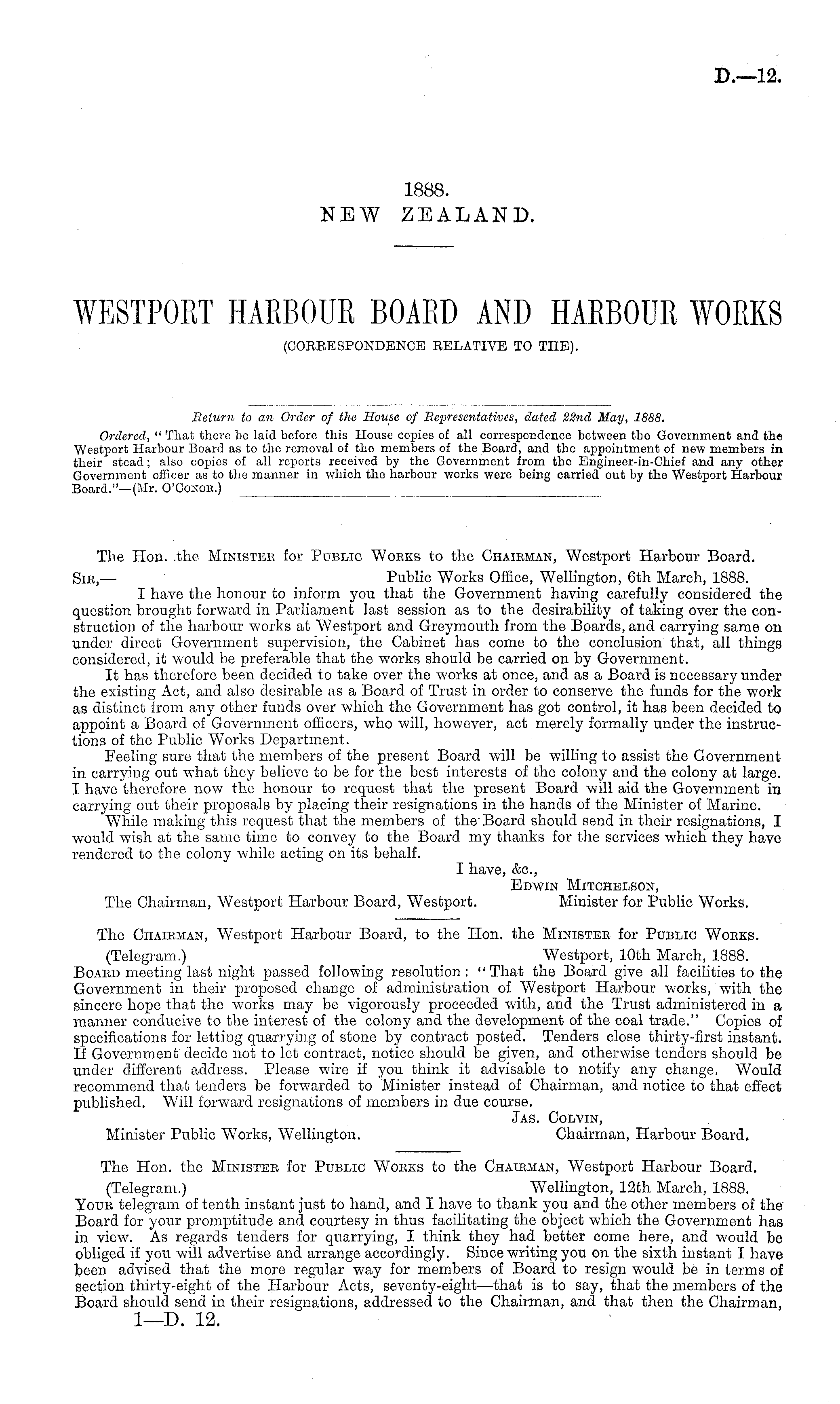 The Hon. .the Ministee for Public Wobks to the Chaieman, Westport Harbour Board. Sib,— Public Works Office, Wellington, 6th March, 1888. I have the honour to inform you that the Government having carefully considered the question brought forward in Parliament last session as to the desirability of taking over the construction of the harbour works at Westport and Greymouth from the Boards, and carrying same on under direct Government supervision, the Cabinet has come to the conclusion that, all things considered, it would be preferable that the works should be carried on by Government. It has therefore been decided to take over the works at once, and as a Board is necessary under the existing Act, and also desirable as a Board of Trust in order to conserve the funds for the work as distinct from any other funds over which the Government has got control, it has been decided to appoint a Board of Government officers, who will, however, act merely formally under the instructions of the Public Works Department. Feeling sure that the members of the present Board will be willing to assist the Government in carrying out what they believe to be for the best interests of the colony and the colony at large. I have therefore now the honour to request that the present Board will aid the Government in carrying out their proposals by placing their resignations in the hands of the Minister of Marine. While making this request that the members of the' Board should send in their resignations, I would w rish at the same time to convey to the Board my thanks for the services which they have rendered to the colony while acting on its behalf. I have, &c, Edwin Mitchelson, The Chairman, Westport Harbour Board, Westport. Minister for Public Works.