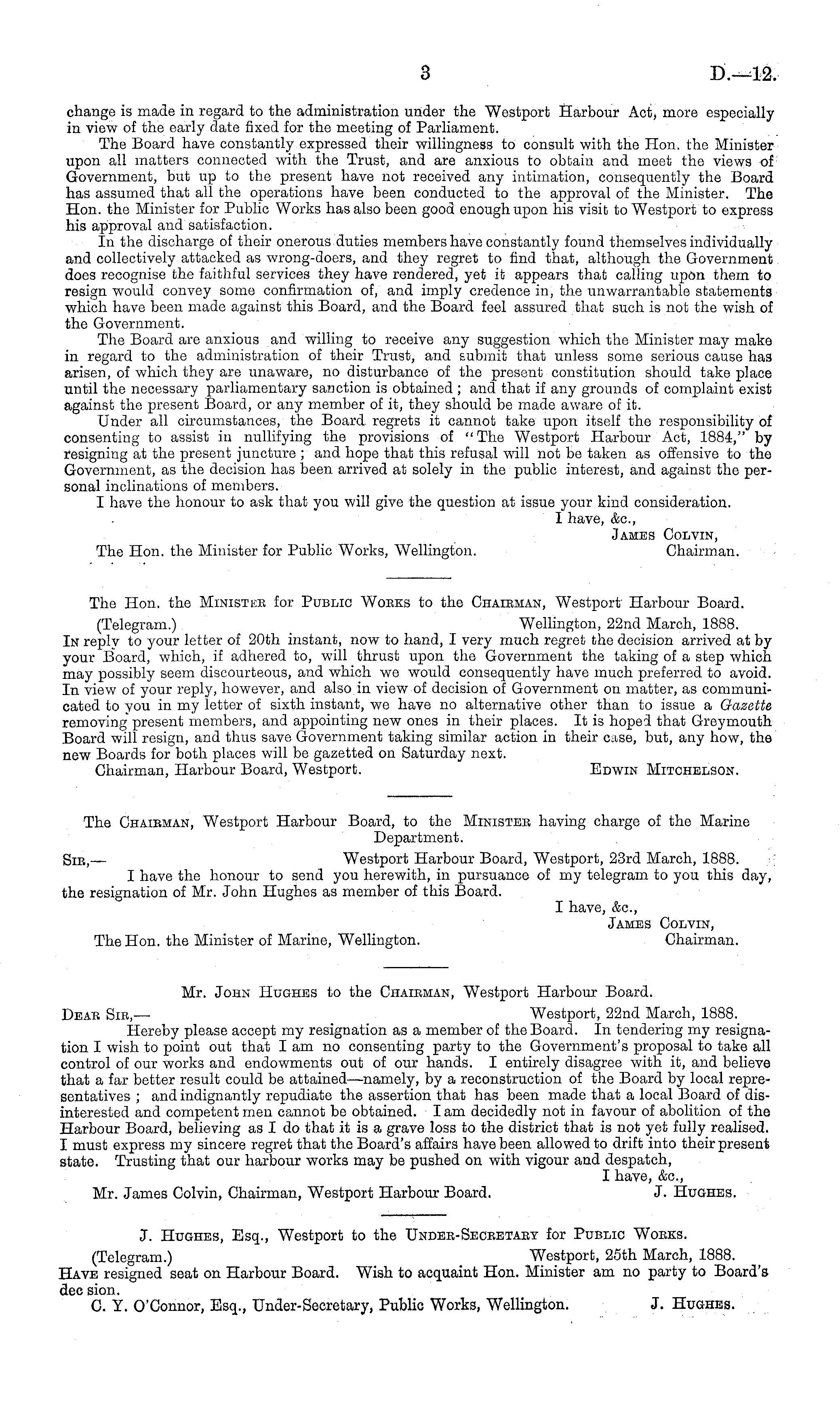 change is made in regard to the administration under the Westport Harbour Act, more especially in view of the early date fixed for the meeting of Parliament. The Board have constantly expressed their willingness to consult with the Hon. the Minister upon all matters connected with the Trust, and are anxious to obtain and meet the views of Government, but up to the present have not received any intimation, consequently the Board has assumed that all the operations have been conducted to the approval of the Minister. The Hon. the Minister for Public Works has also been good enough upon his visit to Westport to express his approval and satisfaction. In the discharge of their onerous duties members have constantly found themselves individually and collectively attacked as wrong-doers, and they regret to find that, although the Government does recognise the faithful services they have rendered, yet it appears that calling upon them to resign would convey some confirmation of, and imply credence in, the unwarrantable statements which have been made against this Board, and the Board feel assured that such is not the wish of the Government. The Board are anxious and willing to receive any suggestion which the Minister may make in regard to the administration of their Trust, and submit that unless some serious cause has arisen, of which they are unaware, no disturbance of the present constitution should take place until the necessary parliamentary sanction is obtained ; and that if any grounds of complaint exist against the present Board, or any member of it, they should be made aware of it. Under all circumstances, the Board regrets it cannot take upon itself the responsibility of consenting to assist in nullifying the provisions of "The Westport Harbour Act, 1884," by resigning at the present juncture ; and hope that this refusal will not be taken as offensive to the Government, as the decision has been arrived at solely in the public interest, and against the personal inclinations of members. I have the honour to ask that you will give the question at issue your kind consideration. I have, &c, James Colvin, The Hon. the Minister for Public Works, Wellington. Chairman.