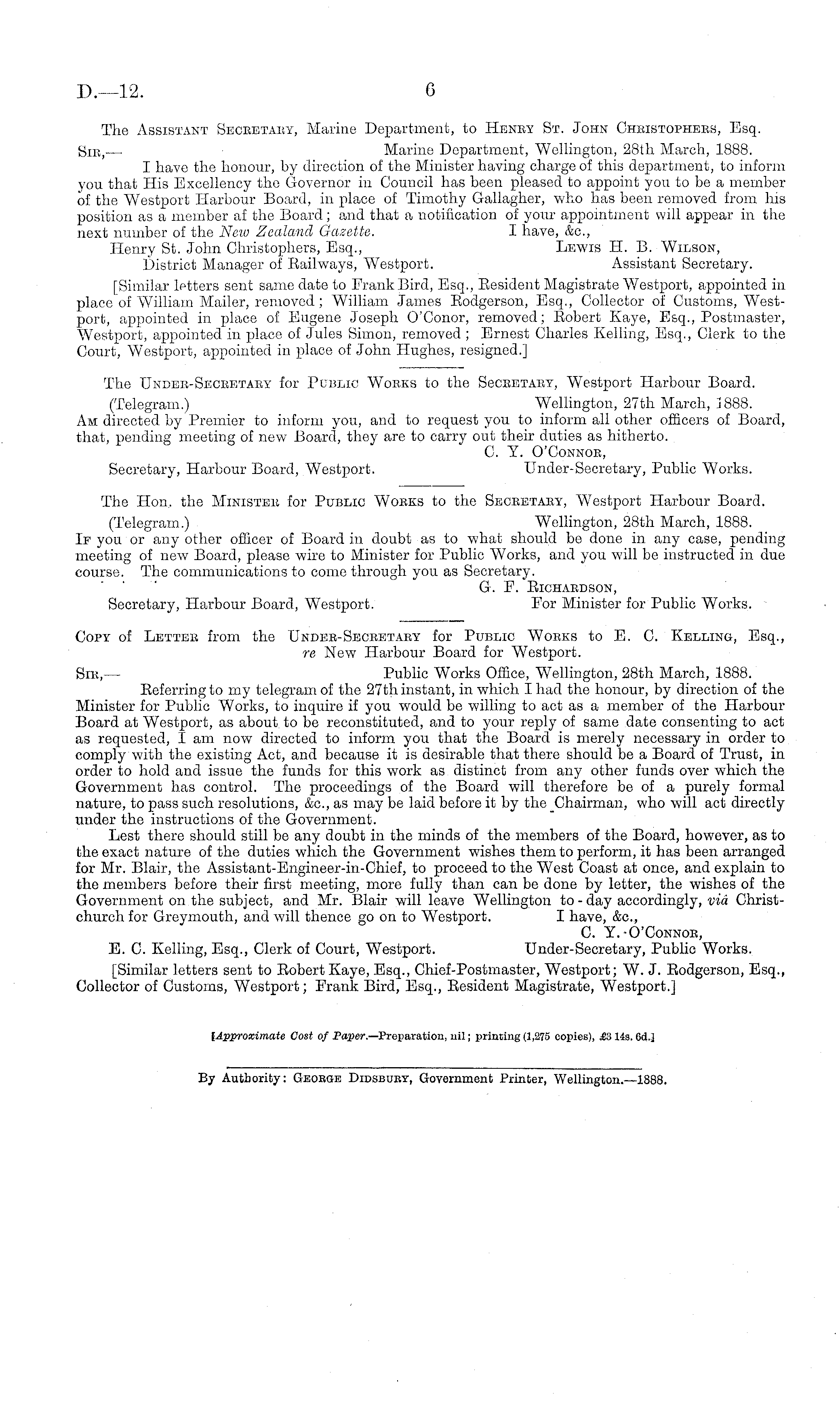 Copt of Letteh from the Undeb-Secbetaby for Public Woees to E. C. Helling, Esq., re New Harbour Board for Westport. Sin,— Public Works Office, Wellington, 28th March, 1888. Beferringto my telegram of the 27th instant, in which I had the honour, by direction of the Minister for Public Works, to inquire if you would be -willing to act as a member of the Harbour Board at Westport, as about to be reconstituted, and to your reply of same date consenting to act as requested, I am now directed to inform you that the Board is merely necessary in order to comply with the existing Act, and because it is desirable that there should be a Board of Trust, in order to hold and issue the funds for this work as distinct from any other funds over which the Government has control. The proceedings of the Board will therefore be of a purely formal nature, to pass such resolutions, &c, as may be laid before it by the _Chairman, who will act directly under the instructions of the Government. Lest there should still be any doubt in the minds of the members of the Board, however, as to the exact nature of the duties which the Government wishes them to perform, it has been arranged for Mr. Blair, the Assistant-Engineer-in-Chief, to proceed to the West Coast at once, and explain to the members before their first meeting, more fully than can be done by letter, the wishes of the Government on the subject, and Mr. Blair will leave Wellington to - day accordingly, via Christchurch for Greymouth, and will thence go on to Westport. I have, &c, C. Y. O'Connoe, E. C. Selling, Esq., Clerk of Court, Westport. Under-Secretary, Public Works. [Similar letters sent to Eobert Kaye, Esq., Chief-Postmaster, Westport; W. J. Eodgerson, Esq., Collector of Customs, Westport; Frank Bird, Esq., Eesident Magistrate, Westport.] lApproximate Cost of Paper.—Preparation, nil; printing (1,275 copies), £3 14s. 6d.]
