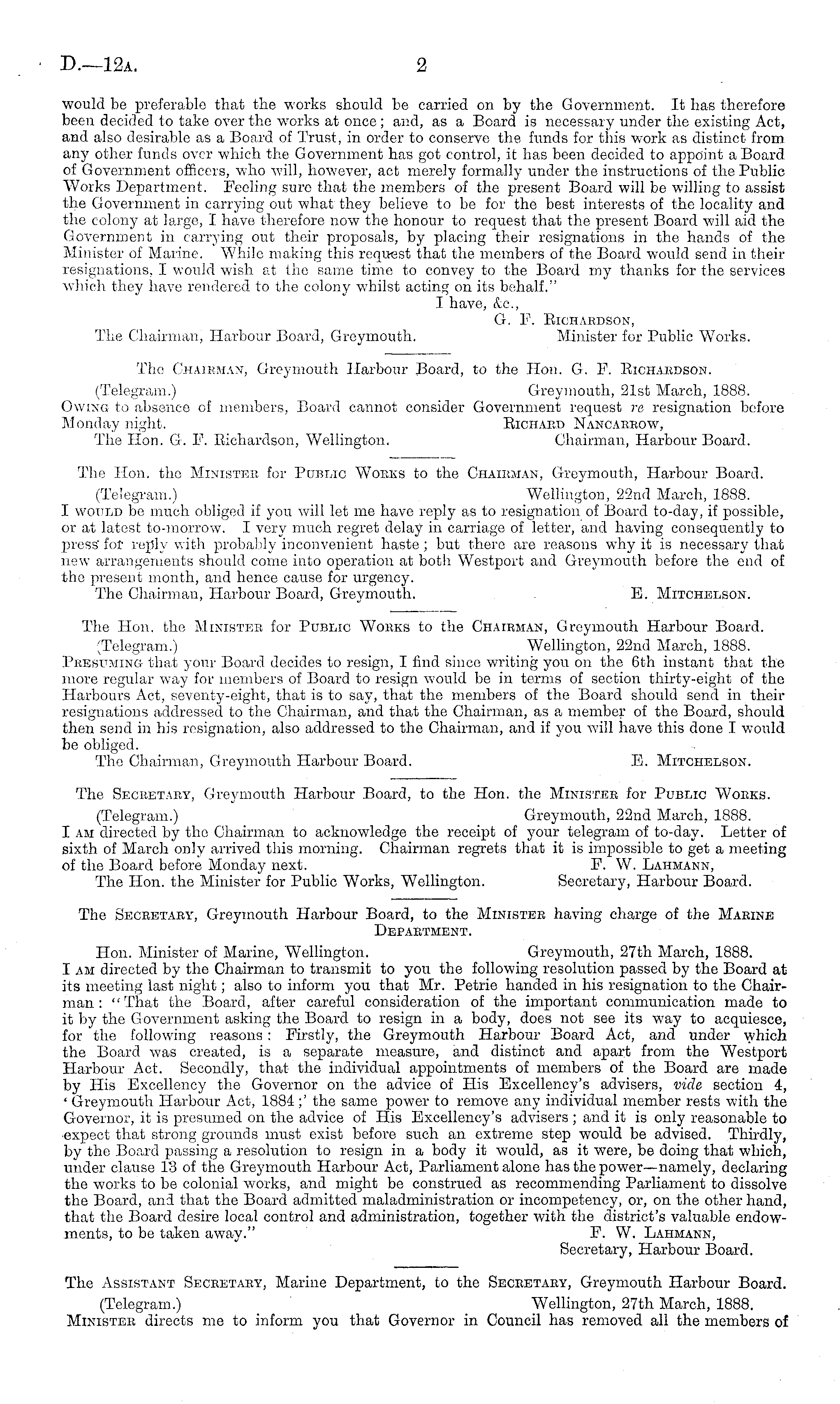 would be preferable that the works should be carried on by the Government. It has therefore been decided to take over the works at once; and, as a Board is necessary under the existing Act, and also desirable as a Board of Trust, in order to conserve the funds for this work as distinct from any other funds over which the Government has got control, it has been decided to appoint a Board of Government officers, who will, however, act merely formally under the instructions of the Public Works Department. Feeling sure that the members of the present Board will be willing to assist the Government in carrying out what they believe to be for the best interests of the locality and the colony at large, I have therefore now the honour to request that the present Board will aid the Government in carrying out their proposals, by placing their resignations in the hands of the Minister of Marine. While making this request that the members of the Board would send in their resignations, I would wish at the same time to convey to the Board my thanks for the services which they have rendered to the colony whilst acting on its behalf." I have, &c, G. F. Richabdson, The Chairman, Harbour Board, Greymouth. Minister for Public Works.